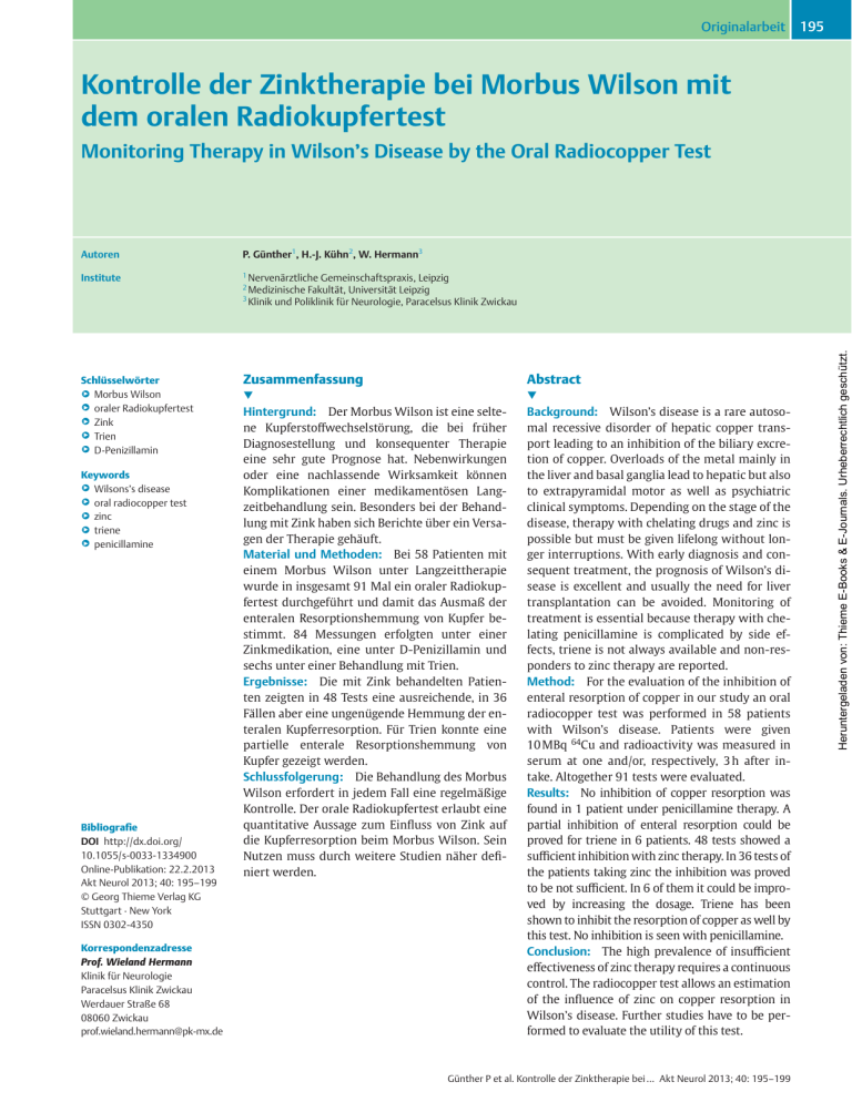 Originalarbeit 195 Kontrolle der Zinktherapie bei Morbus Wilson mit dem oralen Radiokupfertest Monitoring Therapy in Wilson’s Disease by the Oral Radiocopper Test Institute Schlüsselwörter ▶ Morbus Wilson ● ▶ oraler Radiokupfertest ● ▶ Zink ● ▶ Trien ● ▶ D-Penizillamin ● Keywords ▶ Wilsons’s disease ● ▶ oral radiocopper test ● ▶ zinc ● ▶ triene ● ▶ penicillamine ● Bibliografie DOI http://dx.doi.org/ 10.1055/s-0033-1334900 Online-Publikation: 22.2.2013 Akt Neurol 2013; 40: 195–199 © Georg Thieme Verlag KG Stuttgart · New York ISSN 0302-4350 Korrespondenzadresse Prof. Wieland Hermann Klinik für Neurologie Paracelsus Klinik Zwickau Werdauer Straße 68 08060 Zwickau [email protected] P. Günther1, H.-J. Kühn2, W. Hermann3 1 Nervenärztliche Gemeinschaftspraxis, Leipzig Medizinische Fakultät, Universität Leipzig 3 Klinik und Poliklinik für Neurologie, Paracelsus Klinik Zwickau 2 Zusammenfassung Abstract ▼ ▼ Hintergrund: Der Morbus Wilson ist eine seltene Kupferstoffwechselstörung, die bei früher Diagnosestellung und konsequenter Therapie eine sehr gute Prognose hat. Nebenwirkungen oder eine nachlassende Wirksamkeit können Komplikationen einer medikamentösen Langzeitbehandlung sein. Besonders bei der Behandlung mit Zink haben sich Berichte über ein Versagen der Therapie gehäuft. Material und Methoden: Bei 58 Patienten mit einem Morbus Wilson unter Langzeittherapie wurde in insgesamt 91 Mal ein oraler Radiokupfertest durchgeführt und damit das Ausmaß der enteralen Resorptionshemmung von Kupfer bestimmt. 84 Messungen erfolgten unter einer Zinkmedikation, eine unter D-Penizillamin und sechs unter einer Behandlung mit Trien. Ergebnisse: Die mit Zink behandelten Patienten zeigten in 48 Tests eine ausreichende, in 36 Fällen aber eine ungenügende Hemmung der enteralen Kupferresorption. Für Trien konnte eine partielle enterale Resorptionshemmung von Kupfer gezeigt werden. Schlussfolgerung: Die Behandlung des Morbus Wilson erfordert in jedem Fall eine regelmäßige Kontrolle. Der orale Radiokupfertest erlaubt eine quantitative Aussage zum Einfluss von Zink auf die Kupferresorption beim Morbus Wilson. Sein Nutzen muss durch weitere Studien näher definiert werden. Background: Wilson’s disease is a rare autosomal recessive disorder of hepatic copper transport leading to an inhibition of the biliary excretion of copper. Overloads of the metal mainly in the liver and basal ganglia lead to hepatic but also to extrapyramidal motor as well as psychiatric clinical symptoms. Depending on the stage of the disease, therapy with chelating drugs and zinc is possible but must be given lifelong without longer interruptions. With early diagnosis and consequent treatment, the prognosis of Wilson’s disease is excellent and usually the need for liver transplantation can be avoided. Monitoring of treatment is essential because therapy with chelating penicillamine is complicated by side effects, triene is not always available and non-responders to zinc therapy are reported. Method: For the evaluation of the inhibition of enteral resorption of copper in our study an oral radiocopper test was performed in 58 patients with Wilson’s disease. Patients were given 10 MBq 64Cu and radioactivity was measured in serum at one and/or, respectively, 3 h after intake. Altogether 91 tests were evaluated. Results: No inhibition of copper resorption was found in 1 patient under penicillamine therapy. A partial inhibition of enteral resorption could be proved for triene in 6 patients. 48 tests showed a sufficient inhibition with zinc therapy. In 36 tests of the patients taking zinc the inhibition was proved to be not sufficient. In 6 of them it could be improved by increasing the dosage. Triene has been shown to inhibit the resorption of copper as well by this test. No inhibition is seen with penicillamine. Conclusion: The high prevalence of insufficient effectiveness of zinc therapy requires a continuous control. The radiocopper test allows an estimation of the influence of zinc on copper resorption in Wilsonʼs disease. Further studies have to be performed to evaluate the utility of this test. Günther P et al. Kontrolle der Zinktherapie bei … Akt Neurol 2013; 40: 195–199 Heruntergeladen von: Thieme E-Books & E-Journals. Urheberrechtlich geschützt. Autoren Originalarbeit Hintergrund ▼ Der Morbus Wilson wird von einer autosomal-rezessiven Störung des hepatischen Kupfertransportes verursacht, die zu einer biliären Exkretionshemmung von Kupfer führt [1]. Von der toxischen Kupferakkumulation sind vorrangig Leber und Basalganglien betroffen, weshalb die Erkrankung früher auch als hepatolentikuläre Degeneration bezeichnet wurde [2]. Die Symptomatik variiert in hohem Maße und hat nach dem führenden Schädigungsbild zur Unterscheidung in nicht-neurologische und neurologische Verlaufstypen geführt [3]. Eine rechtzeitige Diagnose und suffiziente Therapie bewirkt eine Rückbildung neurologischer Symptome und erlaubt oft eine nahezu normale Lebenserwartung Betroffener [4]. Dies setzt eine dauerhaft wirksame Therapie und lebenslange Therapietreue voraus. Wenn die Erkrankung schon im asymptomatischen Stadium, etwa bei Geschwistern von Betroffenen diagnostiziert wird, kann eine Organschädigung ganz verhindert werden. Neben einer möglichst frühen Diagnosestellung und Therapie im Akutverlauf des Morbus Wilson ist deshalb eine Langzeitbetreuung und Überwachung der Therapie bei Patienten mit einem Morbus Wilson wichtig. Aktuell werden zur Behandlung der Erkrankung Chelatbildner mit D-Penizillamin oder Trien als auch bei entkupferten bzw. asymptomatischen Patienten Zink eingesetzt [5]. Der Einsatz von D-Penizillamin ist durch häufige Nebenwirkungen gekennzeichnet, die auch erst im Verlauf der Behandlung auftreten und zum Absetzen des Präparates zwingen können [6]. Trien gilt als besser verträglich, ist allerdings aktuell in Deutschland noch nicht zugelassen und