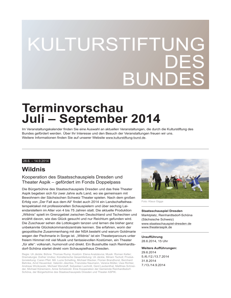 KULTURSTIFTUNG DES Terminvorschau BUNDES Terminvorschau Juli – September 2014 Im Veranstaltungskalender finden Sie eine Auswahl an aktuellen Veranstaltungen, die durch die Kulturstiftung des Bundes gefördert werden. Über Ihr Interesse und den Besuch der Veranstaltungen freuen wir uns. Weitere Informationen finden Sie auf unserer Website www.kulturstiftung-bund.de. 28.6. – 14.9.2014 Wildnis Kooperation des Staatsschauspiels Dresden und Theater Aspik – gefördert im Fonds Doppelpass Die Bürgerbühne des Staatsschauspiels Dresden und das freie Theater Aspik begeben sich für zwei Jahre aufs Land, wo sie gemeinsam mit Bewohnern der Sächsischen Schweiz Theater spielen. Nach dem großen Erfolg von „Der Fall aus dem All“ findet auch 2014 ein Landschaftstheaterspektakel mit professionellen Schauspielern und über sechzig Laiendarstellern im Alter von 4 bis 75 Jahren statt. Die aktuelle Produktion „Wildnis“ spielt im Grenzgebiet zwischen Deutschland und Tschechien und erzählt davon, wie das Glück gesucht und nur Reichtum gefunden wird. Die Zuschauer sehen die Lottokugeln tanzen und lernen die bisher ganz unbekannte Glückskommandozentrale kennen. Sie erfahren, worin der geopolitische Zusammenhang mit der NSA besteht und warum Goldmarie wegen der Pechmarie in Sorge ist. „Wildnis“ ist ein Theaterparcours unter freiem Himmel mit viel Musik und fantasievollen Kostümen, ein Theater „für alle“: volksnah, humorvoll und direkt. Ein Busshuttle nach Reinhardtsdorf-Schöna startet direkt vom Schauspielhaus Dresden. Regie: Uli Jäckle; Bühne: Thomas Rump; Kostüm: Elena Anatolevna; Musik: Roman Keller; Dramaturgie: Esther Undisz; Künstlerische Gesamtleitung: Uli Jäckle, Miriam Tscholl; Produktionsleitung: Caren Pfeil. Mit: Luzia Schelling, Michael Wacker, Florian Brandhorst, Bernhard Behnke, Arnd Heuwinkel, Valentin Jäschke, Franziska Naumann, Verena Müller, Uwe Richter, Andreas Wicikowski, Michael Wenzlaff, Sebastian Lachnitt, Gerd Laubenthal, Matthias Schneider, Michael Könemann, Anne Schietzold. Eine Kooperation der Gemeinde ReinhardtsdorfSchöna, der Bürgerbühne des Staatsschauspiels Dresden und Theater ASPIK. Foto: Klaus Gigga Staatsschauspiel Dresden Marktplatz, Reinhardtsdorf-Schöna (Sächsische Schweiz) www.staatsschauspiel-dresden.de www.theateraspik.de Uraufführung 28.6.2014, 15 Uhr Weitere Aufführungen: 29.6.2014 5./6./12./13.7.2014 31.8.2014 7./13./14.9.2014 Kulturstiftung des Bundes | Terminvorschau Juli – Sep 2014 02 3. – 6.7.2014 Mambo Moto Moto Musik aus Tansania beim TFF Rudolstadt 2014 – gefördert im Fonds TURN Das TFF Rudolstadt ist das größte Roots-Folk-Weltmusik-Festival Deutschlands. Mit dem Länderschwerpunkt „Mambo Moto Moto“ (etwa: Hot Stuff) präsentiert es 2014 neueste Strömungen der urbanen Musikszenen aus Dar es Salaam und Sansibar. Vier Sonderprojekte und Kooperationen mit Künstler/innen aus Tansania und Deutschland sollen neue Perspektiven für die Musiker und die Kunstszenen beider Länder eröffnen. Eingeladen sind die Ensembles Black Warriors mit AnalogAfrica SoundSystem, Kazimoto mit den Gebrüdern Teichmann, Kithara mit Derya Takkali und das Safi Theatre mit Circus Bombastico. Diese repräsentieren in Tansania eigene, originelle und für das dortige Musikleben zukunftsweisende Stile und Richtungen. Weiterhin runden u.a. die Künstler/innen Kaya Baikoko, Segere Original und Tarbiyya Islamiyya das Spektrum populärer und traditioneller tansanischer Musik ab. Die internationale Konferenz „Sketches Of Tanzania“ vermittelt theoretische Einsichten in die Musik Tansanias und ein Vortrag beleuchtet die Entwicklung Tansanias und die aktuelle wirtschaftliche und politische Situation. Segere Original, Foto: Werner Graebner Stadtverwaltung Rudolstadt Fachdienst Kultur - TFF Konzerte an diversen Orten in Rudolstadt www.tff-rudolstadt.de Festival 3. – 6.7.2014 Konferenz 4.7.2014, 9.30 – 17 Uhr Bibliothek Rudolstadt Ein Projekt der Stadt Rudolstadt, Dezernat für Kultur mit dem Festival Sauti za Busara Sansibar. Die Konferenz „Sketches Of Tanzania“ ist eine gemeinsame Veranstaltung mit dem Lehrstuhl für Transcultural Music Studies an der Musikhochschule Weimar. Künstler/innen: Kazimoto, Dar Es Salaam mit Gebrüder Teichmann, Berlin/Regensburg; Black Warriors, Dar Es Salaam mit AnalogAfricaSoundSystem, Frankfurt/Main; Safi Theatre, Dar Es Salaam mit Circus Bombastico, Dresden mit Special Guest Segere Original; Tarbiyya Islamiyya, Sansibar; Kaya Baikoko, Dar Es Salaam; Ufunuo Muheme Group u.a. 5.7. – 19.9.2014 HACK and the CITY Kunst und Kultur im öffentlichen Raum – gefördert im Programm Fellowship Internationales Museum Das Projekt „Hack and the City“ ist aus dem Wunsch entstanden, neue Formen der Kommunikation und des Miteinanders im öffentlichen Raum zu entdecken. Im Rahmen von „Hack and the City“ hat Öykü Özsoy, derzeit Fellow am Wilhelm-Hack-Museum in Ludwigshafen, eine Reihe von künstlerischen Projekten nach Ludwigshafen eingeladen, darunter „Another Perfect Day“ von Schirin Kretschmann und „Tell Me What You Eat“ von Erik Göngrich und Ece Pazarbaşı. Schirin Kretschmann entwickelt temporäre Interventionen für den städtischen Raum rund um den Ludwigshafener Hauptbahnhof, die wie Alltagsereignisse wirken. Die von ihr verwendeten Gegenstände und Materialien, an denen immer wieder die Farbe Pink erscheint, spielen auf den urbanen Kontext an. Das Kunstprojekt „Tell Me What You Eat“ wirft Fragen zu Themen wie Ernährung, Teilen und Stadtplanung auf und bindet die regionale Bevölkerung mit ein. Kuratorin „Hack and the City“: Öykü Özsoy, Künstler/innen: Schirin Kretschmann, Erik Göngrich, Ece Pazarbaşı „Another Perfect Day“, Intervention 2, Courtesy of the artist Schirin Kretschmann, Foto: Sandra Köstler Wilhelm-Hack-Museum Ludwigshafen Öffentlicher Raum in Ludwigshafen www.hackandthecity.com „Another Perfect Day“ 5. – 19.7.2014 und 19.9.2014 „Tell Me What You