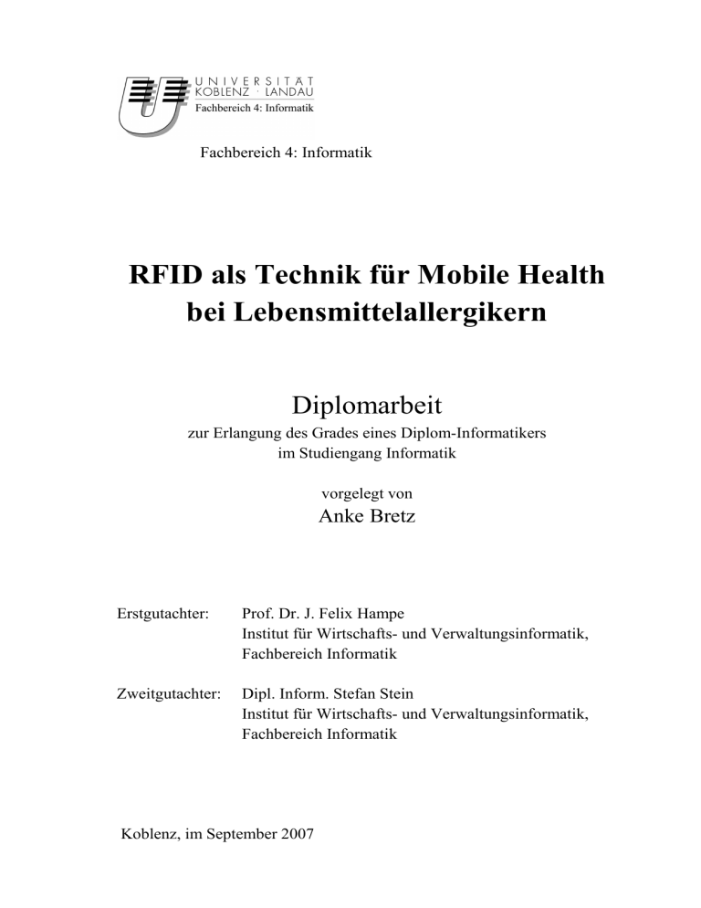 Fachbereich 4: Informatik RFID als Technik für Mobile Health bei Lebensmittelallergikern Diplomarbeit zur Erlangung des Grades eines Diplom-Informatikers im Studiengang Informatik vorgelegt von Anke Bretz Erstgutachter: Prof. Dr. J. Felix Hampe Institut für Wirtschafts- und Verwaltungsinformatik, Fachbereich Informatik Zweitgutachter: Dipl. Inform. Stefan Stein Institut für Wirtschafts- und Verwaltungsinformatik, Fachbereich Informatik Koblenz, im September 2007 ii Erklärung Ich versichere, dass ich die vorliegende Arbeit selbständig verfasst und keine anderen als die angegebenen Quellen und Hilfsmittel benutzt habe. Ja Nein Mit der Einstellung der Arbeit in die Bibliothek bin ich einverstanden. Der Veröffentlichung dieser Arbeit im Internet stimme ich zu. ……………………………………………………………………………………………. (Ort, Datum) (Unterschrift) iii iv Inhaltsverzeichnis Abbildungsverzeichnis.................................................................................................viii Tabellenverzeichnis ....................................................................................................... xi Abkürzungsverzeichnis ...............................................................................................xiii 1 Überblick ...................................................................................................................... 1 1.1 Motivation.............................................................................................................. 1 1.2 Fragestellungen ..................................................................................................... 2 1.3 Vorgehensweise ..................................................................................................... 3 1.4 Gegenstand der Arbeit ......................................................................................... 4 2 Mobile Health............................................................................................................... 5 2.1 Kurzeinführung Mobile Health........................................................................... 5 2.1.1 Warum Mobile Health................................................................................... 6 2.1.2 Verschiedene Systeme.................................................................................... 7 2.1.3 Probleme bei Mobile Health ....................................................................... 11 2.2 Kurzeinführung Lebensmittelallergie............................................................... 11 3 Lebensmittelallergie heute und in Zukunft ............................................................. 15 3.1 Aktuelle Situation eines Lebensmittelallergikers............................................. 15 3.2 Zukunftsvisionen................................................................................................. 16 4 Kurzeinführung RFID............................................................................................... 19 4.1 Einsatzgebiete...................................................................................................... 20 4.2 Technik ................................................................................................................ 21 4.3 Antikollisionsverfahren ...................................................................................... 23 4.3.1 Raummultiplex............................................................................................. 24 4.3.2 Frequenzmultiplex ....................................................................................... 25 4.3.3 Zeitmultiplex ................................................................................................ 26 5 Verschiedene Systeme & Frequenzen ...................................................................... 28 5.1 Passiv - Aktiv ....................................................................................................... 28 5.1.1 Passiv............................................................................................................. 28 5.1.2 Aktiv.............................................................................................................. 30 5.1.3 Semi-passiv ................................................................................................... 32 5.1.4 Gegenüberstellung ....................................................................................... 32 5.2 Gliederung nach Reichweite .............................................................................. 33 5.2.1 Short Range-Systeme................................................................................... 33 5.2.2 Mid Range-Systeme ..................................................................................... 34 5.2.3 Long Range-Systeme ................................................................................... 34 5.3 Verschiedene Frequenzen .................................................................................. 35 5.3.1 Langwellenbereich ....................................................................................... 36 5.3.2 Kurzwellenbereich ....................................................................................... 36 5.3.3 Ultra-Kurzwellenbereich............................................................................. 37 5.3.4 Mikrowellenbereich ..................................................................................... 37 5.4 Abschließende Gegenüberstellung .................................................................... 38 v 6 Konzeption eines EuLa-Armbandes ........................................................................ 39 6.1 Aufbau der Produktnummer............................................................................. 39 6.2 Aufbau des Prototyps ......................................................................................... 40 6.2.1 RFID-Technik ......
