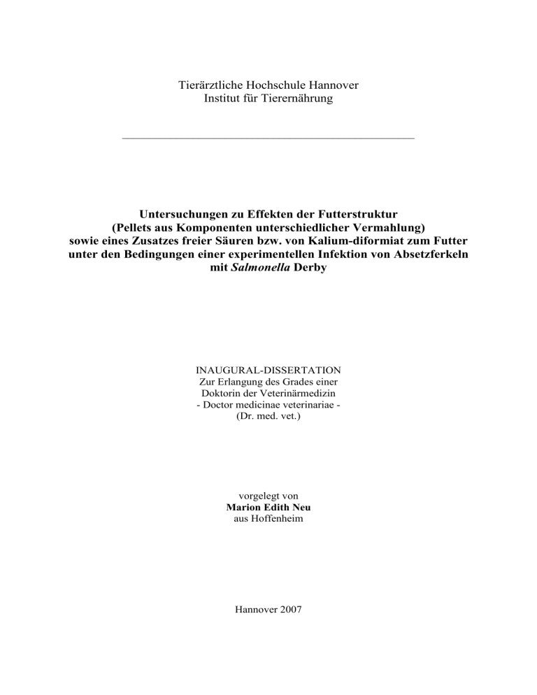 Tierärztliche Hochschule Hannover Institut für Tierernährung ______________________________________________________ Untersuchungen zu Effekten der Futterstruktur (Pellets aus Komponenten unterschiedlicher Vermahlung) sowie eines Zusatzes freier Säuren bzw. von Kalium-diformiat zum Futter unter den Bedingungen einer experimentellen Infektion von Absetzferkeln mit Salmonella Derby INAUGURAL-DISSERTATION Zur Erlangung des Grades einer Doktorin der Veterinärmedizin - Doctor medicinae veterinariae (Dr. med. vet.) vorgelegt von Marion Edith Neu aus Hoffenheim Hannover 2007 Wissenschaftliche Betreuung: Univ.-Prof. Dr. J. Kamphues 1. Gutachter: Univ.-Prof. Dr. J. Kamphues 2. Gutachter: Univ.-Prof. Dr. K.-H. Waldmann Tag der mündlichen Prüfung: 20.11.2007 Diese Arbeit wurde dankenswerter Weise durch Mittel der BASF-AG Ludwigshafen finanziert. MEINEN ELTERN Teile der vorliegenden Dissertation wurden bereits auf folgenden Tagungen präsentiert: 13th International Conference on Production Diseases in Farm Animals Leipzig, Deutschland, 29.07. – 04.08.2007 HASSAN, Y., M. NEU, V. TAUBE, J. VERSPOHL u. J. KAMPHUES (2007): Effects of feed particle size (coarse/fine) and addition of organic acids or potassium diformate on counts of E. coli and Salmonella in chyme after an experimental infection of weaned pigs. Proceedings, p. 329 bpt-Kongress Bremen, Deutschland, 11. – 14.10.2007 TAUBE, V., M. NEU, Y. HASSAN, V. KELLER u. J. KAMPHUES (2007): Einflüsse von Futterstruktur und verschiedenen Additiven (organische Säuren, KDF) auf den pH-Wert im Mageninhalt von Absetzferkeln. Kurzfassung im Tagungsband der o.g. Veranstaltung, S. 7-12 11th Congress of the European Society of Veterinary and Comparative Nutrition Leipzig, Deutschland, 01. – 03.11.2007 HASSAN, Y., M. NEU, V. TAUBE, J. VERSPOHL u. J. KAMPHUES (2007): Effects of grinding intensity (coarse/fine) and adding organic acids or potassium diformate to the diet on counts of E. coli and S. Derby in gastrointestinal contents of experimentally infected weaned pigs. Proceedings, p. 131 Inhaltsverzeichnis ___________________________________________________________________________ I. Inhaltsverzeichnis I. Inhaltsverzeichnis................................................................................................................I II. Abkürzungsverzeichnis ..................................................................................................... V III. Tabellen- und Abbildungsverzeichnis.............................................................................. VI 1 Einleitung ........................................................................................................................... 1 2 Schrifttum........................................................................................................................... 3 2.1 Rechtliche Rahmenbedingungen................................................................................ 3 2.1.1 Verbot antibiotischer Leistungsförderer............................................................. 3 2.1.2 Futterzusatzstoffe ............................................................................................... 3 2.1.3 EU-Recht bezüglich Zoonosen und Zoonoseerreger ......................................... 6 2.1.4 Nationales Recht ................................................................................................ 8 2.2 Salmonellen.............................................................................................................. 12 2.2.1 Taxonomie........................................................................................................ 12 2.2.2 Nachweismethoden .......................................................................................... 12 2.2.3 Epidemiologie und Tenazität ........................................................................... 14 2.2.4 Pathologie und Virulenz................................................................................... 17 2.2.5 Einflüsse auf die Salmonellenprävalenz .......................................................... 19 2.2.5.1 Haltungsform................................................................................................ 19 2.2.5.2 Impfung ........................................................................................................ 20 2.2.5.3 Absetzzeitpunkt............................................................................................ 21 2.2.6 Salmonellen beim Schwein .............................................................................. 22 2.2.7 Salmonellen beim Menschen ........................................................................... 24 2.2.8 Zusammenfassung............................................................................................ 25 2.3 Futterstruktur und –konfektionierung ...................................................................... 26 2.3.1 Futterstruktur.................................................................................................... 26 2.3.2 Futterkonfektionierung..................................................................................... 28 2.4 Organische Säuren und ihre Salze............................................................................ 30 2.4.1 Vorkommen, Vor- und Nachteile sowie Einteilung der Wirk-Ebenen ............ 30 2.4.2 Vertreter der organischen Säuren und ihre Salze ............................................. 31 2.4.2.1 Ameisensäure ............................................................................................... 31 2.4.2.2 Propionsäure................................................................................................. 32 2.4.2.3 Formi® .......................................................................................................... 32 2.4.2.4 Lupro-Cid® ................................................................................................... 33 2.4.2.5 Weitere org