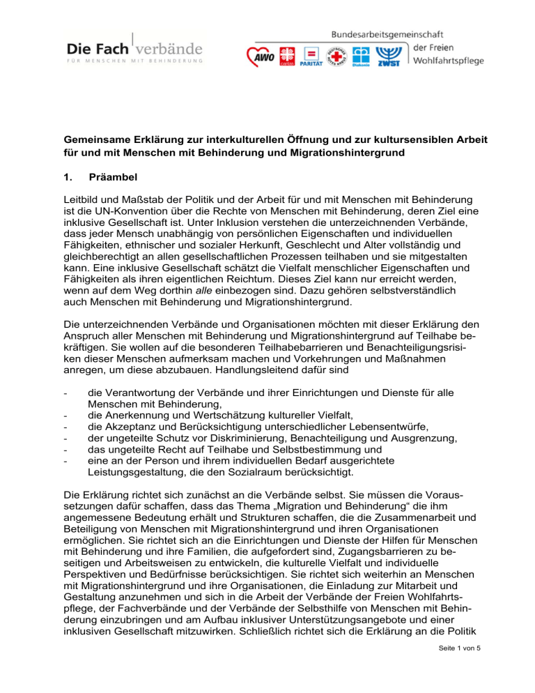Gemeinsame Erklärung zur interkulturellen Öffnung und zur kultursensiblen Arbeit für und mit Menschen mit Behinderung und Migrationshintergrund 1. Präambel Leitbild und Maßstab der Politik und der Arbeit für und mit Menschen mit Behinderung ist die UN-Konvention über die Rechte von Menschen mit Behinderung, deren Ziel eine inklusive Gesellschaft ist. Unter Inklusion verstehen die unterzeichnenden Verbände, dass jeder Mensch unabhängig von persönlichen Eigenschaften und individuellen Fähigkeiten, ethnischer und sozialer Herkunft, Geschlecht und Alter vollständig und gleichberechtigt an allen gesellschaftlichen Prozessen teilhaben und sie mitgestalten kann. Eine inklusive Gesellschaft schätzt die Vielfalt menschlicher Eigenschaften und Fähigkeiten als ihren eigentlichen Reichtum. Dieses Ziel kann nur erreicht werden, wenn auf dem Weg dorthin alle einbezogen sind. Dazu gehören selbstverständlich auch Menschen mit Behinderung und Migrationshintergrund. Die unterzeichnenden Verbände und Organisationen möchten mit dieser Erklärung den Anspruch aller Menschen mit Behinderung und Migrationshintergrund auf Teilhabe bekräftigen. Sie wollen auf die besonderen Teilhabebarrieren und Benachteiligungsrisiken dieser Menschen aufmerksam machen und Vorkehrungen und Maßnahmen anregen, um diese abzubauen. Handlungsleitend dafür sind - die Verantwortung der Verbände und ihrer Einrichtungen und Dienste für alle Menschen mit Behinderung, die Anerkennung und Wertschätzung kultureller Vielfalt, die Akzeptanz und Berücksichtigung unterschiedlicher Lebensentwürfe, der ungeteilte Schutz vor Diskriminierung, Benachteiligung und Ausgrenzung, das ungeteilte Recht auf Teilhabe und Selbstbestimmung und eine an der Person und ihrem individuellen Bedarf ausgerichtete Leistungsgestaltung, die den Sozialraum berücksichtigt. Die Erklärung richtet sich zunächst an die Verbände selbst. Sie müssen die Voraussetzungen dafür schaffen, dass das Thema „Migration und Behinderung“ die ihm angemessene Bedeutung erhält und Strukturen schaffen, die die Zusammenarbeit und Beteiligung von Menschen mit Migrationshintergrund und ihren Organisationen ermöglichen. Sie richtet sich an die Einrichtungen und Dienste der Hilfen für Menschen mit Behinderung und ihre Familien, die aufgefordert sind, Zugangsbarrieren zu beseitigen und Arbeitsweisen zu entwickeln, die kulturelle Vielfalt und individuelle Perspektiven und Bedürfnisse berücksichtigen. Sie richtet sich weiterhin an Menschen mit Migrationshintergrund und ihre Organisationen, die Einladung zur Mitarbeit und Gestaltung anzunehmen und sich in die Arbeit der Verbände der Freien Wohlfahrtspflege, der Fachverbände und der Verbände der Selbsthilfe von Menschen mit Behinderung einzubringen und am Aufbau inklusiver Unterstützungsangebote und einer inklusiven Gesellschaft mitzuwirken. Schließlich richtet sich die Erklärung an die Politik Seite 1 von 5 und die Sozialverwaltungen, die gesetzlichen und finanziellen Rahmenbedingungen so zu gestalten, dass auch Menschen mit Behinderung und Migrationshinter-grund uneingeschränkten Zugang zu bedarfsgerechten Leistungen des Sozialsystems und zur vollen Teilhabe am gesellschaftlichen Leben haben. 2. Ausgangslange – Zur Situation von Menschen mit Behinderung und Migrationshintergrund im Einwanderungsland Seit dem Mikrozensus 2005 ist die Kategorie "Menschen mit Migrationshintergrund"1 entwickelt worden. Diese Personengruppe umfasst derzeit rund 16 Millionen Menschen; das sind nahezu ein Fünftel der Bevölkerung der Bundesrepublik. In Deutschland leben insgesamt ca. 9 Millionen Menschen mit Behinderung. Wie viele von ihnen einen Migrationshintergrund haben, ist nicht bekannt. Gesellschaftliche Benachteiligungs- und Ausgrenzungsrisiken treffen Menschen mit Migrationshintergrund und Menschen mit Behinderung in ähnlicher Weise. Oft sind diese verbunden mit einem eingeschränkten Zugang zu Bildung und Arbeit, materieller Sicherheit, zum Wohnungsmarkt und zu den allgemeinen Hilfe- und Sozialsystemen. Durch die Kumulation der Risiken wird Inklusion zu einer besonderen Herausforderung. Spätestens seit dem Inkrafttreten der UN–Konvention über die Rechte von Menschen mit Behinderung (UN-BRK) gilt Inklusion als Leit- und Handlungsziel in der Arbeit für und mit Menschen mit Behinderung. Mit dem Leitziel „Inklusion“ verbindet sich die gesamtgesellschaftliche Querschnittsaufgabe, Strukturen zu entwickeln oder anzupassen, eine gleichberechtigte und selbstbestimmte Teilhabe aller Menschen zu gewährleisteten. Dem gegenüber zielt Integration in der vorherrschenden politischen Debatte im Kern auf Anpassungsleistungen der Individuen. Diese Auffassung von Integration wird von unterschiedlichen integrationspolitischen Akteuren kritisch gesehen und insgesamt kontrovers diskutiert. Die Wohlfahrtsverbände verstehen Integration im Sinne einer gesamtgesellschaftlichen Aufgabe mit einer besonderen Verantwortung aller öffentlichen Einrichtungen. Im Rahmen der „Nationalen Aktionspläne“ Inklusion bzw. Integration werden derzeit Maßnahmen erörtert, die einerseits auf eine Umsetzung der BRK und andererseits auf die Integration von Menschen mit Migrationshintergrund abzielen. Festzustellen ist, dass es bisher wenig Schnittmengen zwischen den beiden Aktionsplänen und damit zwischen den beiden Anliegen gibt. Die bessere Verknüpfung dieser beiden Bereiche ist jedoch dringend notwendig. Denn es ist festzustellen, dass Menschen mit Behinderung und Migrationshintergrund die verschiedenen Unterstützungsangebote für Menschen mit Behinderung weit unterdurchschnittlich in Anspruch nehmen und sie nur in geringem Maße in die Selbsthilfe und Selbstvertretungsstrukturen der Organisationen behinderter Menschen und ihrer Familien eingebunden sind. Für die Entwicklung zielgruppengerechter Konzepte ist allerdings zu bedenken, dass die Zielgruppen dieser Handlungsfelder äußerst heterogen sind. Sowohl „Menschen mit Migrationshin