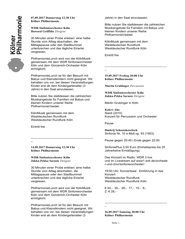 07.09.2017 Donnerstag 12:30 Uhr Kölner Philharmonie Jahre) in den Saal einzulassen. WDR Sinfonieorchester Köln Howard Griffiths Dirigent Bitte nutzen Sie stattdessen die zahlreichen Musikangebote für Familien mit Babys und kleinen Kindern unserer Reihe PhilharmonieVeedel. 30 Minuten einer Probe erleben: eine halbe Stunde vom Alltag abschalten, die Mittagspause oder den Stadtbummel unterbrechen und das tägliche Einerlei vergessen. KölnMusik gemeinsam mit dem Westdeutschen Rundfunk Westdeutscher Rundfunk Köln Eintritt frei PhilharmonieLunch wird von der KölnMusik gemeinsam mit dem WDR Sinfonieorchester Köln und dem Gürzenich-Orchester Köln ermöglicht. PhilharmonieLunch ist für den Besuch mit Babys und Kleinstkindern nicht geeignet. Wir behalten uns vor, bei diesen Veranstaltungen Kinder erst ab dem Kindergartenalter (3 Jahre) in den Saal einzulassen. Bitte nutzen Sie stattdessen die zahlreichen Musikangebote für Familien mit Babys und kleinen Kindern unserer Reihe PhilharmonieVeedel. KölnMusik gemeinsam mit dem Westdeutschen Rundfunk Westdeutscher Rundfunk Köln ____________________________________ _ 15.09.2017 Freitag 20:00 Uhr Kölner Philharmonie Martin Grubinger Percussion WDR Sinfonieorchester Köln Jukka-Pekka Saraste Dirigent Martin Grubinger in Köln Kalevi Aho Sieidi (2010) Konzert für Percussion und Orchester Pause Eintritt frei Dmitrij Schostakowitsch Sinfonie Nr. 10 e-Moll op. 93 (1953) ____________________________________ _ Pause gegen 20:45 | Ende gegen 22:00 14.09.2017 Donnerstag 12:30 Uhr Kölner Philharmonie SinfoniePlus 5,50 Euro (Einheitspreis bis 25 Jahre/keine Ermäßigung) WDR Sinfonieorchester Köln Jukka-Pekka Saraste Dirigent Das Konzert im Radio: WDR 3 live und im Livestream auf www1.wdr.de/orcheste r-und-chor/sinfonieorchester/ 30 Minuten einer Probe erleben: eine halbe Stunde vom Alltag abschalten, die Mittagspause oder den Stadtbummel unterbrechen und das tägliche Einerlei vergessen. PhilharmonieLunch wird von der KölnMusik gemeinsam mit dem WDR Sinfonieorchester Köln und dem Gürzenich-Orchester Köln ermöglicht. PhilharmonieLunch ist für den Besuch mit Babys und Kleinstkindern nicht geeignet. Wir behalten uns vor, bei diesen Veranstaltungen Kinder erst ab dem Kindergartenalter (3 19:00 Uhr, Konzertsaal : Einführung in das Konzert Westdeutscher Rundfunk Westdeutscher Rundfunk Köln € 44,- 35,- 26,- 17,- 15,- 8,Z: € 26,- ____________________________________ _ 16.09.2017 Samstag 20:00 Uhr Kölner Philharmonie Seite 1 Öffentliche Wertungsrunde Martin Grubinger Percussion Ende gegen 17:30 WDR Sinfonieorchester Köln Jukka-Pekka Saraste Dirigent Martin Grubinger in Köln Kalevi Aho Sieidi (2010) Konzert für Percussion und Orchester Pause Dmitrij Schostakowitsch Sinfonie Nr. 10 e-Moll op. 93 (1953) KölnMusik gemeinsam mit dem Deutschen Musikrat, der Oper Köln, dem Gürzenich-Orchester Köln und dem WDR Sinfonieorchester Köln Eintritt frei ____________________________________ _ 29.09.2017 Freitag 20:00 Uhr Kölner Philharmonie Pause gegen 20:45 | Ende gegen 22:00 Westdeutscher Rundfunk Westdeutscher Rundfunk Köln Ensemble und Internationales Opernstudio der Oper Köln WDR Sinfonieorchester Köln € 44,- 35,- 26,- 17,- 15,- 8,Z: € 26,- ____________________________________ _ 27.09.2017 Mittwoch 14:00 Uhr Kölner Philharmonie WDR Sinfonieorchester Köln Deutscher Dirigentenpreis 2. Runde Öffentliche Wertungsrunde Ende gegen 18:00 KölnMusik gemeinsam mit dem Deutschen Musikrat, der Oper Köln, dem Gürzenich-Orchester Köln und dem WDR Sinfonieorchester Köln Eintritt frei ____________________________________ _ 28.09.2017 Donnerstag 14:00 Uhr Kölner Philharmonie Gürzenich-Orchester Köln Deutscher Dirigentenpreis Finalkonzert Namhafte Wettbewerbe für junge Musiker gibt es viele, aber wenige für Dirigenten. Der Deutsche Dirigentenpreis wird erstmals 2017 ausgeführt und soll als Sprungbrett für große Karrieren dienen. Denn den Preisträgern winken nicht nur hohe Preisgelder, sondern auch Konzert-Engagements und Assistenzen bei deutschen Orchestern und an Opernhäusern. Durch die Nachwuchsförderung wird ein wichtiger Beitrag für die von der UNESCO-Kommission als immaterielles Weltkulturerbe ausgezeichnete deutsche Orchester- und Theaterlandschaft geleistet. KölnMusik gemeinsam mit dem Deutschen Musikrat, der Oper Köln, dem Gürzenich-Orchester Köln und dem WDR Sinfonieorchester Köln € 44,- 35,- 26,- 17,- 15,- 8,Z: € 26,- ____________________________________ _ WDR Sinfonieorchester Köln Deutscher Dirigentenpreis 3. Runde 05.10.2017 Donnerstag 12:30 Uhr Kölner Philharmonie Seite 2 WDR Sinfonieorchester Köln Alondra de la Parra Dirigentin 30 Minuten einer Probe erleben: eine halbe Stunde vom Alltag abschalten, die Mittagspause oder den Stadtbummel unterbrechen und das tägliche Einerlei vergessen. PhilharmonieLunch wird von der KölnMusik gemeinsam mit dem WDR Sinfonieorchester Köln und dem Gürzenich-Orchester Köln ermöglicht. PhilharmonieLunch ist für den Besuch mit Babys und Kleinstkindern nicht geeignet. Wir behalten uns vor, bei diesen Veranstaltungen Kinder erst ab dem Kindergartenalter (3 Jahre) in den Saal einzulassen. Silvestre Revueltas / José Limantour La noche de los Mayas (1939) Filmmusik. Suite für Orchester keine Pause | Ende gegen 20:30 Westdeutscher Rundfunk Westdeutscher Rundfunk Köln € 17,50 ____________________________________ _ 13.10.2017 Freitag 20:00 Uhr Kölner Philharmonie Paul Lewis Klavier Bitte nutzen Sie stattdessen die zahlreichen Musikangebote für Familien mit Babys und kleinen Kindern unserer Reihe PhilharmonieVeedel. WDR Sinfonieorchester Köln Manfred Honeck Dirigent Alte Welt - Neue Welt KölnMusik gemeinsam mit dem Westdeutschen Rundfunk Westdeutscher Rundfunk Köln Ludwig van Beethoven Konzert für Klavier und Orchester Nr. 1 C-Dur op. 15 (1793–1800) Eintritt frei Pause ____________________________________ _ 05.10.2017 Donnerstag 19:00 Uhr Kölner Philharmonie Leticia Moren