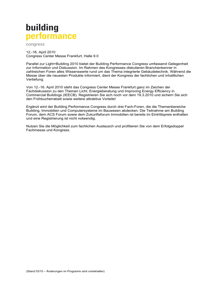 12.-16. April 2010 Congress Center Messe Frankfurt, Halle 9.0 Parallel zur Light+Building 2010 bietet der Building Performance Congress umfassend Gelegenheit zur Information und Diskussion. Im Rahmen des Kongresses diskutieren Branchenkenner in zahlreichen Foren alles Wissenswerte rund um das Thema integrierte Gebäudetechnik. Während die Messe über die neuesten Produkte informiert, dient der Kongress der fachlichen und inhaltlichen Vertiefung. Von 12.-16. April 2010 steht das Congress Center Messe Frankfurt ganz im Zeichen der Fachdiskussion zu den Themen Licht, Energieberatung und Improving Energy Efficiency in Commercial Buildings (IEECB). Registrieren Sie sich noch vor dem 19.3.2010 und sichern Sie sich den Frühbucherrabatt sowie weitere attraktive Vorteile! Ergänzt wird der Building Performance Congress durch drei Fach-Foren, die die Themenbereiche Building, Immobilien und Computersysteme im Bauwesen abdecken. Die Teilnahme am Building Forum, dem ACS Forum sowie dem Zukunftsforum Immobilien ist bereits im Eintrittspreis enthalten und eine Registrierung ist nicht notwendig. Nutzen Sie die Möglichkeit zum fachlichen Austausch und profitieren Sie von dem Erfolgsdoppel Fachmesse und Kongress. (Stand 03/10 – Änderungen im Programm sind vorbehalten) Light Focus 12.-14. April 2010 Congress Center Messe Frankfurt, Ebene 3, Raum Illusion I + II „Design + Technologie – eine Partnerschaft, die funktionieren kann“ Veranstalter: Messe Frankfurt in Kooperation mit der Professional Lighting Designers' Association (PLDA) im Auftrag des Fachverbandes Licht im ZVEI - Zentralverband Elektrotechnik- und Elektronikindustrie e.V. Montag, 12. April 2010 / „Tageslicht“ Moderation: Dr. Martin Lupton, Präsident der PLDA, London, Großbritannien 10.00 Begrüßung Dr. Martin Lupton, PLDA, London, Großbritannien 10.15 Gestalten mit Tageslicht James Carpenter, Carpenter Norris Consulting, New York, USA 11.00 Tageslichtnutzung – Energieeffizienz und Raumqualität durch innovative Tageslichtlösungen Andreas Danler, Bartenbach LichtLabor GmbH, Aldrans, Österreich 11.30 Planungsprozess Tageslichttechnik – was schuldet der Lichtdesigner, was erwartet der Bauherr Dr. Helmut Köster, Köster Lichtplanung, Frankfurt am Main, Deutschland 12.00 Tageslichtplanung für gesunde Lernlandschaften Prof. Dr. Barbara Matusiak, Norwegian University of Science and Technology, Trondheim, Norwegen 12.30 Mittagspause 13.15 “In touch with James Carpenter” – Ihre exklusive Gelegenheit James Carpenter kennenzulernen Moderierte Diskussion mit dem Hauptredner Dienstag, 13. April 2010 / „Energieeffizienz“ Moderation: Dr. Martin Lupton, Präsident der PLDA, London, Großbritannien 10.00 Begrüßung Dr. Martin Lupton, PLDA, London, Großbritannien 10.15 Ökologie – Design – Synergie Martin Haas, Behnisch, Behnisch & Partner, Stuttgart, Deutschland 11.00 Masdar und andere spannende Geschichten Alexander Rieck, LAVA Architekten, Stuttgart, Deutschland 11.30 Dunkelheit Mark Major, Speirs & Major Associates, London, Großbritannien 12.00 Klima_Hüllen – energieeffiziente Fassadengestaltung Betram Vandreike, KSV Krüger Schubert Vandreike, Berlin, Deutschland (Stand 03/10 – Änderungen im Programm sind vorbehalten) 12.30 Mittagspause 13.15 “In touch with Martin Haas” – Ihre exklusive Gelegenheit Martin Haas kennenzulernen Moderierte Diskussion mit dem Hauptredner Mittwoch, 14. April 2010 / „Licht + Gesundheit“ Moderation: Dr. Martin Lupton, Präsident der PLDA, London, Großbritannien 10.00 Begrüßung Dr. Martin Lupton, PLDA, London, Großbritannien 10.15 Von Photonen zur menschlichen Gesundheit: Der Kraft des Lichts auf der Spur Prof. Dr. George C. Brainard, Thomas Jefferson University, Philadelphia, USA 11.00 Farbpsychologie der Lichtstrahlung – in Wissenschaft und Praxis Prof. Karl Albert Fischer, Österreichisches Institut für Licht und Farbe, Wien, Österreich 11.30 Wie man bei der Gestaltung architektonischer Räume menschliche Wünsche und Bedürfnisse definiert Yasmine Mahmoudieh, The Royal Studios, London, Großbritannien 12.00 Chronobiologie: Die Bedeutung von Licht für Menschen; die Wichtigkeit von Chronobiologie für Gestaltungsaufgaben Prof. Till Roenneberg, Institut für Medizinische Psychologie an der LudwigMaximilians-Universität, München, Deutschland 12.30 Mittagspause 13.15 “In touch with Prof. Dr. George C. Brainard” – Ihre exklusive Gelegenheit Prof. Dr. George C. Brainard kennenzulernen Moderierte Diskussion mit dem Hauptredner Die Teilnahmegebühr zum Light Focus enthält folgende Leistungen: • • • • • Zutritt zu allen öffentlichen Vorträgen des Light Focus an dem jeweiligen gebuchten Tag Bei Anmeldung bis einschließlich 19.3.2010 inkl. Messeeintritt an den gebuchten Tagen. Ihr Messeticket berechtigt Sie zur Nutzung der öffentlichen Verkehrsmittel des Rhein-MainVerkehrsverbundes (RMV). Konferenz-Unterlagen Messekatalog Mittags-Imbiss Die Vorträge des Light Focus werden simultan in Deutsch / Englisch übersetzt. Die Vorträge werden von der Architekten- und Stadtplanerkammer Hessen als Weiterbildung anerkannt. (Stand 03/10 – Änderungen im Programm sind vorbehalten) Energy Focus – 5. Deutscher Energieberatertag 14. April 2010 Congress Center Messe Frankfurt, Ebene 3, Raum Illusion III Veranstalter: Messe Frankfurt in Kooperation ECONSULT Träger: Bundesingenieurkammer (BIngK), Berlin Architekten- und Stadtplanerkammer Hessen (AKH), Wiesbaden Der Deutsche Energieberatertag 2010 bietet ein Forum zu aktuellen Themen für Ingenieure und Architekten, die in der Energieberatung tätig sind. Hier werden aktuelle Fragen der Energieberatung und -planung fundiert erörtert und konkrete Antworten gegeben, und zwar direkt im Dialog zwischen Ihnen und den Machern von Gesetzen und Förderprogrammen. Es wird die Verzahnung von Politik und Praxis aufgezeigt und der hohe Praxisbezug zur direkten Umsetzbarkeit in der täglichen Arbeit hergestellt. Konkret geht
