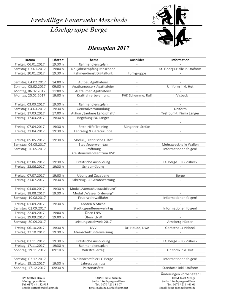 Freiwillige Feuerwehr Meschede Löschgruppe Berge Dienstplan 2017 Datum Freitag, 06.01.2017 Samstag, 07.01.2017 Freitag, 20.01.2017 Uhrzeit 19:30 h 19:00 h 19:30 h Thema Rahmendienstplan Neujahrsempfang Meschede Rahmendienst Digitalfunk Ausbilder Funkgruppe Information St. Georgs-Halle in Uniform - Samstag, 04.02.2017 Sonntag, 05.02.2017 Montag, 06.02.2017 Montag, 20.02.2017 14:00 h 09:00 h 11:00 h 19:00 h Aufbau Agathafeier Agathamesse + Agathafeier Aufräumen Agathafeier Kraftfahrerbelehrung PHK Schemme, Rolf Uniform inkl. Hut in Visbeck Freitag, 03.03.2017 Samstag, 04.03.2017 Freitag, 17.03.2017 Freitag, 17.03.2017 19:30 h 19:30 h 17:00 h 19:30 h Rahmendienstplan Generalversammlung Aktion „Saubere Landschaft“ Begehung Fa. Langer - Freitag, 07.04.2017 Freitag, 21.04.2017 19:30 h 19:30 h Erste-Hilfe Training Fahrzeug & Gerätekunde Büngener, Stefan - Uniform Treffpunkt: Firma Langer - Freitag, 05.05.2017 Samstag, 06.05.2017 Samstag, 20.05.2017 19:30 h Modul „Technische Hilfe“ Stadtfeuerwehrtag Eröffnung Kreisfeuerwehrzentrum HSK - Mehrzweckhalle Wallen Informationen folgen! Freitag, 02.06.2017 Freitag, 23.06.2017 19:30 h 19:30 h Praktische Ausbildung Schaumübung - LG Berge + LG Visbeck - Freitag, 07.07.2017 Freitag, 21.07.2017 19:00 h 19:30 h Übung auf Zugebene Fahrzeug- u. Gerätewartung - Berge - Freitag, 04.08.2017 Freitag, 18.08.2017 Samstag, 19.08.2017 19:30 h 19:30 h Modul „Atemschutzausbildung“ Modul „Wasserförderung“ Feuerwehrwallfahrt - Informationen folgen! Freitag, 01.09.2017 Samstag, 02.09.2017 Freitag, 22.09.2017 Freitag, 29.09.2017 Samstag, 30.09.2017 19:30 h Knoten & Stiche Stadtjugendfeuerwehrtag Üben LNW Üben LNW Leistungsnachweis 2017 - Informationen folgen! Arnsberg-Hüsten Freitag, 06.10.2017 Freitag, 27.10.2017 19:30 h 19:30 h UVV Atemschutzunterweisung Dr. Haude, Uwe - Gerätehaus Visbeck - Freitag, 03.11.2017 Freitag, 17.11.2017 Sonntag, 19.11.2017 19:30 h 19:30 h 09:10 h Praktische Ausbildung Rahmendienstplan Volkstrauertag - LG Berge + LG Visbeck - Uniform inkl. Hut Samstag, 02.12.2017 Freitag, 15.12.2017 Sonntag, 17.12.2017 19:30 h 09:30 h Weihnachtsfeier LG Berge Jahresabschluss Patronatsfest - Informationen folgen! Standarte inkl. Uniform 19:00 h 19:00 h Änderungen vorbehalten! BM Steffen Berels Löschgruppenführer Tel. 0175 / 41 32 915 Email: [email protected] OBM Daniel Schulte Stellv. Löschgruppenführer Tel. 0170 / 211 88 07 Email:[email protected] HBM Josef Menge Stellv. Löschgruppenführer Tel. 0176 / 216 461 66 Email: [email protected]