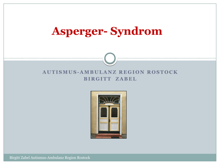 Asperger- Syndrom AUTISMUS-AMBULANZ REGION ROSTOCK BIRGITT ZABEL Birgitt Zabel Autismus-Ambulanz Region Rostock Ben X Birgitt Zabel Autismus-Ambulanz Region Rostock Spektrum autistischer Störungen Autismus: Tiefgreifende Entwicklungsstörung • Sozialverhalten • Kommunikation und Sprache • Verhalten Stereotypien, Interessen und • kognitives Niveau Frühkindlicher Atypischer High- Asperger- Autismus (F 84.0) Autismus (F 84.0) Functioning- Syndrom (F 84.5) Autismus Leo Kanner 1943 Birgitt Zabel Autismus-Ambulanz Region Rostock Hans Asperger 1944 Einführung: Beschreibung der Störung ICD-10: Tiefgreifende Entwicklungsstörungen im Kapitel F 80-89 Entwicklungsstörungen Birgitt Zabel Autismus-Ambulanz Region Rostock Differenzialdiagnostik Birgitt Zabel Autismus-Ambulanz Region Rostock Autismus – Eine Modediagnose? Dillenburger et al. (2013): Intelligent Very-intelligent Variation Art Focused Creative Special-talent Memory Music determined Birgitt Zabel Autismus-Ambulanz Region Rostock Autismus – Eine Modediagnose? Birgitt Zabel Autismus-Ambulanz Region Rostock Prävalenz Aktuell kursieren Zahlen von bis zu 1 zu 88 Kindern mit ASS (Hughes, 2012) Bundesverband Autismus (im Zhg. mit Diskurs zum neuen Teilhabegesetz): 1% Ursachen der deutlichen Überschätzung: Ausweitung der diagnostischen Kriterien, vermehrte Wahrnehmung von ASS in der Öffentlichkeit, verbesserte diagnostische Methoden, verbesserte therapeutische Angebote Nähe von therapeutischen Angeboten erhöht Prävalenzrate Diagnose als rechtliche Voraussetzung für Fördermaßnahmen erhöht Prävalenzrate Birgitt Zabel Autismus-Ambulanz Region Rostock Die Realität Kamp-Becker & Quaschner (2015): Mehrzahl der Betroffenen (62 bis 83%) hat IQ < 85 45 % haben intellektuelle Behinderung (ICD-10: leichte bis schwere Intelligenzminderung F 70.-, F 71.-, F 72.-) und nur 3% (!) haben IQ > 115 Angaben für Anzahl mit IQ > 130 fehlen Birgitt Zabel Autismus-Ambulanz Region Rostock Hohe Prävalenzraten kritisch sehen (Kamp-Becker, 2014; Kamp-Becker & Quaschner, 2015) Konservative Schätzungen: 50 bis 70 auf 10.000 (0,5 bis 0,7%) AS definitiv seltener als andere Subgruppen Männer deutlich häufiger betroffen Birgitt Zabel Autismus-Ambulanz Region Rostock Erscheinungsbild 1. Allgemeine soziale Beeinträchtigung 2. Keine Flexibilität 3. Schwierigkeiten, Blickkontakt herzustellen 4. Spezielle Interessen, die manchmal zur Besessenheit werden 5. Unangemessenes Handeln 6. Höchste Empfindsamkeit 7. Mangelnde Fähigkeit der Selbstwahrnehmung 8. Sie brauchen Hilfe Birgitt Zabel Autismus-Ambulanz Region Rostock 1.Allgemeine soziale Beeinträchtigung • Mangelndes Bewusstsein für Menschen, soziale • • • • • Ereignisse, für Zeit und Ort Sie leben im Hier und Jetzt oder Lichtjahre entfernt Kein Gespür für kommende Momente Auf ihre eigene Sichtweise fixiert Benötigen Hilfe, um sich der Gedanken und Sichtweisen anderer Menschen bewusst zu werden Häufig ungeschickt, es fehlen soziale Kompetenzen Birgitt Zabel Autismus-Ambulanz Region Rostock 2. Keine Flexibilität • Asperger lieben Routinen • Bestehen auf Regeln und Abläufe • Zwanghafte Themen • Kleben am buchstabengetreuen Wortsinn • Sind wahrheitsbesessen, schonungslos ehrlich und sehr direkt Birgitt Zabel Autismus-Ambulanz Region Rostock 3. Blickkontakt • Fehlend, flüchtig, überschweifend oder starr • Wenig moduliert • Kann schmerzhaft sein • Wirkt irritierend • Lenkt vom eigentlichen Vorhaben ab Birgitt Zabel Autismus-Ambulanz Region Rostock 4. Spezielle Interessen • Möchten ständig über ihr Spezialthema sprechen • Texten ihren Gesprächspartner zu • Erkennen das evtl. Desinteresse nicht • Hilft, Angstgefühle zu verringern • Mittel zur Kontaktaufnahme Birgitt Zabel Autismus-Ambulanz Region Rostock 5. Unangemessenes Handeln • Sind sich ihres Handelns oft nicht bewusst • Reagieren oftmals nicht auf Aufforderungen • Haben Schwierigkeiten Körpersprache zu deuten • Verfügen z.T. über gut erlernte soziale Regeln, können diese aber nur wenig adäquat einsetzen • Orientieren sich an anderen Kindern und deren negativen Handeln • Scheinen unmotiviert • Ablehnung von Anforderungen Birgitt Zabel Autismus-Ambulanz Region Rostock 6. Höchste Empfindsamkeit • Unangemessene Reaktionen auf Geräusche, Berührungen • • • • und anderen Reizen Fehlinterpretation von Körperkontakt Überempfindlichkeit für visuelle Reize Besonders Essverhalten Eigenen Schlaf-Wachrhythmus Birgitt Zabel Autismus-Ambulanz Region Rostock 7. Selbstwahrnehmung • Mangelnde Fähigkeit der Selbstwahrnehmung • Häufig Wutanfälle • Frustrationsgrenze • Stimmungsumschwünge • Keine Selbstkontrolle • Oft emotionale Probleme • Ängste • Bewusstsein der eigenen Behinderung Birgitt Zabel Autismus-Ambulanz Region Rostock 8. Sie brauchen Hilfe • Fühlen sich schnell überfordert von zu vielen Richtungen, • • • • zu vielen Details oder zu engen Zeitvorgaben Benötigen Hilfen in allen Bereichen des Lebens Individuell Visualisiert Wiederkehrend Birgitt Zabel Autismus-Ambulanz Region Rostock Kognitive Besonderheiten 1. Intelligenz 2. Konzentration und Ausdauer 3. Besonderheiten und Kompetenzen Birgitt Zabel Autismus-Ambulanz Region Rostock 1. Intelligenz • Verschiedene kognitive Niveaustufen, potentiell alle • • • • Schularten möglich Ca. 2,5 von 1000 Schülern, v.a. Jungen betroffen Viele „Unentdeckte“ im oberen Bereich des Spektrums Spezielle KMK- Empfehlungen seit 2000 Autismusspezifische Strategien ermöglichen Integration Birgitt Zabel Autismus-Ambulanz Region Rostock 2. Konzentration und Ausdauer • Oft in Abhängigkeit vom Interesse am Thema • Hohe Ablenkbarkeit durch äußere Reize • Nichtverstehen von Anforderungen • Schwierigkeiten bei der Unterscheidung relevanten und nicht relevanten Reizen • Handlungsplanung ist gestört • Schwierigkeiten in der Fein- und Grobmotorik • Rückzug in ihre „eigene Welt“ b