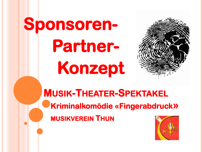 SponsorenPartnerKonzept MUSIK-THEATER-SPEKTAKEL Kriminalkomödie «Fingerabdruck» MUSIKVEREIN THUN Idee für das Projekt Eine Kriminalkomödie wird abwechselnd zur Musik aufgeführt. Die Komödie «Fingerabdruck» wird von Schauspielern gespielt. So erleben die Gäste einen abwechslungsreichen Abend mit Musik und Theater. Das Drum Corps des Musikvereins wird nach einer kurzen Pause den Abend ausklingen lassen. Der Bärensaal Thun Dürrenast ist Aufführungsort. Der musikalische Teil wird vor der Bühne (Orchestergraben) gespielt und das Theater in zwei Bildern auf der Bühne. Musikverein Thun Kriminalkomödie Fingerabdruck Der Musikverein Thun stellt ein abwechslungsreiches und ansprechendes Unterhaltungsmusikprogramm zusammen, bei dem die Thematik eines Krimis musikalisch dargestellt wird. Kriminalkomödie Fingerabdruck Thun, 10. Juni 1981 Eine überraschende Wende erzeugt Spannung bis zum Schluss. Musikverein Thun Kriminalkomödie Fingerabdruck Die Tage auf der Polizeiwache sind lange geworden. Da es in der Gegend nur wenige Polizeieinsätze gibt, befürchtet Chefpolizist Dürr, dass die Dienststelle geschlossen wird. So glimmt der Posten auf, wenn sich nur das kleinste im Quartier tut. Ein raffinierter Banküberfall stellt das Team von Dürr auf die Probe. Nicht zuletzt führen verdächtige Spuren in die eigenen Reihen. Show Act mit dem Drum Corps MV Thun Im Anschluss an die Kriminalkomödie Fingerabdruck werden die Zuhörerinnen und Zuhörer einen kurzen aber Intensiven Show Teil des Drum Corps MV Thun miterleben. Musikverein Thun Kriminalkomödie Fingerabdruck Der Musikverein Thun Seit jeher steht in unserem Verein die Freude am Musizieren und die Kameradschaft im Vordergrund. Unsere Proben finden wöchentlich ein Mal in der Schulanlage Schönau Thun statt, vor Konzerten oftmals auch zwei Mal. Während des Jahres nimmt der Musikverein Thun an rund einem Dutzend Anlässen teil und präsentiert sich der Öffentlichkeit. Seit Beginn des Jahres (2015) werden wir von unserem neuen musikalischen Leiter, Adrian Germann, tatkräftig unterstützt und gefördert. Musikverein Thun Kriminalkomödie Fingerabdruck Der Musikverein Thun wurde 1919 als Unionsmusik gegründet und ein Jahr später in die Arbeitermusik Thun umbenannt. Im Jahr 2003 erhielt er seinen heutigen Namen. Heute wirken rund 40 Musikantinnen und Musikanten und 12 Drummer aktiv im Musikverein Thun mit, der dem Schweizerischen Blasmusikverband angeschlossen ist. Es ist uns ein grosses Anliegen, als Teil der Stadt Thun Traditionen zu wahren und sind deshalb auch am Ausschiesset und anderen traditionellen Anlässen beteiligt. Auch das Drum Corps ist seit geraumer Zeit ein Bestandteil des Musikverein Thun. Die Proben finden jeden Montag in der Schulanlage Schönau Thun statt. Unter der Leitung von Peter Bürki bieten sie Showtrommeln auf hohem Niveau. Ein sehenswertes Spektakel für Jung und Alt. Musikverein Thun Kriminalkomödie Fingerabdruck Uns liegt viel daran auch in Zukunft erfolgreich musizieren zu können und uns weiter zu entwickeln. Wir heissen neue Mitglieder herzlich Willkommen und sind gerne bereit Schnupperproben zu organisieren. Letzte Projekte Freilichttheater 2010 «dr pfarrer het’s gwüsst» «xerxes und das magische buch» Musik-Theater-Spektakel 2016 «frieda glühbirn und die zeitmaschine» Musikverein Thun Kriminalkomödie Fingerabdruck Musik -Theater-Spektakel 2015 Das neue Projekt «Kriminalkomödie Fingerabdruck» 2 Aufführungen im Frühsommer 2017 (Juni) 150 Personen pro Vorstellung Restaurations-Betrieb im Bärensaal Thun Dürrenast Begleitung durch Medienpartnerschaft Überregionale Ausstrahlung Musikverein Thun Kriminalkomödie Fingerabdruck Das Musik-Theater-Spektakel wird von Adrian Germann speziell für den Musikverein Thun geschrieben. Im Juni gelangen die Zuschauer an eine spektakuläre Uraufführung. Das Organisationskomitee Thun Gesamtkoordination Adrian Germann Thun Projektleitung, Regie,Werbung Katharina Kessler Thun Finanzen, Gastronomie Sabrina Gurtner Oberdiessbach Vorverkauf Karin & Peter Bürki Steffisburg Sponsoring Musikverein Thun Kriminalkomödie Fingerabdruck Andrea Hauert Ort/Aufführungen Bärensaal Thun Dürrenast, Frutigenstrasse 68d, 3604 Thun P1 P2 P3 P4 Musikverein Thun Kriminalkomödie Fingerabdruck Parkplätze P1 Migros Dürrenast / P2 KK Thun / P3 Lachenwiese / P4 Lachenareal Termine / Ablauf Samstag, 10. Juni 2017, 20.15 Uhr Sonntag, 11. Juni 2017, 10.00 Uhr Sonntag 18.30 09.00 Nachtessen bis 20.00 Kriminalkomödie Fingerabdruck Teil I 20.15 10.00 21.30 11.15 22.00 11.45 22.45 12.30 23.00 12.45 Pause Kriminalkomödie Fingerabdruck Teil II Show Act Drum Corps MV Thun Ausklang ab Musikverein Thun Kriminalkomödie Fingerabdruck Saalöffnung Samstag Das Budget Fr. Fr. Fr. Fr. Fr. 3‘200 2‘000 2‘000 2‘700 1‘500 Fr. 11‘400 Eintritte (Ticketpreis) CHF 55.- VIP- Paket Eintritte (Ticketpreis) CHF 15.- SA/ Erwachsene Eintritte (Ticketpreis) CHF 12.- SO/ Erwachsene Eintritte (Ticketpreis) CHF 5.- SA/SO/ Kinder 6 - 16 Jahre Total Eintritte Samstag & Sonntag (Erwartete Summe) Tombola Sponsoren (Erwartete Summe) Restauration Einnahmen Fr. 3‘200 Fr. 1‘700 Fr. 3‘000 Fr. 3‘500 Fr. 11‘400 Einnahmen Überschuss Fr. 0 Musikverein Thun Kriminalkomödie Fingerabdruck Gastronomie Saalmiete Marketing, Werbung Werk, Proben, Bühnenbild Diverses ____________________________________________________ Ausgaben Kontakte Sponsoring Ansprechpersonen Musikverein Thun Kriminalkomödie Fingerabdruck Peter & Karin Bürki Ziegeleistrasse 46, 3612 Steffisburg Mobile: 079 484 06 79 Mobile: 079 295 61 11 Mail: [email protected] Gegenleistung für Sponsor-Partner Miss Marple Sponsor CHF 1000 Inbegriffen: 6 VIP - Sitzplätze Sa, 10. Juni 2017 6 x 1 Glas Prosecco 6 x Nachtessen: Salat Kalte Tomaten-Melonen Suppe Teigtasche Roastbeef mit Kartoffelstock und Gemüse 6 x Dessert nach Wahl 3 Fl. Wein 10 Einfache Eintritte Erwachsene 10 Eintritte für Sa oder So, 10./11. Juni 2017 Logopräsentation a