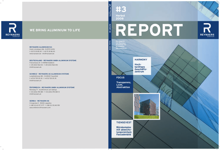 #3 Herbst 2008 Oude Liersebaan 266 · B-2570 Duffel t +32 15 30 85 00 · f +32 15 30 86 00 www.reynaers.be · [email protected] Herbst 2008 REYNAERS ALUMINIUM N.V. REPORT #3 WE BRING ALUMINIUM TO LIFE REPORT Ein Magazin von Reynaers Aluminium für Architekten und Investoren Harmony Deutschland - REYNAERS GMBH Aluminium Systeme Franzstrasse 25 · D-45968 Gladbeck t +49 2043 964 00 · f +49 2043 964 010 [email protected] Hoch­karätiges Geschäftszentrum Schweiz - REYNAERS AG Aluminium Systeme Langfeldstrasse 88 · CH-8500 Frauenfeld t +41 52 725 05 30 · f +41 52 725 05 35 [email protected] Österreich - REYNAERS GMBH Aluminium Systeme FOCUS Transparenz, Licht, Abstraktion Rennweg 77 · A-2345 Brunn am Gebirge t +43 2236 378 380 · f +43 2236 378 380 13 [email protected] serbia - REYNAERS se Crnogorska 5 · 35000 Jagodina t +381 (0) 63 117 5 177 · f +381 (0) 35 243 951 [email protected] Tiensevest Bürokomplex mit abwechslungsreichem Fassadenbild #3 CW 50-SC (siehe unter Produkte, Seite 56) Verantwortlicher Herausgeber: Peggy Caluwaert Produktion: RSM co-publishers RR3 02-03 080905.indd 1 11-09-2008 10:57:41 Transparenz E in Buch lässt sich nicht anhand seines Umschlags beurteilen, so eine Redensart. Anwohner, Passanten etc. jedoch beurteilen zahlreiche Gebäude eben gerade anhand ihres Äußeren. Natürlich umfasst Architektur auch Aspekte wie Raum, Licht, Konstruktion und vieles andere mehr. Der erste und häufig einzige Eindruck, den wir von einem Gebäude erhalten, wird meist durch dessen Fassaden bestimmt. Die Außengestaltung stellt daher einen ganz wesentlichen architektonischen Bestandteil dar. Der Ästhetik der Fassade und dem Profilsystem-Design gilt in dieser dritten Ausgabe von Reynaers Report unser besonderes Augenmerk. Das zentrale Thema heisst Transparenz. Immer wieder werden wir mit einem Paradoxon konfrontiert: für viele Architekten verbirgt sich der ästhetische Wert unserer Systeme nämlich gerade in deren Unsichtbarkeit. Das heißt oftmals: je weniger die Profile auffallen, umso besser. Der Trend weist eindeutig in Richtung abstrakter Perfektion und totaler Transparenz, was ein Streben nach gerader Linienführung, klaren und reinen Details, minimalen Profilansichten und Ganzglaslösungen nach sich zieht. Gleichzeitig aber werden auch höhere Anforderungen an Wärmedämmung und Komfort gestellt. Reynaers Aluminium ist vollumfänglich auf diese Anforderungen eingestellt. Mit einem breiten Sortiment, und nach Bedarf mit spezifischen Lösungen, erfüllt Reynaers Aluminium die Nachfrage an Systemen, die eine solche Schönheit besitzen, dass sie dem Blick fast entzogen sind. Edgar van Ginkel, Geschäftsführer Reynaers Niederlande in dieser ausgabe 4 56 Transparenz, Licht, Abstraktion Transparente Systeme für Fenster, Türen und Fassaden focus 10 58 Bürokomplex Tiensevest, Löwen 10 Tala Island, Amwaj 20 Harmony Office Center, Warschau 28 Wohnhaus in Teteringen, Niederlande 36 East Building, Prag 44 Avilon Plaza, Moskau 50 Eine Auswahl an Reynaers Projekten projekte RR3 02-03 080905.indd 2 produkte referenZEN 11-09-2008 10:57:50 4 RR3 04-09 080905.indd 4 09-09-2008 14:52:32 focus Transparenz, Licht, Abstraktion 5 Starke Trends in der modernen Architektur Text: Hans Ibelings T ransparenz, Licht, Abstraktion. Es sind solch starke Trends der gegenwärtigen Architektur, die Reynaers Aluminium vor die Herausforderung stellen, ihre Systeme in einer Weise zu verfeinern, dass sich der angestrebte architektonische Effekt in optimaler Weise realisieren lässt. RR3 04-09 080905.indd 5 09-09-2008 14:52:35 Der Trend hin zu mehr Transparenz, der heute in der Architektur so spürbar ist, kommt nicht aus dem Nichts. Schon seit mindestens 100 Jahren lassen sich Designer von der Herausforderung der Schwerkraft faszinieren. Mit fragilen Konstruktionen, augenscheinlich schwebenden Objekten, großen Bögen, dynamischen Gleichgewichten und offenen Winkeln wird die Illusion geweckt, dass sich ein Gebäude der Schwerkraft entziehen kann. Transparenz ist wie kein anderes Phänomen dazu geeignet, das enorme Gewicht eines Gebäudes zu negieren. Neben Transparenz suchen zahlreiche Architekten aber auch nach Mitteln, die Erscheinungsform eines Gebäudes weitestgehend zu abstrahieren. Und dies mit einem Mindestmaß an Details, Linien und möglichst wenig störenden Elementen. Im Rahmen dieser Tendenz stellt ein Fenster nicht mehr als eine funktionale Öffnung in einer starren Wand dar. 6 Produktinnovationen Bei der Suche nach Transparenz und Abstraktion gehen Kreativität und Produktinnovationen Hand in Hand. Diese Nachfrage erzeugt ein Produktangebot, und die angebotenen Produkte wiederum regen zu neuen Anwendungsmöglichkeiten an. Mit einer breiten Palette an Fassaden- und anderen Systemen entspricht das Unternehmen dem Trend hin zu Transparenz und Entmaterialisierung. Edgar van Ginkel, Geschäftsführer von Reynaers Niederlande, erkennt, dass die Nachfrage aus dem Markt zum großen Teil durch allgemeinere Tendenzen in der Architektur bestimmt werden, und nicht zu vergessen von den Vorschriften. Van Ginkel: ‘Darüber hinaus bieten wir projektweise spezifische Lösungen an, basierend auf einem focus Wertvolle Beratungsleistungen Van Ginkel erkennt dieses Streben nach schlanken Profilen überall, hat aber auch den Eindruck, dass in manchen Ländern die Architekten mit den auferlegten gesetzlichen Regelungen und Bauvorschriften besser umzugehen wissen. ‘Die niederländischen Architekten sind meiner Ansicht nach im Allgemeinen sehr kreativ. Ein gutes Beispiel dafür ist Jacq. de Brouwer, ein Architekt, mit dem wir bereits seit geraumer Zeit zusammenarbeiten.’ Jacq. de Brouwer ist einer der Namensgeber des Architekturbüros Bedaux de Brouwer, einer im Süden der Niederlande gelegenen Agentur, die sich durch eine maß- Bei den Architekten ist eindeutig eine Nachfrage nach Fassaden­ systemen mit möglichst schlanken Profilen festzustellen Basisprodukt unseres Unternehmens.’ Bei Reynaers in die 