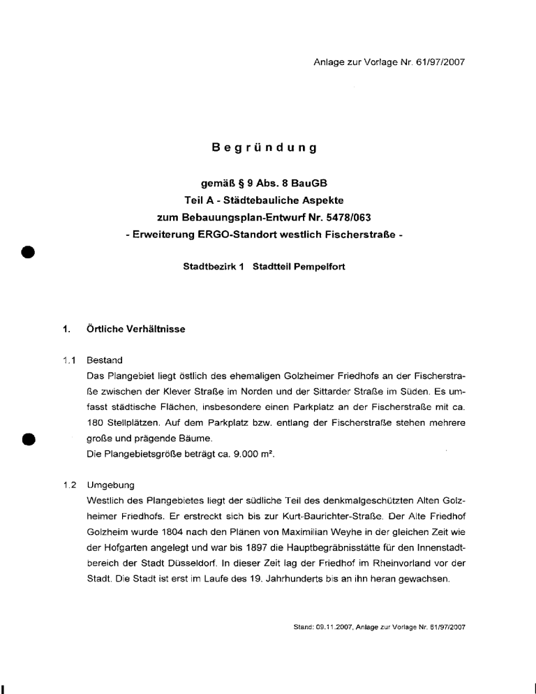 Anlage zur Vorlage Nr. 61/97/2007 Begründung gemäß § 9 Abs. 8 BauGB Teil A - Städtebauliche Aspekte zum Bebauungsplan-Entwurf Nr. 5478/063 - Erweiterung ERGO-Standort westlich Fischerstraße - • Stadtbezirk 1 Stadtteil Pempelfort 1. Örtliche Verhältnisse 1.1 Bestand Das Plangebiet liegt östlich des ehemaligen Golzheimer Friedhofs an der Fischerstraße zwischen der Klever Straße im Norden und der Sittarder Straße im Süden. Es umfasst städtische Flächen, insbesondere einen Parkplatz an der Fischerstraße mit ca. 180 Stellplätzen. Auf dem Parkplatz bzw. entlang der Fischerstraße stehen mehrere • große und prägende Bäume. Die PIangebietsgröße beträgt ca. 9.000 m2 . 1.2 Umgebung Westlich des Plangebietes liegt der südliche Teil des denkmalgeschützten Alten Golzheimer Friedhofs. Er erstreckt sich bis zur Kurt-Baurichter-Straße. Der Alte Friedhof Golzheim wurde 1804 nach den Plänen von Maximilian Weyhe in der gleichen Zeit wie der Hofgarten angelegt und war bis 1897 die Hauptbegräbnisstätte für den Innenstadtbereich der Stadt Düsseldorf. In dieser Zeit lag der Friedhof im Rheinvorland vor der Stadt. Die Stadt ist erst im Laufe des 19. Jahrhunderts bis an ihn heran gewachsen. Stand: 09.11.2007, Anlage zur Vorlage Nr. 61/97/2007 -2In dieser Zeit ist der Friedhof mehrfach um Flächen erweitert worden, die jedoch nach der Eröffnung der weiter außerhalb liegenden Friedhöfe (Nord- und Südfriedhof) zum Ende des 19. Jahrhunderts wieder aufgegeben wurden und heute bebaut sind. Auf dem Gelände, für das dieser Bebauungsplan aufgestellt wird, haben sich bauliche Anlagen für eine Aussegnungshalle, eine Remise sowie Anlagen für die städtische Gärtnerei befunden. Erst in den 60er Jahren des 20. Jahrhunderts wurden diese städtischen Nutzungen zugunsten des Parkplatzes aufgegeben, der damals für die Messe eingerichtet wurde, die sich auf den Flächen des 2. und 3. Bauabschnitts des Gebäudeensembles der VICTORIA-Versicherungen befand. • Auf dem Friedhof befinden sich die Gräber berühmter Düsseldorfer Persönlichkeiten. So sind hier neben Maximilian Weihe auch berühmte Künstler wie Friedrich Wilhelm von Schadow oder Persönlichkeiten der Kultur wie Carl Leberecht Immermann begraben. Unter den ca. 350, teilweise historisch und künstlerisch wertvollen Grabmälern und Statuen befinden sich auch die GrabsteIlen vieler alteingesessener Düsseldorfer Familien. Der Friedhof wird heute zur Erholung und als Park genutzt und ist durch dichten Baumbestand gekennzeichnet. Er übernimmt eine wichtige Rolle als Grün- und Freifläche für die angrenzenden, dicht bebauten, gründerzeitlichen Wohnviertel. Eine Mauer entlang des Friedhofs nimmt die Höhendifferenz von ca. 1,5 m zwischen dem höher gelegenen Friedhofsgelände und den umgebenden Verkehrsflächen auf. Im Südwesten, unmittelbar an das Plangebiet angrenzend, steht das so genannte • "Künstleratelierhaus" von 1906, ein sechsgeschossiges, freistehendes Gebäude mit Ateliers und Künstlerwohnungen. Südlich der Sittarder Straße schließt die Hauptverwaltung der ERGO Versicherungsgruppe AG und der VICTORIA Versicherung AG an. Hinter einem Vorplatz folgt stadteinwärts eine straßenbegleitende Bebauung an der Fischerstraße mit 7 bis 9 Geschossen. Im rückwärtigen Bereich des Vorplatzes ist in die 7- bis 8-geschossige Gebäudestruktur der ERGO- und VICTORIA-Hauptverwaltung der 110m hohe VICTORIA-Turm mit seinen 28 Geschossen integriert, der die Skyline der nördlichen Innenstadt prägt. Stand: 09.11 .2007, Anlage zur Vorlage Nr. 61/ 12007 -3Jenseits der Fischerstraße schließt eine gemischt genutzte Bebauung an, die im Wesentlichen noch die Züge des ursprünglichen gründerzeitlichen Wohnquartiers bewahrt hat. Die reine Wohnnutzung wird heute mit einem wachsenden Anteil von Dienstleistungsnutzungen durchmischt. Das Quartier hat seinen Versorgungsschwerpunkt an der Nordstraße und der Münsterstraße, ca. 300m östlich des Plangebietes. Die dem Plangebiet an der Fischerstraße östlich gegenüber liegende Bebauung ist durch vier- bis sechsgeschossige Gebäude unterschiedlichen Alters und unterschiedli- • cher Nutzungen geprägt. Nördlich der einmündenden Cordobastraße steht die Kirche Sankt Adolfus. An der Fischerstraße, der Kirche zugeordnet, befinden sich ein eingeschossiger Kindergarten und ein dreigeschossiges Wohnhaus. 1.3 Verkehr Das Plangebiet ist von der Fischerstraße erschlossen. Die Fischerstraße ist Teil der Stadtradialen Hofgartenstraße. Kaiserstraße, - Fischerstraße - Kennedydamm I Kaiserswerther Straße Richtung Norden. Unter der Fischerstraße verläuft die Untergrund-Stadtbahnlinie 78/79. Der südliche Ausgang der U-Bahn-Haltestelle Victoriaplatz I Klever Straße liegt in Höhe der Cordobastraße unmittelbar vor dem Plangebiet. Am Ausgang der U-Bahn liegt eine Bushal- • testelle, die von der Linie 722 angefahren wird . Der auf dem Gelände befindliche Parkplatz wird von unterschiedlichen Nutzergruppen frequentiert. Er ist in der Zeit von 11 Uhr vormittags bis 17 Uhr nachmittags an Werktagen bewirtschaftet (gebührenpflichtig). 2. Bisheriges Planungsrecht 2.1 Flächennutzungsplan Das Plangebiet liegt innerhalb der im gültigen Flächennutzungsplan als öffentliche Grünfläche mit den Zweckbestimmungen Friedhof und Parkanlage dargestellten Abgrenzung für den Golzheimer Friedhof. Stand: 09.11.2007, Anlage zur Vorlage Nr. 61/ f2007 -4Als Parkplatz ist das Plangebiet jedoch von der Nutzung der lediglich als Linienelement dargestellten Fischerstraße zuzuordnen. Aufgrund der geringen Größe und Ost-WestAusdehnung der Fläche wurde bei der Aufstellung des heutigen Flächennutzungsplans auf eine gesonderte Darstellung des Parkplatzes verzichtet. Das Plangebiet liegt innerhalb des gültigen im Flächennutzungsplan (FNP) als öffentliche Grünfläche mit den Zweckbestimmungen Friedhof und Parkanlage dargestellten Bereiches des Golzheimer Friedhofs. Aufgrund der geringen Ost- /Westausdehnung d