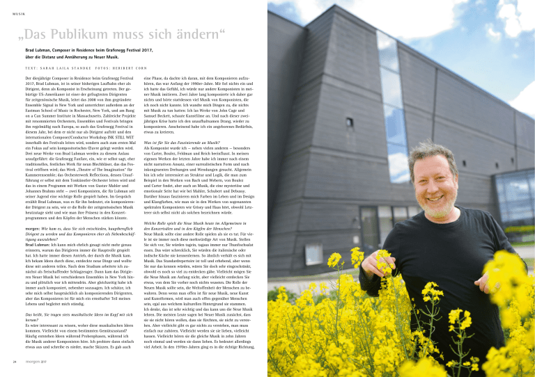 Musik „Das Publikum muss sich ändern“ Brad Lubman, Composer in Residence beim Grafenegg Festival 2017, über die Distanz und Annäherung zu Neuer Musik. TExT: SARAH LAILA STANDKE FOTOS: HERIBERT CORN Der diesjährige Composer in Residence beim Grafenegg Festival 2017, Brad Lubman, ist in seiner bisherigen Laufbahn eher als Dirigent, denn als Komponist in Erscheinung getreten. Der gebürtige US-Amerikaner ist einer der gefragtesten Dirigenten für zeitgenössische Musik, leitet das 2008 von ihm gegründete Ensemble Signal in New York und unterrichtet außerdem an der Eastman School of Music in Rochester, New York, und am Bang on a Can Summer Institute in Massachusetts. Zahlreiche Projekte mit renommierten Orchestern, Ensembles und Festivals bringen ihn regelmäßig nach Europa, so auch das Grafenegg Festival in diesem Jahr, bei dem er nicht nur als Dirigent auftritt und den internationalen Composer/Conductor Workshop INK STILL WET innerhalb des Festivals leiten wird, sondern auch zum ersten Mal ein Fokus auf sein kompositorisches Œuvre gelegt werden wird. Drei neue Werke von Brad Lubman werden zu diesem Anlass uraufgeführt: die Grafenegg Fanfare, ein, wie er selbst sagt, eher traditionelles, festliches Werk für neun Blechbläser, das das Festival eröffnen wird; das Werk „Theatre of The Imagination“ für Kammerensemble; das Orchesterwerk Reflections, dessen Uraufführung er selbst mit dem Tonkünstler-Orchester leiten wird und das in einem Programm mit Werken von Gustav Mahler und Johannes Brahms steht — zwei Komponisten, die für Lubman seit seiner Jugend eine wichtige Rolle gespielt haben. Im Gespräch erzählt Brad Lubman, was es für ihn bedeutet, ein komponierender Dirigent zu sein, wie er die Rolle der zeitgenössischen Musik heutzutage sieht und wie man ihre Präsenz in den Konzertprogrammen und den Köpfen der Menschen stärken könnte. morgen: Wie kam es, dass Sie sich entschieden, hauptberuflich Dirigent zu werden und das Komponieren eher als Nebenbeschäftigung auszuleben? Brad Lubman: Ich kann mich ehrlich gesagt nicht mehr genau erinnern, warum das Dirigieren immer die Hauptrolle gespielt hat. Ich hatte immer diesen Antrieb, der durch die Musik kam. Ich bekam Ideen durch diese, entdeckte neue Dinge und wollte diese mit anderen teilen. Nach dem Studium arbeitete ich zunächst als freischaffender Schlagzeuger. Dann kam das Dirigieren Neuer Musik bei verschiedenen Ensembles in New York hinzu und plötzlich war ich mittendrin. Aber gleichzeitig habe ich immer auch komponiert, nebenher sozusagen. Ich schätze, ich sehe mich selbst hauptsächlich als komponierenden Dirigenten, aber das Komponieren ist für mich ein ernsthafter Teil meines Lebens und begleitet mich ständig. Das heißt, Sie tragen stets musikalische Ideen im Kopf mit sich herum? Es wäre interessant zu wissen, woher diese musikalischen Ideen kommen. Vielleicht von einem bestimmten Gemütszustand? Häufig entstehen Ideen während Probenphasen, während ich die Musik anderer Komponisten höre. Ich probiere dann einfach etwas aus und schreibe es nieder, mache Skizzen. Es gab auch 24 morgen 3/17 eine Phase, da dachte ich daran, mit dem Komponieren aufzuhören, das war Anfang der 1990er-Jahre. Mir fiel nichts ein und ich hatte das Gefühl, ich würde nur andere Komponisten in meiner Musik imitieren. Zwei Jahre lang komponierte ich daher gar nichts und hörte stattdessen viel Musik von Komponisten, die ich noch nicht kannte. Ich wandte mich Dingen zu, die nichts mit Musik zu tun hatten: Ich las Werke von John Cage und Samuel Beckett, schaute Kunstfilme an. Und nach dieser zweijährigen Krise hatte ich den unaufhaltsamen Drang, wieder zu komponieren. Anscheinend habe ich ein angeborenes Bedürfnis, etwas zu kreieren. Was ist für Sie das Faszinierende an Musik? Als Komponist wurde ich — neben vielen anderen — besonders von Carter, Boulez, Feldman und Reich beeinflusst. In meinen eigenen Werken der letzten Jahre habe ich immer nach einem nicht narrativen Ansatz, einer surrealistischen Form und nach inkongruenten Drehungen und Wendungen gesucht. Allgemein bin ich sehr interessiert an Struktur und Logik, die man zum Beispiel in den Werken von Bach und Webern, von Boulez und Carter findet, aber auch an Musik, die eine mysteriöse und emotionale Seite hat wie bei Mahler, Schubert und Debussy. Darüber hinaus faszinieren mich Farben im Leben und im Design und Klangfarben, wie man sie in den Werken von sogenannten spektralen Komponisten wie Grisey und Haas hört, obwohl Letzterer sich selbst nicht als solchen bezeichnen würde. Welche Rolle spielt die Neue Musik heute im Allgemeinen in den Konzertsälen und in den Köpfen der Menschen? Neue Musik sollte eine andere Rolle spielen als sie es tut. Für viele ist sie immer noch diese merkwürdige Art von Musik. Stellen Sie sich vor, Sie würden tagein, tagaus immer nur Thunfischsalat essen. Das wäre schrecklich, Sie würden die italienische oder indische Küche nie kennenlernen. So ähnlich verhält es sich mit Musik. Das Standardrepertoire ist toll und erhebend, aber wenn Sie nur das kennen würden, wären Sie doch sehr eingeschränkt, obwohl es noch so viel zu entdecken gäbe. Vielleicht mögen Sie die Neue Musik am Anfang nicht, aber vielleicht entdecken Sie etwas, von dem Sie vorher noch nichts wussten. Die Rolle der Neuen Musik sollte sein, die Weltoffenheit der Menschen zu bewahren. Denn wenn man offen ist für neue Musik, neue Kunst und Kunstformen, wird man auch offen gegenüber Menschen sein, egal aus welchem kulturellen Hintergrund sie stammen. Ich denke, das ist sehr wichtig und das kann uns die Neue Musik lehren. Die meisten Leute sagen bei Neuer Musik zunächst, dass sie sie nicht hören wollen, dass sie fürchten, sie nicht zu verstehen. Aber vielleicht gibt es gar nichts zu verstehen, man muss einfach nur zuhören. Vielleicht werden sie sie lieben, vielleicht hassen. Vielleicht hören sie die gleiche Musik in zehn Jahren noch einmal und werden sie da