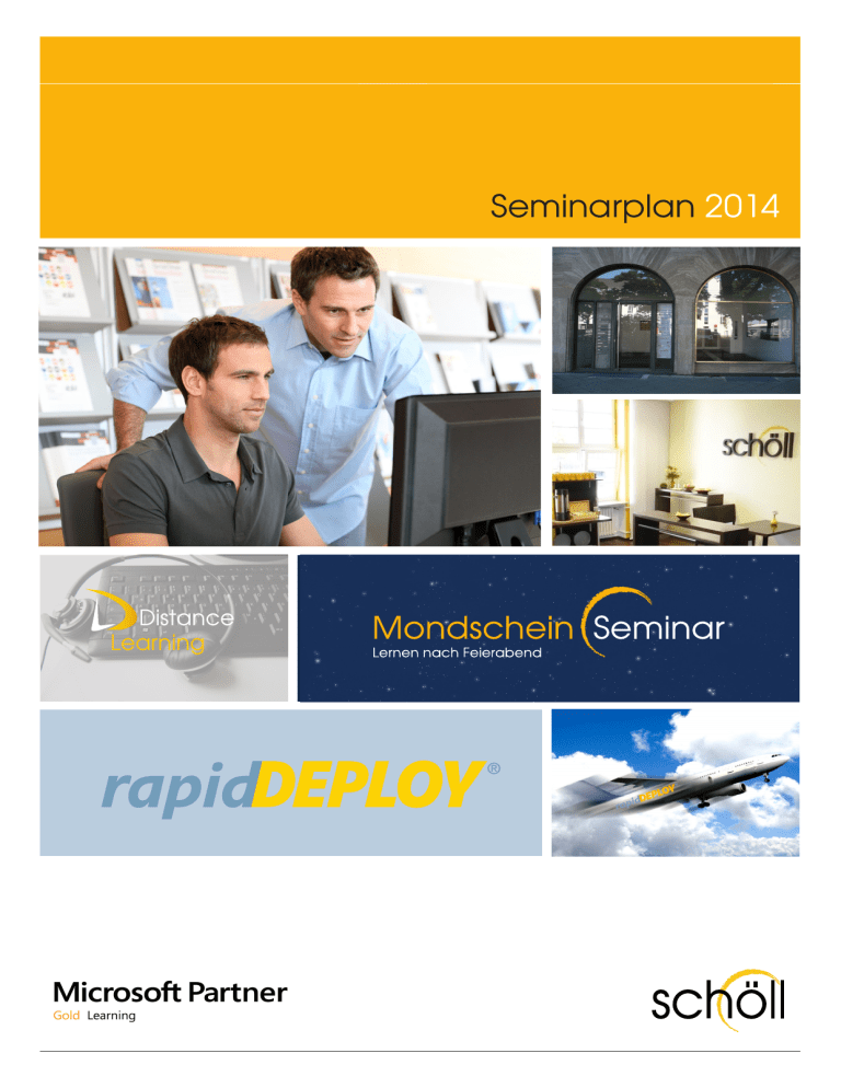Seminarplan 2014 Distance Learning Vorwort 3 Liebe Kunden und Interessenten, wir freuen uns, Ihnen unseren neuen Seminarplan 2014 zu präsentieren. Wir stellen Ihnen ein rundum aktualisiertes Trainingsangebot bereit. Es stellt die Grundlage für Qualifizierungsmaßnahmen von Einzelpersonen, als auch Ideengeber für Team- und projektbegleitende Trainings dar. Für projektbegleitende Trainings und Dienstleistungen stellen wir Ihnen auch gerne unser rapidDeploy®-Konzept vor, das Ihnen neben hochwertigen Schulungsinhalten auch Zeit- und Kostenvorteile bringt. Ganz neu bieten wir Ihnen IT-Zertifizierungen im Mondschein-Seminar jetzt auch als Distance Learning mit Live-Trainer an, sodass der erfolgreiche Abschluss bei maximaler Flexibilität garantiert ist. Wir freuen uns auf ein spannendes Trainingsjahr 2014! Frauke Behrens Udo Schöll 4 Inhaltsverzeichnis Allgemeiner Teil Allgemeine Informationen 10 Schöll Trainingszentren Trainingszentrum Trainingszentrum Trainingszentrum Trainingszentrum Trainingszentrum Trainingszentrum Trainingszentrum Trainingszentrum Trainingszentrum München Berlin Hamburg Hannover Essen Köln Darmstadt Frankfurt Ulm 14 15 16 17 18 19 20 21 22 rapidDeploy® Rolloutbegleitung mit rapidDeploy® für Windows und Office24 Zertifizierungen Mondscheinseminar: Zertifizierung in der perfekten Lernform MCSA Windows Serve 2012 MCSA Windows Server 2008 MCSE Server Infrastructure MCSE Desktop Infrastructure MCSE Private Cloud MCSA Windows 8 MCSA SQL Server 2012 MCSE Data Platform MCSE Exchange Server 2013 LPI1 und LPI2 30 32 32 33 34 35 36 37 38 39 40 Seminare MOC MOC MOC MOC MOC MOC MOC MOC MOC MOC 6421 Configuring and Troubleshooting a Windows Server 2008 Network Infrastructure 46 6425 Configuring Windows Server 2008 Active Directory Domain Services 47 6426 Configuring Identity and Access Solutions with Windows Server 2008 Active Directory 47 6428 Configuring and Troubleshooting Windows Server 2008 Terminal Services 48 6433 Planning and Implementing Windows Server 2008 Servers 48 6435 Designing a Windows Server 2008 Network Infrastructure 49 6436 Designing a Windows Server 2008 Active Directory Infrastructure and Services 49 6439 Configuring and Troubleshooting Windows Server 2008 Application Infrastructure 50 10215 Implementing and Managing Microsoft Server Virtualization 50 10324 Implementing and Managing Desktop Virtualization 51 System Center 2012 MOC MOC MOC MOC 10747 Administering System Center 2012 Configuration Manager 52 10748 Deploying System Center 2012 Configuration Manager 52 10750 Monitoring and Operating a Private Cloud with System Center 2012 53 10751 Configuring and Deploying a Private Cloud with System Center 2012 53 PowerShell Windows Server 2012 MOC MOC MOC MOC MOC MOC MOC MOC 20410 Installing and Configuring Windows Server 2012 42 20411 Administering Windows Server 2012 42 20412 Configuring Advanced Windows Server 2012 Services 43 20413 Designing and Implementing a Server Infrastructure 43 20414 Implementing an Advanced Server Infrastructure 4 4 20415 Implementing a Desktop Infrastructure 44 20416 Implementing Desktop Application Environments45 20417 Upgrading Your Skills to MCSA Windows Server 2012 45 Windows Server 2008 MOC 6416 Updating Your Network Infrastructure and Active Directory Technology Skills to Windows Server 2008 46 MOC 10961 Automating Administration with Windows PowerShell 3.0 54 Windows 8 MOC 20687 Configuring Windows 8 MOC 20688 Managing and Maintaining Windows 8 MOC 20689 Upgrading Your Skills to MCSA Windows 8 55 55 56 Windows 7 MOC MOC MOC MOC 6292 6294 Installing and Configuring Windows 7 57 Planning and Managing Windows 7 Desktop Deployments and Environments 57 50331 Windows 7 Enterprise Desktop Support Technician58 6293 Troubleshooting and Supporting Windows 7 in the Enterprise 58 SQL Server 2012 MOC 10774 Querying Microsoft SQL Server 2012 59 Inhaltsverzeichnis MOC MOC MOC MOC MOC MOC MOC 10775 Administering Microsoft SQL Server 2012 Databases 59 10776 Developing Microsoft SQL Server 2012 Databases60 10777 Implementing a Data Warehouse with Microsoft SQL Server 2012 60 10778 Implementing Data Models and Reports with Microsoft SQL Server 2012 61 20465 Designing Database Solutions for Microsoft SQL Server 2012 61 20467 Designing Business Intelligence Solutions with Microsoft SQL Server 2012 62 40008 Updating your Database Skills to Microsoft SQL Server 2012 62 SQL Server 2008 MOC MOC MOC MOC MOC MOC 2778 6231 6232 6234 6235 6236 Writing Queries Using Microsoft SQL Server 2008 Transact-SQL 63 Maintaining a Microsoft SQL Server 2008 Database 63 Implementing a Microsoft SQL Server 2008 Database 64 Implementing and Maintaining Microsoft SQL Server 2008 Analysis Services 64 Implementing and Maintaining Microsoft SQL Server 2008 Integration Services 65 Implementing and Maintaining Microsoft SQL Server 2008 Reporting Services 65 5 MOC 10174 Configuring and Managing Microsoft SharePoint 2010 72 MOC 10175 Microsoft SharePoint 2010, Application Development 72 Exchange Server 2013 MOC 20341 Core Solutions of Microsoft Exchange Server 2013 7 3 MOC 20342 Advanced Solutions of Microsoft Exchange Server 2013 73 Exchange Server 2010 MOC 10233 Designing and Deploying Messaging Solutions with Microsoft Exchange Server 2010 74 MOC 10135 Configuring, Managing and Troubleshooting Microsoft Exchange Server 2010 74 MOC 10508 Planning, Deploying and Managing Microsoft Exchange Server 2010 Unified Messaging 75 Lync Server 2013 MOC 20336 Core Solutions of Microsoft® Lync® Server 2013 76 MOC 20337 Enterprise Voice and Online Services with Microsoft® Lync® Server 2013 76 Lync Server 2010 MOC 10533 Deploying, Configuring and Administering Microsoft Lync Server 2010 77 MOC 10534 Planning and Designing a Microsoft Lync Server 2010 Solution 77 SharePoint 2013 MOC MOC MOC MOC MOC MOC MOC MOC MOC 20331 Core Solutions of Microsoft® SharePoint® Server 2013 66 20232 Advanced Solutions of Microsoft® SharePoint® Server 2013 66 20488 Developing Microsoft SharePoi