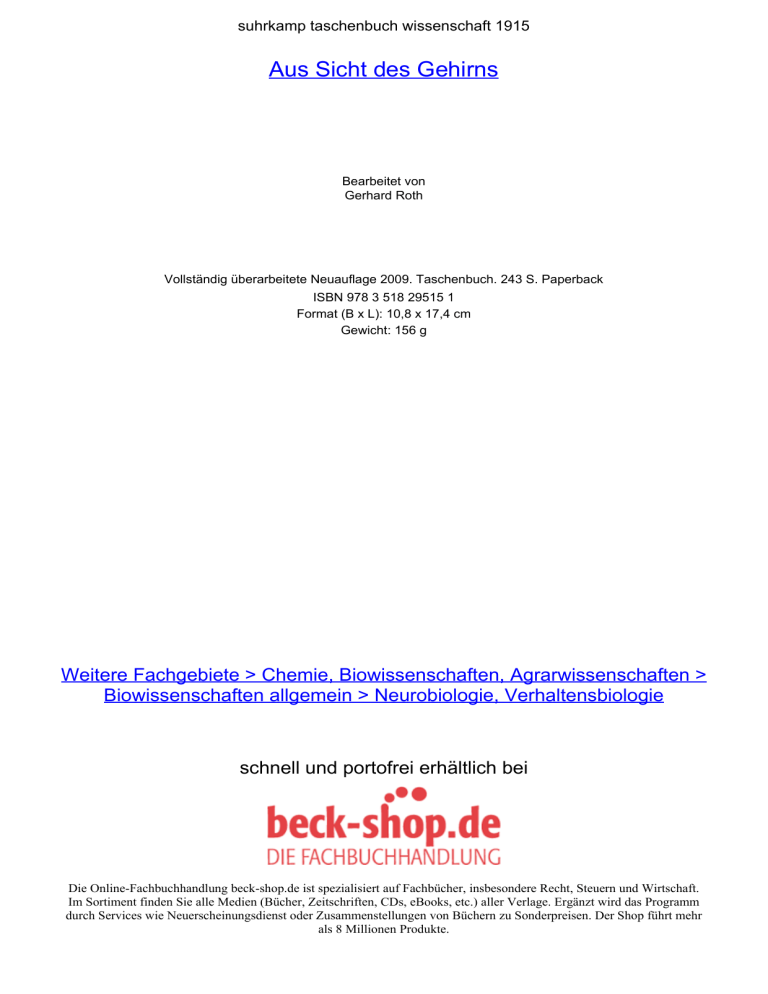 suhrkamp taschenbuch wissenschaft 1915 Aus Sicht des Gehirns Bearbeitet von Gerhard Roth Vollständig überarbeitete Neuauflage 2009. Taschenbuch. 243 S. Paperback ISBN 978 3 518 29515 1 Format (B x L): 10,8 x 17,4 cm Gewicht: 156 g Weitere Fachgebiete > Chemie, Biowissenschaften, Agrarwissenschaften > Biowissenschaften allgemein > Neurobiologie, Verhaltensbiologie schnell und portofrei erhältlich bei Die Online-Fachbuchhandlung beck-shop.de ist spezialisiert auf Fachbücher, insbesondere Recht, Steuern und Wirtschaft. Im Sortiment finden Sie alle Medien (Bücher, Zeitschriften, CDs, eBooks, etc.) aller Verlage. Ergänzt wird das Programm durch Services wie Neuerscheinungsdienst oder Zusammenstellungen von Büchern zu Sonderpreisen. Der Shop führt mehr als 8 Millionen Produkte. Suhrkamp Verlag Leseprobe Roth, Gerhard Aus Sicht des Gehirns Mit zahlreichen Abbildungen © Suhrkamp Verlag suhrkamp taschenbuch wissenschaft 1915 978-3-518-29515-1 suhrkamp taschenbuch wissenschaft 1915 Gerhard Roth verfolgt das Projekt, mithilfe der Erkenntnisse der modernen Neurobiologie und Hirnforschung Fragen zu beantworten, die von jeher Philosophen, Wissenschaftler und alle denkenden Menschen beschäftigt haben: Sind wir Menschen einzigartig? Wie entsteht unsere Bewusstseinswelt? Können wir die Welt erkennen, wie sie ist, oder nehmen wir nur Konstruktionen unseres Gehirns wahr? Auf was sollen wir hören: auf den Verstand oder die Gefühle? Wer oder was formt uns: Gene, das Unbewusste oder die Erziehung? Ist mein Wille frei? Diese und ähnliche Fragen werden in zwölf Kapiteln auf eine Weise behandelt, die keinerlei fachwissenschaftliche Vorkenntnisse erfordert. Das Buch präsentiert die Umrisse eines neuen Menschenbildes, das naturwissenschaftlich begründet ist und zugleich Einsichten der Geistes- und Sozialwissenschaften berücksichtigt. Gerhard Roth ist Professor für Verhaltensphysiologie an der Universität Bremen. Im Suhrkamp Verlag sind von ihm erschienen: Das Gehirn und seine Wirklichkeit (stw 1275), Fühlen, Denken, Handeln (stw 1678), Freiheit, Schuld und Verantwortung (mit Michael Pauen, eu 12) und Willensfreiheit und rechtliche Ordnung (hg. mit Ernst-Joachim Lampe und Michael Pauen, stw 1833) Gerhard Roth Aus Sicht des Gehirns Vollständig überarbeitete Neuauflage Suhrkamp Bibliografische Information der Deutschen Nationalbibliothek Die Deutsche Nationalbibliothek verzeichnet diese Publikation in der Deutschen Nationalbibliografie; detaillierte bibliografische Daten sind im Internet über http://dnb.d-nb.de abrufbar. suhrkamp taschenbuch wissenschaft 1915 © Suhrkamp Verlag Frankfurt am Main 2003, 2009 Alle Rechte vorbehalten, insbesondere das der Übersetzung, des öffentlichen Vortrags sowie der Übertragung durch Rundfunk und Fernsehen, auch einzelner Teile. Kein Teil des Werkes darf in irgendeiner Form (durch Fotografie, Mikrofilm oder andere Verfahren) ohne schriftliche Genehmigung des Verlages reproduziert oder unter Verwendung elektronischer Systeme verarbeitet, vervielfältigt oder verbreitet werden. Druck: Druckhaus Nomos, Sinzheim Printed in Germany Umschlag nach Entwürfen von Willy Fleckhaus und Rolf Staudt ISBN 978-3-518-29515-1 1 2 3 4 5 6 – 14 13 12 11 10 09 Inhalt Vorwort zur überarbeiteten Auflage . . . . . . . . . . . . . . . . . . . . 7 Vorwort . . . . . . . . . . . . . . . . . . . . . . . . . . . . . . . . . . . . . . . . . . 11 1. Eine kleine Hirnkunde . . . . . . . . . . . . . . . . . . . . . . . . . . . 2. Welt, Körper, Ich . . . . . . . . . . . . . . . . . . . . . . . . . . . . . . . 3. Was uns Menschen so klug macht . . . . . . . . . . . . . . . . . . 4. Wahrnehmung: Abbildung oder Konstruktion? . . . . . . . . 5. Die Spur der Erinnerungen . . . . . . . . . . . . . . . . . . . . . . . 6. Wer oder was bestimmt uns? . . . . . . . . . . . . . . . . . . . . . . 7. Geist und Gehirn . . . . . . . . . . . . . . . . . . . . . . . . . . . . . . . . 8. Ich und Es – die Welt der Persönlichkeit und des Psychischen . . . . . . . . . . . . . . . . . . . . . . . . . . . . . . 9. Verstand oder Gefühle – auf was sollen wir hören? . . . 10. Freiheit, die ich meine . . . . . . . . . . . . . . . . . . . . . . . . . . . . 11. Über die letzten Dinge . . . . . . . . . . . . . . . . . . . . . . . . . . . 12. Wissenschaft und Wahrheit . . . . . . . . . . . . . . . . . . . . . . . . 13 33 51 69 90 109 127 147 167 180 205 217 Weiterführende Literatur . . . . . . . . . . . . . . . . . . . . . . . . . . . . 233 Namenregister . . . . . . . . . . . . . . . . . . . . . . . . . . . . . . . . . . . . . 238 Sachregister . . . . . . . . . . . . . . . . . . . . . . . . . . . . . . . . . . . . 239 Vorwort zur überarbeiteten Auflage Die vorliegende Ausgabe ist eine vollständig überarbeitete Version des 2003 erstmalig erschienenen Buches Aus Sicht des Gehirns. Dessen Erscheinen fiel zeitlich zusammen mit dem Beginn der in der wissenschaftlichen wie medialen Öffentlichkeit heftig geführten Diskussion um die Willensfreiheit. Dabei waren das Kapitel 10 der bisherigen Fassung sowie die ausführlichere Darstellung in der überarbeiteten Auflage meines Buches Fühlen, Denken, Handeln, die zeitgleich ebenfalls im Suhrkamp Verlag erschien, vielzitierter Anlass zu Zustimmung und Kritik. Ich hatte geglaubt, in beiden Texten eine sowohl wissenschaftlich als auch philosophisch ausgewogene Position zu vertreten. Das wurde aber von einer Reihe von philosophischen Kritikern nicht so gesehen; vielmehr unterstellten sie, dass ich – neben anderen Neurobiologen – Willensfreiheit komplett als »Illusion« ablehne und sogar die Existenz eines Willens in Zweifel ziehe. Tatsächlich aber wandte ich mich nur gegen die traditionelle dualistisch-indeterministische Auffassung von Willensfreiheit, die allerdings nicht nur unserem alltäglichen Empfinden der Handlungssteuerung, sondern auch dem deutschen und kontinentaleuropäischen Strafrecht und seinem Schuldbegriff zugrunde liegt. Es dauerte einige Jahre, bi