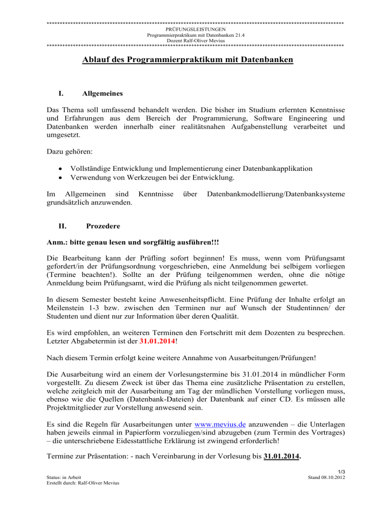 ***************************************************************************************************************** PRÜFUNGSLEISTUNGEN Programmierpraktikum mit Datenbanken 21.4 Dozent Ralf-Oliver Mevius ***************************************************************************************************************** Ablauf des Programmierpraktikum mit Datenbanken I. Allgemeines Das Thema soll umfassend behandelt werden. Die bisher im Studium erlernten Kenntnisse und Erfahrungen aus dem Bereich der Programmierung, Software Engineering und Datenbanken werden innerhalb einer realitätsnahen Aufgabenstellung verarbeitet und umgesetzt. Dazu gehören: Vollständige Entwicklung und Implementierung einer Datenbankapplikation Verwendung von Werkzeugen bei der Entwicklung. Im Allgemeinen sind Kenntnisse grundsätzlich anzuwenden. II. über Datenbankmodellierung/Datenbanksysteme Prozedere Anm.: bitte genau lesen und sorgfältig ausführen!!! Die Bearbeitung kann der Prüfling sofort beginnen! Es muss, wenn vom Prüfungsamt gefordert/in der Prüfungsordnung vorgeschrieben, eine Anmeldung bei selbigem vorliegen (Termine beachten!). Sollte an der Prüfung teilgenommen werden, ohne die nötige Anmeldung beim Prüfungsamt, wird die Prüfung als nicht teilgenommen gewertet. In diesem Semester besteht keine Anwesenheitspflicht. Eine Prüfung der Inhalte erfolgt an Meilenstein 1-3 bzw. zwischen den Terminen nur auf Wunsch der Studentinnen/ der Studenten und dient nur zur Information über deren Qualität. Es wird empfohlen, an weiteren Terminen den Fortschritt mit dem Dozenten zu besprechen. Letzter Abgabetermin ist der 31.01.2014! Nach diesem Termin erfolgt keine weitere Annahme von Ausarbeitungen/Prüfungen! Die Ausarbeitung wird an einem der Vorlesungstermine bis 31.01.2014 in mündlicher Form vorgestellt. Zu diesem Zweck ist über das Thema eine zusätzliche Präsentation zu erstellen, welche zeitgleich mit der Ausarbeitung am Tag der mündlichen Vorstellung vorliegen muss, ebenso wie die Quellen (Datenbank-Dateien) der Datenbank auf einer CD. Es müssen alle Projektmitglieder zur Vorstellung anwesend sein. Es sind die Regeln für Ausarbeitungen unter www.mevius.de anzuwenden – die Unterlagen haben jeweils einmal in Papierform vorzuliegen/sind abzugeben (zum Termin des Vortrages) – die unterschriebene Eidesstattliche Erklärung ist zwingend erforderlich! Termine zur Präsentation: - nach Vereinbarung in der Vorlesung bis 31.01.2014. Status: in Arbeit Erstellt durch: Ralf-Oliver Mevius 1/3 Stand 08.10.2012 ***************************************************************************************************************** PRÜFUNGSLEISTUNGEN Programmierpraktikum mit Datenbanken 21.4 Dozent Ralf-Oliver Mevius ***************************************************************************************************************** Alle Termine unter Vorbehalt - ich behalte mir eine andere Verteilung/Änderung ausdrücklich vor! Die Beantragung des End-Termins erfolgt zeitgleich zur Beantragung (Vorlesung) des Themas in schriftlicher Form (Formular) bis spätestens zum Termin des ersten Meilensteins. Die Themen-Abgabe- muss enthalten: Vorname Nachname Studienabschluss Mat-Nr. Thema Bearbeiter, bei Gruppen alle Teilnehmer Termin des Vortrages (Format: TT.MM.JJ) Es kann nicht von dem Termin zurückgetreten werden. Die Bearbeitung eines Themas kann in Gruppen bis 3 Studenten erfolgen (Ausnahmen sind individuell abzustimmen). Es ist darauf zu achten, dass jeder der (Gruppen-)Teilnehmer einen (Teil)-Inhalt mit einer max. Länge von ca. 10 Minuten vorstellt. Anm.: Gruppeneinteilung in der Vorlesung. Probleme (mit den Mitgliedern,…) bei der Bearbeitung sind sofort mit dem Dozenten zu besprechen! Pflicht-Teilnahme an drei Meilensteinen (in den Grenzen des „bis Datum“ frei zu wählen!): 1. Termin – Dozent bis 08.11.2013 2. Termin – Dozent bis 29.11.2013 3. Termin – Dozent bis 20.12.2013 Die Bewertung erfolgt an einem an den Vorlesungszeiten Präsentationstermin (Anwesenheitspflicht aller Projektteilnehmer). frei wählbarem 4. Termin – Vorstellung in der Vorlesung bis 31.01.2014 Änderungen durch den Dozent möglich! III. Programmierpraktikum mit Datenbanken Sie seien Projektleiter/-mitarbeiter in der Entwicklungsabteilung eines Softwarehauses, das innovative Datenbanksysteme implementiert. Aufgrund des sehr hohen Wettbewerbs unter Datenbankherstellern müssen Sie eine neue Datenbank für die CeBit entwickeln. Im nächsten Projektmeeting wird Ihrem Entwicklungsteam die Entwicklung und Implementierung einer Datenbankapplikation unter Verwendung von frei zu wählenden Werkzeugen (mit der nötigen Entscheidung) als Aufgabenstellung gegeben – hierbei arbeiten Sie direkt mit den Kollegen der Programmierung zusammen. Status: in Arbeit Erstellt durch: Ralf-Oliver Mevius 2/3 Stand 08.10.2012 ***************************************************************************************************************** PRÜFUNGSLEISTUNGEN Programmierpraktikum mit Datenbanken 21.4 Dozent Ralf-Oliver Mevius ***************************************************************************************************************** Als Prüfungsleistung ist eine Projektausarbeitung zu dem oben genannten Sachverhalt zu einem der folgenden Themen zu erbringen: I. Datenbank Zahnärztlicher Dienst/Dentallabor II. Datenbank Möbelhaus III. Customer-Relationship-Management (CRM) -Datenbank für Energieversorger IV. Energiedatenmanagementsystem mit Smartphone-/Tabletanbindung V. frei gewähltes und mit dem Dozenten abgestimmtes Thema VI. erstellen Sie eine Datenbank für die Noten der Fallstudie/des DB-Praktikums (nur als Gesamtprojekt) Anm.: ein Gesamtprojekt der Fallstudie + Datenbankpraktikum ist möglich! ICH WEISE AUSDRÜCKLICH DARAUFHIN, DASS EINE TERMINVERSCHIEBUNG ODER ÄHNLICHES NUR IN ABSPRACHE MIT DEM DOZENTEN MÖGLICH IST – EIN ANRECHT DARAUF BESTEHT NICHT!!! NICHT VORLIEGENDE DOKUMENTE ODER EINE VERSPÄTETE ABGABE ODER EINE FEHLENDE PRÄSENT