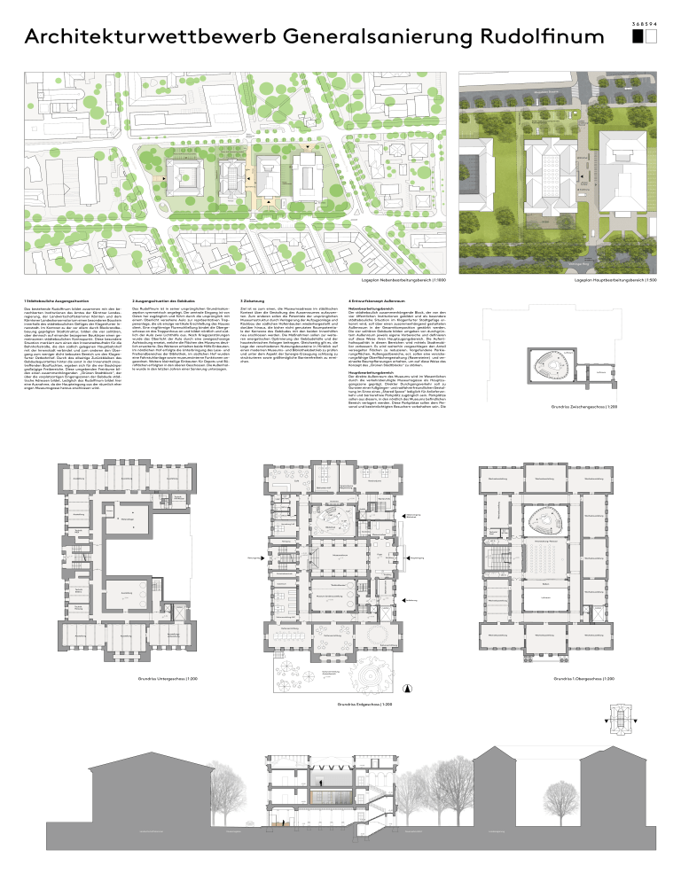 Architekturwettbewerb Generalsanierung Rudolfinum 368594 Feurwehrzufahrt Miesstaler Strasse Info Parken 14 SP Personal / barrierefrei Rasensteinpflaster Zufahrt Anlieferung / Personal Zufahrt Anlieferung / Personal Miesstaler Strasse Info Info Fahrräder e Vök Parken 14 SP Personal / barrierefrei Parken 16 SP Personal / barrierefrei rkte rma ul Arn Fahrräder Feurwehrzufahrt ng tz r Ri a fpl Bib. Bibliothek „Shared Surface“ Parken 17 SP Personal Anlieferung Anlieferung Fahrräder Terrasse Gastfläche Info Ausfahrt Anlieferung Viktringer Ring Terrasse Info Ausfahrt Anlieferung Viktringer Ring Lageplan Nebenbearbeitungsbereich | 1:1000 1 Städtebauliche Ausgangssituation 2 Ausgangssituation des Gebäudes 3 Zielsetzung 4 Entwurfskonzept Außenraum Das bestehende Rudolfinum bildet zusammen mit den benachbarten Institutionen des Amtes der Kärntner Landesregierung, der Landwirtschaftskammer Kärnten und dem Kärntener Landeskonservatorium einen besonderen Baustein innerhalb des städtebaulichen Gefüges der Klagenfurter Innenstadt. Im Kontrast zu der vor allem durch Blockrandbebauung geprägten Stadtstruktur, bilden die vier solitären, aber dennoch auf einander bezogenen Baukörper einen gemeinsamen städtebaulichen Kontrapunkt. Diese besondere Situation markiert zum einen den Innenstadtauftakt für die Bahnhofsstraße, die den südlich gelegenen Hauptbahnhof mit der Innenstadt verbindet und zum anderen den Übergang zum weniger dicht bebauten Bereich um den Klagenfurter Ostbahnhof. Durch das allseitige Zurückbleiben des Gebäudequartettes hinter die sonst in der Innenstadt anzutreffenden Baufluchten, ergeben sich für die vier Baukörper großzügige Freibereiche. Diese umgebenden Freiräume bilden einen zusammenhängenden „Grünen Stadtblock“, der über die vorplatzartigen Eingangszonen der Gebäude städtische Adressen bildet. Lediglich das Rudolfinum bildet hier eine Ausnahme, da der Haupteingang aus der räumlich eher engen Museumsgasse heraus erschlossen wird. Das Rudolfinum ist in seiner ursprünglichen Grundrisskonzeption symmetrisch angelegt. Der zentrale Eingang ist von Osten her zugänglich und führt durch die ursprünglich mit einem Oberlicht versehene Aula zur repräsentativen Treppenanlage, die als einzige vertikale Erschließung des Hauses dient. Eine ringförmige Flurerschließung bindet die Obergeschosse an das Treppenhaus an und bildet nördlich und südlich der Aula zwei Lichthöfe aus. Nach Kriegszerstörungen wurde das Oberlicht der Aula durch eine zweigeschossige Aufstockung ersetzt, welche die Flächen des Museums deutlich erweiterte. Des Weiteren erhielten beide Höfe Einbauten. Im nördlichen Hof erfolgte die Unterbringung des Lese- und Freihandbereiches der Bibliothek, im südlichen Hof wurden eine Fahrstuhlanlage sowie museumsinterne Funktionen angeordnet. Weitere kleinteilige Einbauten für Depots und Büroflächen erfolgten in den oberen Geschossen. Die Außenhülle wurde in den letzten Jahren einer Sanierung unterzogen. Ziel ist es zum einen, die Museumsadresse im städtischen Kontext über die Gestaltung des Aussenraumes aufzuwerten. Zum anderen sollen die Potentiale der ursprünglichen Museumsstruktur durch Verlagerung der Aufzugsanlage und Rückbau der südlichen Hofeinbauten wiederhergestellt und darüber hinaus, die bisher nicht genutzten Raumpotentiale der Kernzone des Gebäudes mit den beiden Innenhöfen neu erschlossen werden. Die Maßnahmen sollen zur weiteren energetischen Optimierung der Gebäudehülle und der haustechnischen Anlagen beitragen. Gleichzeitig gilt es, die Lage der verschiedenen Nutzungsbausteine in Hinblick auf einen modernen Museums- und Bibliotheksbetrieb zu prüfen und unter dem Aspekt der Synergie-Erzeugung schlüssig zu strukturieren sowie größtmögliche Barrierefreiheit zu erreichen. Nebenbearbeitungsbereich Der städtebaulich zusammenhängende Block, der von den vier öffentlichen Institutionen gebildet und als besondere städtebauliche Situation im Klagenfurter Stadtgefüge erkannt wird, soll über einen zusammenhängend gestalteten Außenraum in der Gesamtkomposition gestärkt werden. Die vier solitären Gebäude bilden umgeben von durchgrüntem Außenraum jeweils eigene Vorbereiche und definieren auf diese Weise ihren Hauptzugangsbereich. Die Aufenthaltsqualität in diesen Bereichen wird mittels Stadtmobiliar verbessert. Es wird weiterhin vorgeschlagen den Anteil versiegelter Flächen zu reduzieren. Vorgefundene Parkierungsflächen, Außengastbereiche, ect. sollen eine versickerungsfähige Oberflächengestaltung (Rasensteine) und vereinzelte Baumpflanzungen erhalten, um auf diese Weise das Konzept des „Grünen Stadtblocks“ zu stärken. Lageplan Hauptbearbeitungsbereich | 1:500 Luftraum 2 LP +3.24 Hauptbearbeitungsbereich Der direkte Außenraum des Museums wird im Wesentlichen durch die verkehrsberuhigte Museumsgasse als Hauptzugangszone geprägt. Direkter Durchgangsverkehr soll zu Gunsten einer fußgänger- und radfahrerfreundlichen Gestaltung im Sinne eines „Shared Space“ lediglich für Anlieferverkehr und barrierefreie Parkplätz zugänglich sein. Parkplätze sollen aus diesem, in den nördlich des Museums befindlichen Bereich verlagert werden. Diese Parkplätze sollen dem Personal und beeinträchtigten Besuchern vorbehalten sein. Die Luftraum Grundriss Zwischengeschoss | 1:200 Luftraum Luftraum Ausstellung Ausstellung Ausstellung Café Lager +-0.00 WC Beh. Ausstellung Hublift 3 LP Nebeneingang Bibliothek -1.52 2 AP WC D Wechselausstellung 2 LP Wechselausstellung Wechselausstellung mobiler Buchlift Sicherh. Wechselausstellung Warten/Info Garderobe WC H Luftraum Vereinsräume Besprechung Bibliothek 4 AP Technik HA Wasser Wechselausstellung Vereinsräume Luftraum Materiallager 3 CP +6.48 Verwaltung 2 AP Bibliothek +-0.00 Technik Müll Garderobe Technik / Saal Museumsshop WC D Reinigung +-0.00 = 443.41 -1.17 Foyer Museumsforum -1.17 -1.11 -1.11 Veranstaltung / Festsaal +2.49 Windfang +4.83 Haupteingang Wech