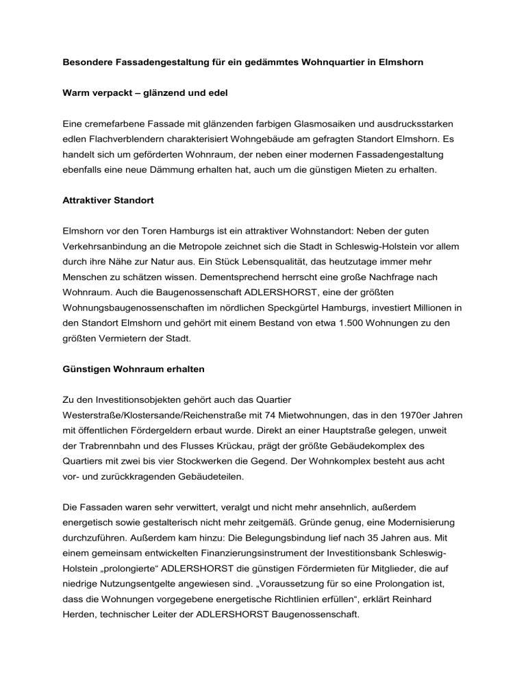 Besondere Fassadengestaltung für ein gedämmtes Wohnquartier in Elmshorn Warm verpackt – glänzend und edel Eine cremefarbene Fassade mit glänzenden farbigen Glasmosaiken und ausdrucksstarken edlen Flachverblendern charakterisiert Wohngebäude am gefragten Standort Elmshorn. Es handelt sich um geförderten Wohnraum, der neben einer modernen Fassadengestaltung ebenfalls eine neue Dämmung erhalten hat, auch um die günstigen Mieten zu erhalten. Attraktiver Standort Elmshorn vor den Toren Hamburgs ist ein attraktiver Wohnstandort: Neben der guten Verkehrsanbindung an die Metropole zeichnet sich die Stadt in Schleswig-Holstein vor allem durch ihre Nähe zur Natur aus. Ein Stück Lebensqualität, das heutzutage immer mehr Menschen zu schätzen wissen. Dementsprechend herrscht eine große Nachfrage nach Wohnraum. Auch die Baugenossenschaft ADLERSHORST, eine der größten Wohnungsbaugenossenschaften im nördlichen Speckgürtel Hamburgs, investiert Millionen in den Standort Elmshorn und gehört mit einem Bestand von etwa 1.500 Wohnungen zu den größten Vermietern der Stadt. Günstigen Wohnraum erhalten Zu den Investitionsobjekten gehört auch das Quartier Westerstraße/Klostersande/Reichenstraße mit 74 Mietwohnungen, das in den 1970er Jahren mit öffentlichen Fördergeldern erbaut wurde. Direkt an einer Hauptstraße gelegen, unweit der Trabrennbahn und des Flusses Krückau, prägt der größte Gebäudekomplex des Quartiers mit zwei bis vier Stockwerken die Gegend. Der Wohnkomplex besteht aus acht vor- und zurückkragenden Gebäudeteilen. Die Fassaden waren sehr verwittert, veralgt und nicht mehr ansehnlich, außerdem energetisch sowie gestalterisch nicht mehr zeitgemäß. Gründe genug, eine Modernisierung durchzuführen. Außerdem kam hinzu: Die Belegungsbindung lief nach 35 Jahren aus. Mit einem gemeinsam entwickelten Finanzierungsinstrument der Investitionsbank SchleswigHolstein „prolongierte“ ADLERSHORST die günstigen Fördermieten für Mitglieder, die auf niedrige Nutzungsentgelte angewiesen sind. „Voraussetzung für so eine Prolongation ist, dass die Wohnungen vorgegebene energetische Richtlinien erfüllen“, erklärt Reinhard Herden, technischer Leiter der ADLERSHORST Baugenossenschaft. Warme Perspektiven „Damit die gesetzlich vorgeschriebenen energetischen Standards erfüllt werden konnten, investierte ADLERSHORST 4,2 Millionen Euro, um die Wohngebäude einer umfangreichen Modernisierung zu unterziehen“, erklärt Herden weiter und benennt mit der Fassadendämmung die zentrale Maßnahme. Der Malerbetrieb Hans-Jürgen Rath aus Schenefeld bei Itzehoe übernahm diese Arbeiten. „Insgesamt haben wir 4.050 Quadratmeter bearbeitet“, erklärt Hans-Wilhelm Hövermann, Fachbauleiter des ausführenden Malerbetriebs. „Nachdem wir die zum Teil vorhandene Vorhangfassade entfernt hatten, mussten wir die Vormauerziegelaußenwände bis zu drei Zentimeter mit unterschiedlich starken Dämmplatten aus Polystyrol ausgleichen“, erläutert der Bauleiter des Objekts weiter. Hauptdämmplatte war die 160 Millimeter starke Capatect-Dalmatiner-Fassadendämmplatte, die mit Capatect Klebe- und Spachtelmasse 190 geklebt und armiert wurde. Die Dämmplatten haben eine Wärmeleitfähigkeit von 0,034 W/(M.K.) nach DIN 4108. Es folgte ein Auftrag von Capatect Mineral-Leichtputz oder von Sylitol Fassadenputz, beide als Kratzputz in zwei Millimeter Stärke ausgeführt. Der abschließende cremefarbene Anstrich erfolgte zweimal mit Muresko Silacryl. Zarte Akzente auf kontrastreicher Fassade Mit der Dämmung war der Grundstein für eine neue Gestaltung gelegt und Diplom Industriedesigner Pasquale De Gennaro vom Caparol FarbDesignStudio lieferte den Entwurf. „Aufgrund der Lage des Objekts an einer großen Hauptstraße war es dem Bauherrn wichtig, dass es einen repräsentativen, ansprechenden Charakter bekommt. Dies sollte mit Hilfe eines Materialwechsels geschehen: Wir nutzten also nicht nur Farbe, sondern auch den exklusiven, ganz modernen Meldorfer Flachverblender Kopenhagen und Glasmosaiksteine“, erklärt De Gennaro. Die im Sockel- und Eingangsbereich eingesetzten anthrazitfarbenen Flachverblender geben dem Gebäude nicht nur eine haltende Struktur, sie bilden auch einen edlen Kontrast zum cremefarbenen Fassadenton. Die partiell zwischen den Fenstern und im Eingangsbereich als schmale Felder eingesetzte Glasmosaike setzen in den Farbtönen rot, gelb, blau, weiß und grün belebende Akzente ohne in den Vordergrund zu treten. „Jedem Gebäude ist eine Farbe zugewiesen, die sich auch im Eingangsbereich findet. Dies bringt Bezug und Orientierung zwischen den Gebäuden“, führt De Gennaro weiter aus. Besondere Anforderungen Aufträge zur Fassadengestaltung mit Glasmosaiksteinen kommen im Malerbetrieb HansJürgen Rath eher selten vor. An diesem Objekt verarbeiteten die Handwerker insgesamt 350 Quadratmeter Glasmosaiksteine – mit besonderen Anforderungen: „Damit die Fassade das Gewicht der Glasmosaiksteine tragen kann, haben wir nach Verklebung von Dämmplatten und Armierung durch das Gewebe gedübelt. Außerdem war der Klebeanteil auf den Dämmplatten selbst höher und die Armierung von mindestens sechs Millimeter Stärke dicker als gewöhnlich“, erklärt Hövermann. Es folgte das Einarbeiten von Edelstahlabschlussschienen, die die Glasmosaikflächen oben und unten begrenzen. Nach ausreichender Trocknung der Gewebearmierungsschicht wurde der Capatect Ceratherm Verlegemörtel zur Verklebung der Glasmosaiksteine aufgetragen. Die Glasmosaiksteine befanden sich auf einer Folie, die die Handwerker in den Mörtel drückten und nach der Verklebung abzogen. Abschließend erfolgte die Verfugung im Schlämmverfahren mit Capatect Ceratherm Fugenschlämme in Titangrau, die Versiegelung der Randfugen sowie die Positionierung der Putzabschlussprofile an den Seiten. „Es war eine Herausforderung, die Steine an den Rändern so zu schneiden, dass sie nicht splitterten oder faserten. Dafür war das richtige Sc