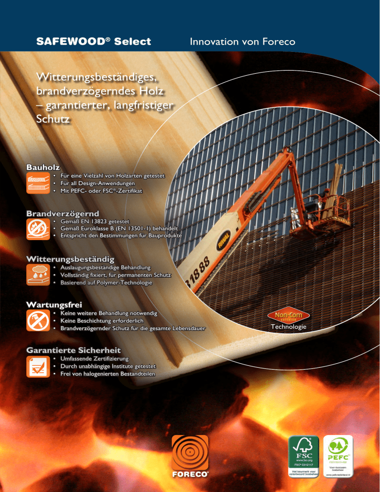 SAFEWOOD® Select Innovation von Foreco Witterungsbeständiges, brandverzögerndes Holz – garantierter, langfristiger Schutz Bauholz • Für eine Vielzahl von Holzarten getestet • Für all Design-Anwendungen • Mit PEFC- oder FSC®-Zertifikat Brandverzögernd • Gemäß EN 13823 getestet • Gemäß Euroklasse B (EN 13501-1) behandelt • Entspricht den Bestimmungen für Bauprodukte Witterungsbeständig • Auslaugungsbeständige Behandlung • Vollständig fixiert, für permanenten Schutz • Basierend auf Polymer-Technologie Wartungsfrei • Keine weitere Behandlung notwendig • Keine Beschichtung erforderlich • Brandverzögernder Schutz für die gesamte Lebensdauer Garantierte Sicherheit • Umfassende Zertifizierung • Durch unabhängige Institute getestet • Frei von halogenierten Bestandteilen Technologie SAFEWOOD® Select für das medizinische Zentrum Meander Brandverzögernde Behandlung gemäß europäischer Standards Fassade aus Western Red Cedar In Amersfoort ein schönes, modernes Krankenhaus wurde erbaut. Die Holzverkleidung verleiht dem medizinischen Zentrum Meander eine professionelle und freundliche Ausstrahlung. Die Zimmerleute von Foreco Holzbau brachten einen Rahmen an der Außenwand an, auf dem die Holzverkleidung montiert wurde. Der Rahmen besteht aus einer Trägerstruktur aus Fichtenbalken und einer SandwichPlatte aus Metall. Dieser wird mit qualitativ hochwertiger Isolierung gefüllt und mit einer schwarzen, UV-beständigen und brandverzögernden Folie versehen. Die Außenverkleidung aus Holz erhielt eine brandverzögernde Behandlung mit SafeWood® Select. Architekt: AtelierPro Montage: Foreco Holzbau Seite 2 | SafeWood® Select SafeWood® Select sorgt für bewährtes und wartungsfreies, brandverzögerndes Holz. Das Holz ist durch eine fortschrittliche, brandverzögernde Rezeptur (NON-COM® Exterior) auf Polymer-Basis geschützt, welche den Einsatz des behandelten Holzes im Freien oder unter sehr feuchten Umgebungsbedingungen ohne weiteren Schutz ermöglicht. Entsteht ein Feuer, reagieren die brandverzögernden Bestandteile mit brennbaren Gasen im Holz, und wandeln diese in Kohlenstoff, Kohlendioxid und Wasser um. Die verkohlte Oberfläche dient als Isolierung für das darunter liegende Holz und verlängert deutlich den Zeitraum, bis das sog. „Flashover“ eintritt. Erhitzung Bei der Erhitzung erstehen brennbare Gase Das Verfahren Entgegenwirkende Elemente binden die brennbaren Gase Das Ergebnis Es bildet sich eine ‘verkohlte’ Schutzschicht Langlebige, witterungsbeständige, brandverzögernde Behandlung SafeWood® Select Hölzer werden in einer industriellen KesseldruckImprägnieranlage behandelt, in der die brandverzögernde Substanz in das Holz eingebracht wird, so dass sie nicht auslaugen kann. NON-COM® Exterior ist ein fortschrittliches, witterungsbeständiges Brandschutzsystem basierend auf Polymer-Technologie. Die Beeinträchtigung der Biegefestigkeit und der Schlagbeständigkeit des Holzes ist so geringfügig, dass SafeWood® Select hervorragenden, langfristigen brandverzögernden Schutz bietet. Wartungsfreies, brandverzögerndes Holz in Übereinstimmung mit der Bauprodukte-Verordnung Studentenheim, Zwolle Im Studentenwohnheim „De Kwekerij“ im niederländischen Zwolle wurde eine geräuschdämmende Wand installiert. Sie dient darüber hinaus als Fahrrad-Abstellraum und unterirdischer Müllraum. Dank der Farbgebung und des gewählten Materials ist nur geringfügige Instandhaltung erforderlich. Für das Projekt wurde eine Kombination aus WaxedWood® Color und SafeWood® Select verwendet. Architekt: Sacon Architecten Fotos: Foreco SafeWood® Select bietet eine einzigartige Lösung für Außenverkleidungen, da weder Instandhaltung noch Beschichtungen erforderlich sind. Das Produkt entspricht über seinen gesamten Lebenszyklus der Bauprodukte-Verordnung. Dadurch ist SafeWood® Select die ideale Lösung für offene und geschlossene Verkleidungssysteme und eine optimale und sichere Wahl für öffentliche Gebäude, wie Schulen und Krankenhäuser. SafeWood® Select | Seite 3 SAFEWOOD® Select bei Fiep Westendorp in Amsterdam 40 Jahre bewährte Leistung und umfassend getestet Natürliche grüne Verkleidung Für dieses Projekt in Amsterdam wurde von den Architekten eine ‘lebendige grüne’ Verkleidung vorgesehen, die eine positive Ausstrahlung erzielt. Die Außenwand besteht aus einer Ziegelmauer, die mit NobelWood® verkleidet ist. Entlang der Holzverkleidung wachsen Pflanzen, wodurch sie ein natürliches, grünes Erscheinungsbild erhält. Die Technologie hinter SafeWood® Select hat sich über 40 Jahre durch seine Stabilität und Sicherheit in verschiedenen bedeutenden Projekten in Westeuropa und den Vereinigten Staaten bewährt. Die Technologie wurde unabhängig getestet und umfassend zertifiziert. Die britische Wood Protection Association (WPA) hat NON-COM® Exterior als einziger auslaugungsbeständiger, brandverzögernder Holzschutzbehandlung den Status ‘Anerkannt’ zugewiesen. Die Kombination aus SafeWood® Select und NobelWood® bietet modernste Holzvarianten und brandverzögernde Behandlung in einem einzigartigen, wartungsfreien und sicheren Produkt. Architekt: Architekturbüro Paul de Ruiter Fotos: John Lewis Marshall Seite 4 | SafeWood® Select Test eines brennenden Gegenstandes (SBI-Test) gemäß EN 13823 Erscheinungsbild und bauliche Eigenschaften wahren Dank der Behandlung mit SafeWood® Select ist es möglich, die gewünschte Farbe und Struktur einer spezifischen Holzsorte zu wählen und diese aufrecht zu erhalten. Nach dem Imprägnieren erhält das Holz beim anschließenden kontrollierten Kammertrocknungsund thermischen Härtungsverfahren wieder seinen erforderlichen Feuchtigkeitsgehalt, und die brandverzögernde Behandlung bildet ein permanentes, nicht wasserlösliches Granulat. Der Imprägnierungsund Trocknungsprozess hat keine Beeinträchtigung des qualitativ hochwertigen Erscheinungsbilds und der baulichen Eigenschaften des