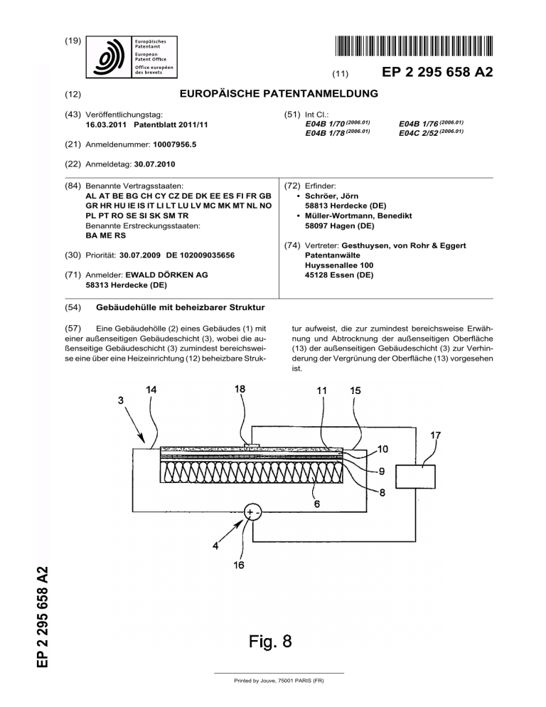 (19) & (11) EP 2 295 658 A2 EUROPÄISCHE PATENTANMELDUNG (12) (43) Veröffentlichungstag: (51) Int Cl.: E04B 1/70 (2006.01) E04B 1/78 (2006.01) 16.03.2011 Patentblatt 2011/11 E04B 1/76 (2006.01) E04C 2/52 (2006.01) (21) Anmeldenummer: 10007956.5 (22) Anmeldetag: 30.07.2010 (84) Benannte Vertragsstaaten: (72) Erfinder: AL AT BE BG CH CY CZ DE DK EE ES FI FR GB GR HR HU IE IS IT LI LT LU LV MC MK MT NL NO PL PT RO SE SI SK SM TR Benannte Erstreckungsstaaten: BA ME RS • Schröer, Jörn 58813 Herdecke (DE) • Müller-Wortmann, Benedikt 58097 Hagen (DE) (74) Vertreter: Gesthuysen, von Rohr & Eggert (30) Priorität: 30.07.2009 DE 102009035656 (71) Anmelder: EWALD DÖRKEN AG Patentanwälte Huyssenallee 100 45128 Essen (DE) 58313 Herdecke (DE) (54) Gebäudehülle mit beheizbarer Struktur tur aufweist, die zur zumindest bereichsweise Erwähnung und Abtrocknung der außenseitigen Oberfläche (13) der außenseitigen Gebäudeschicht (3) zur Verhinderung der Vergrünung der Oberfläche (13) vorgesehen ist. EP 2 295 658 A2 (57) Eine Gebäudehölle (2) eines Gebäudes (1) mit einer außenseitigen Gebäudeschicht (3), wobei die außenseitige Gebäudeschicht (3) zumindest bereichsweise eine über eine Heizeinrichtung (12) beheizbare Struk- Printed by Jouve, 75001 PARIS (FR) 1 EP 2 295 658 A2 Beschreibung [0001] Die Erfindung betrifft eine Gebäudehülle eines Gebäudes mit einer außenseitigen Gebäudeschicht. [0002] Das Gebot der Verminderung von CO2-Emissionen führt dazu, dass immer mehr Bauteile der Gebäudehülle mit immer größeren Schichtdicken eines Dämmstoffs versehen werden. Insbesondere bei Fassaden werden hierzu sogenannte Wärmedämmverbundsysteme eingesetzt. Der Aufbau eines bekannten Wärmedämmverbundsystems ist in Fig. 1 dargestellt. Dabei ist das Wärmedämmverbundsystem auf das Mauerwerk mit dem alten Putz aufgebracht. Das Wärmedämmverbundsystem als solches weist üblicherweise eine Dämmplatte auf, auf die ein Armierungsmörtel aufgebracht ist. In den Armierungsmörtel eingebettet und auf diesen aufgebracht ist ein Armierungsgewebe. Darauf wiederum befindet sich ein Haftgrund, auf dem Außenputz aufgebracht ist. Der Außenputz wird ggf, noch angestrichen. Mit einem System dieser Art lassen sich sowohl neue Fassaden ausrüsten als auch die Fassaden alter Gebäuden nachträglich dämmen und mit einem neuen Putz versehen. [0003] Der Nachteil bei den so gedämmten Bauteilen bzw. Teilen der Gebäudehülle ist der geänderte Temperatürverlauf im gesamten Bauteil. Aufgrund der Dämmung ergibt sich in der Regel eine deutlich niedrigere Temperatur an der luftberührten, d.h. außenseitigen Oberfläche als bei nicht gedämmten Fassaden. Den Temperaturverlauf im Wandquerschnitt bei einer Fassade mit einem Wärmedämmverbundsystem der vorgenannten Art zeigt Fig. 2, wo der Temperaturverlauf von außen nach innen über die Wanddicke dargestellt ist. [0004] Die Absenkung der Oberflächentemperatur an der Außenseite der außenseitigen Gebäudeschicht führt dazu, dass insbesondere in den Nachtstunden der Taupunkt regelmäßig unterschritten wird und erhebliche Mengen Kondensat auf der außenseitigen Oberfläche der äußeren Gebäudeschicht anfallen. Dieses wird in den folgenden Tagstunden, insbesondere bei nicht oder nur geringfügig sonnenbeschienenen Bereichen der außenseitigen Gebäudeschicht, nicht mehr vollständig abgetrocknet, so dass die Oberfläche dauerhaft oder überwiegend feucht bleibt. Dies bildet die Grundlage für das Wachstum insbesondere von Algen. Dieses Phänomen wird als (Fassaden-)Vergrünung bezeichnet. [0005] Die Vergrünung war bereits Gegenstand vielfältiger Untersuchungen. So wurde versucht, die mittlere Temperatur der Oberfläche durch Verwendung von IRreflektierenden Beschichtungen anzuheben oder die Oberflächen der Fassaden mit Algiziden, Fungiziden oder photokatalytischen Beschichtungen auszurüsten. All diese Ansätze zeigten jedoch keinen dauerhaften Erfolg, so dass relativ kurze Renovierungszyklen erforderlich waren. [0006] Aufgabe der vorliegenden Erfindung ist es nun, hier Abhilfe zu schaffen und eine Möglichkeit zur Verfügung zu stellen, mit der in einfacher und kostengünstiger 5 10 15 20 25 30 35 40 45 50 55 2 2 Weise die Vergrünung der außenseitigen Oberfläche der äußeren Gebäudeschicht einer Gebäudehülle eines Gebäudes verhindert werden kann. [0007] Zur Lösung der vorstehend genannten Aufgabe ist erfindungsgemäß vorgesehen, dass die außenseitige Gebäudeschicht zumindest bereichsweise eine über eine Heizeinrichtung beheizbare Struktur aufweist, die zur zumindest bereichsweisen Erwärmung und Abtrocknung der außenseitigen Oberfläche der äußeren Gebäudeschicht zur Verhinderung der Vergrünung der Oberfläche vorgesehen ist. Letztlich liegt der Kerngedanke der Erfindung also in der Integration einer Struktur in einer luftbzw. außenseitig der Dämmung angeordneten Schicht, wobei die Struktur dann mit externer Energie versorgt wird, was zur Beheizung der Struktur führt. Die Struktur gibt die Wärmeenergie dann an die außenseitige Oberfläche der Gebäudeschicht ab und führt zur Abtrocknung der jeweiligen Bauteiloberfläche. Auf diese Weise wird letztlich die Vergrünung der Oberfläche vermieden. Dabei versteht es sich, dass die Struktur in alle Bereiche bzw. Bestandteile der Gebäudehülle integriert werden kann. Im übrigen versteht es sich, dass die vorliegende Erfindung, also die Verwendung einer beheizbaren Struktur innerhalb der außenseitigen Gebäudeschicht, auch mit den im Stand der Technik angegebenen Maßnahmen (IR-Reflektion, Photokatalyse, Algizide) kombiniert werden kann, wenn ein hoher Feuchtigkeitsanfall besteht und trotz der vorliegenden Erfindung die Vergrünung nicht vollständig verhindert werden kann. [0008] Die erfindungsgemäße Heizeinrichtung, die zur Beheizung der in die außenseitige Gebäudeschicht integrierten Struktur vorgesehen ist, basiert bevorzugt auf einer elektrischen Beheizung in Form einer 