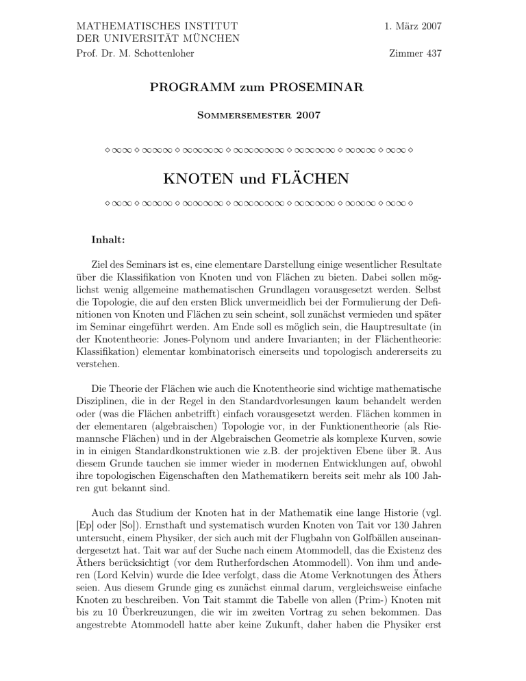 MATHEMATISCHES INSTITUT DER UNIVERSITÄT MÜNCHEN Prof. Dr. M. Schottenloher 1. März 2007 Zimmer 437 PROGRAMM zum PROSEMINAR Sommersemester 2007 ∞∞ ∞∞∞ ∞∞∞∞ ∞∞∞∞∞ ∞∞∞∞ ∞∞∞ ∞∞ KNOTEN und FLÄCHEN ∞∞ ∞∞∞ ∞∞∞∞ ∞∞∞∞∞ ∞∞∞∞ ∞∞∞ ∞∞ Inhalt: Ziel des Seminars ist es, eine elementare Darstellung einige wesentlicher Resultate über die Klassifikation von Knoten und von Flächen zu bieten. Dabei sollen möglichst wenig allgemeine mathematischen Grundlagen vorausgesetzt werden. Selbst die Topologie, die auf den ersten Blick unvermeidlich bei der Formulierung der Definitionen von Knoten und Flächen zu sein scheint, soll zunächst vermieden und später im Seminar eingeführt werden. Am Ende soll es möglich sein, die Hauptresultate (in der Knotentheorie: Jones-Polynom und andere Invarianten; in der Flächentheorie: Klassifikation) elementar kombinatorisch einerseits und topologisch andererseits zu verstehen. Die Theorie der Flächen wie auch die Knotentheorie sind wichtige mathematische Disziplinen, die in der Regel in den Standardvorlesungen kaum behandelt werden oder (was die Flächen anbetrifft) einfach vorausgesetzt werden. Flächen kommen in der elementaren (algebraischen) Topologie vor, in der Funktionentheorie (als Riemannsche Flächen) und in der Algebraischen Geometrie als komplexe Kurven, sowie in in einigen Standardkonstruktionen wie z.B. der projektiven Ebene über R. Aus diesem Grunde tauchen sie immer wieder in modernen Entwicklungen auf, obwohl ihre topologischen Eigenschaften den Mathematikern bereits seit mehr als 100 Jahren gut bekannt sind. Auch das Studium der Knoten hat in der Mathematik eine lange Historie (vgl. [Ep] oder [So]). Ernsthaft und systematisch wurden Knoten von Tait vor 130 Jahren untersucht, einem Physiker, der sich auch mit der Flugbahn von Golfbällen auseinandergesetzt hat. Tait war auf der Suche nach einem Atommodell, das die Existenz des Äthers berücksichtigt (vor dem Rutherfordschen Atommodell). Von ihm und anderen (Lord Kelvin) wurde die Idee verfolgt, dass die Atome Verknotungen des Äthers seien. Aus diesem Grunde ging es zunächst einmal darum, vergleichsweise einfache Knoten zu beschreiben. Von Tait stammt die Tabelle von allen (Prim-) Knoten mit bis zu 10 Überkreuzungen, die wir im zweiten Vortrag zu sehen bekommen. Das angestrebte Atommodell hatte aber keine Zukunft, daher haben die Physiker erst einmal vom Studium der Knoten abgelassen. In der Mathematik wurden Knoten vor 110 Jahren von Wirtinger im Rahmen von Singularitäten von Nullstellengebilden holomorpher Funktionen in mehreren Veränderlichen studiert, von anderen Mathematikern danach im Rahmen der Grundlegung und Entwicklung der Topologie und der Gruppentheorie. Dann wurde es Mitte des letzten Jahrhunderts ruhig um die Knoten. Sie war eine Vorzeigedisziplin geworden, in der die Gebiete Topologie, Algebra und Geometrie eine fruchtbare Verbindung eingehen, und das auf einem vergleichsweise elementaren Niveau. In den Achtziger Jahren gab es einen Ruck, eine neue und effiziente Knoteninvariante, das Jones-Polynom, wurde entdeckt und ein neuer Zusammenhang zur Physik wurde hergestellt und ausgebaut (vgl. [At]), der sogar im Rahmen der Realisierung von Quantencomputern eine wichtige Rolle spielen könnte [Sch07]. Es ist also durchaus interessant, sich mit der Knotentheorie auseinanderzusetzen. Unter anderem auch, weil es in der Knotentheorie noch ungelöste Probleme gibt. Zum Beispiel die Beschreibung einer klassifizierenden kombinatorischen Invarianten oder ein geometrische Beweis der Existenz des Jones-Polynoms. Im Seminar geht es nicht im die Historie, aber es geht unter anderem auch darum, zu beschreiben und zu erfahren, wie sich ein mathematische Theorie entwickelt und wandelt. Keineswegs soll möglichst schnell ein hoher Abstraktionsgrad erreicht werden. Daher werden der Begriff des Knotens und der Begriff der Fläche rein kombinatorisch eingeführt. Und die Beweisführungen zu den Knoteninvarianten und zur Klassifikation der Flächen soll auch rein kombinatorisch geführt werden. (Das wird in [GP] wie auch in [Gr, Li] im Grundsatz so gehandhabt, allerdings nicht immer ganz klar getrennt von zusätzlichen Argumenten, weil der kombinatorische Weg manchmal ein wenig länglich erscheint.) Die Darstellung in [Sch94] ist darauf ausgerichtet, ganz ohne Topologie auszukommen, sie ist sogar so angelegt, dass ein interessierter Nichtmathematiker ihr folgen können soll.) Insbesondere sollen im Seminar die Begriffe Knoten als Polygonzug im R3 und der Begriff des Knotendiagramms zunächst auseinandergehalten werden. Mit den Knotendiagrammen wird nach dem einführenden 1. Vortrag zunächst in drei weiteren Vorträgen 2. - 4. die Knotentheorie vorangetrieben. Dabei soll viel Wert auf die Begriffsbildungen gelegt werden. Dann wird die kombinatorische Flächentheorie bis zu Klassifikation und Beschreibung der relevanten Invarianten entwickelt. Vortrag 8 gibt anschließend eine Gesamtschau der bisher untersuchten Objekte aus dem Blickwinkel der Topologie. Und der neunte Vortrag bringt Knoten und Flächen zusammen. Diese 9 Vorträge sind in der Regel an je zwei Teilnehmer vergeben, und sie bilden den Kern des Proseminars. Im Anschluss an die Einteilung dieser 9 Vorträge sind noch weitere Vorträge genannt, die fast alle unabhängig voneinander sind. Diese stehen zur freien Auswahl und bringen den Stoff voran: Wer einen dieser Vorträge, evtl. wieder zu zweit oder auch zu dritt halten möchte, möge mich bald darüber informieren. Diese Zusatzvorträge sind in keiner Weise obligatorisch. Organisation Die stichwortartige Beschreibung der Themen stellt jeweils einen Vorschlag dar, von dem auch abgewichen darf. 2 Zum erfolgreichen Seminarbesuch gehört auch die Teilnahme an den Vorträgen, die man nicht selber hält. Erwünscht ist auch eine Diskussion. Das bedeutet, dass jeder Vortragende so sicher in seinem Stoff stehe