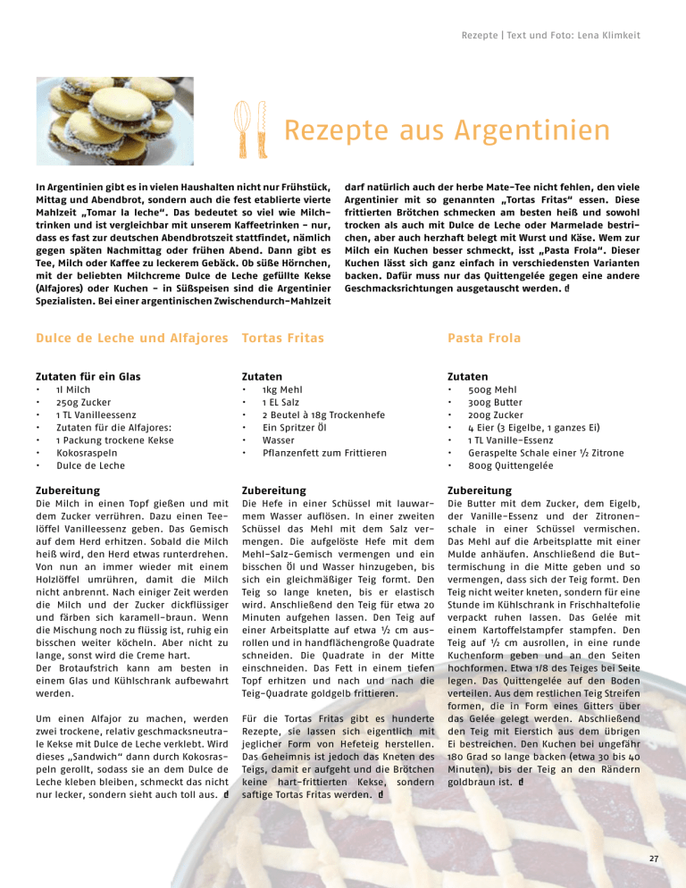 Rezepte | Text und Foto: Lena Klimkeit Rezepte aus Argentinien In Argentinien gibt es in vielen Haushalten nicht nur Frühstück, Mittag und Abendbrot, sondern auch die fest etablierte vierte Mahlzeit „Tomar la leche“. Das bedeutet so viel wie Milchtrinken und ist vergleichbar mit unserem Kaffeetrinken - nur, dass es fast zur deutschen Abendbrotszeit stattfindet, nämlich gegen späten Nachmittag oder frühen Abend. Dann gibt es Tee, Milch oder Kaffee zu leckerem Gebäck. Ob süße Hörnchen, mit der beliebten Milchcreme Dulce de Leche gefüllte Kekse (Alfajores) oder Kuchen - in Süßspeisen sind die Argentinier Spezialisten. Bei einer argentinischen Zwischendurch-Mahlzeit darf natürlich auch der herbe Mate-Tee nicht fehlen, den viele Argentinier mit so genannten „Tortas Fritas“ essen. Diese frittierten Brötchen schmecken am besten heiß und sowohl trocken als auch mit Dulce de Leche oder Marmelade bestrichen, aber auch herzhaft belegt mit Wurst und Käse. Wem zur Milch ein Kuchen besser schmeckt, isst „Pasta Frola“. Dieser Kuchen lässt sich ganz einfach in verschiedensten Varianten backen. Dafür muss nur das Quittengelée gegen eine andere Geschmacksrichtungen ausgetauscht werden. # Dulce de Leche und Alfajores Tortas Fritas Pasta Frola Zutaten für ein Glas Zutaten Zutaten • • • • • • • • • • • • • • • • • • • • 1l Milch 250g Zucker 1 TL Vanilleessenz Zutaten für die Alfajores: 1 Packung trockene Kekse Kokosraspeln Dulce de Leche 1kg Mehl 1 EL Salz 2 Beutel à 18g Trockenhefe Ein Spritzer Öl Wasser Pflanzenfett zum Frittieren 500g Mehl 300g Butter 200g Zucker 4 Eier (3 Eigelbe, 1 ganzes Ei) 1 TL Vanille-Essenz Geraspelte Schale einer ½ Zitrone 800g Quittengelée Zubereitung Zubereitung Zubereitung Die Milch in einen Topf gießen und mit dem Zucker verrühren. Dazu einen Teelöffel Vanilleessenz geben. Das Gemisch auf dem Herd erhitzen. Sobald die Milch heiß wird, den Herd etwas runterdrehen. Von nun an immer wieder mit einem Holzlöffel umrühren, damit die Milch nicht anbrennt. Nach einiger Zeit werden die Milch und der Zucker dickflüssiger und färben sich karamell-braun. Wenn die Mischung noch zu flüssig ist, ruhig ein bisschen weiter köcheln. Aber nicht zu lange, sonst wird die Creme hart. Der Brotaufstrich kann am besten in einem Glas und Kühlschrank aufbewahrt werden. Die Hefe in einer Schüssel mit lauwarmem Wasser auflösen. In einer zweiten Schüssel das Mehl mit dem Salz vermengen. Die aufgelöste Hefe mit dem Mehl-Salz-Gemisch vermengen und ein bisschen Öl und Wasser hinzugeben, bis sich ein gleichmäßiger Teig formt. Den Teig so lange kneten, bis er elastisch wird. Anschließend den Teig für etwa 20 Minuten aufgehen lassen. Den Teig auf einer Arbeitsplatte auf etwa ½ cm ausrollen und in handflächengroße Quadrate schneiden. Die Quadrate in der Mitte einschneiden. Das Fett in einem tiefen Topf erhitzen und nach und nach die Teig-Quadrate goldgelb frittieren. Um einen Alfajor zu machen, werden zwei trockene, relativ geschmacksneutrale Kekse mit Dulce de Leche verklebt. Wird dieses „Sandwich“ dann durch Kokosraspeln gerollt, sodass sie an dem Dulce de Leche kleben bleiben, schmeckt das nicht nur lecker, sondern sieht auch toll aus. # Für die Tortas Fritas gibt es hunderte Rezepte, sie lassen sich eigentlich mit jeglicher Form von Hefeteig herstellen. Das Geheimnis ist jedoch das Kneten des Teigs, damit er aufgeht und die Brötchen keine hart-frittierten Kekse, sondern saftige Tortas Fritas werden. # Die Butter mit dem Zucker, dem Eigelb, der Vanille-Essenz und der Zitronenschale in einer Schüssel vermischen. Das Mehl auf die Arbeitsplatte mit einer Mulde anhäufen. Anschließend die Buttermischung in die Mitte geben und so vermengen, dass sich der Teig formt. Den Teig nicht weiter kneten, sondern für eine Stunde im Kühlschrank in Frischhaltefolie verpackt ruhen lassen. Das Gelée mit einem Kartoffelstampfer stampfen. Den Teig auf ½ cm ausrollen, in eine runde Kuchenform geben und an den Seiten hochformen. Etwa 1/8 des Teiges bei Seite legen. Das Quittengelée auf den Boden verteilen. Aus dem restlichen Teig Streifen formen, die in Form eines Gitters über das Gelée gelegt werden. Abschließend den Teig mit Eierstich aus dem übrigen Ei bestreichen. Den Kuchen bei ungefähr 180 Grad so lange backen (etwa 30 bis 40 Minuten), bis der Teig an den Rändern goldbraun ist. # 27