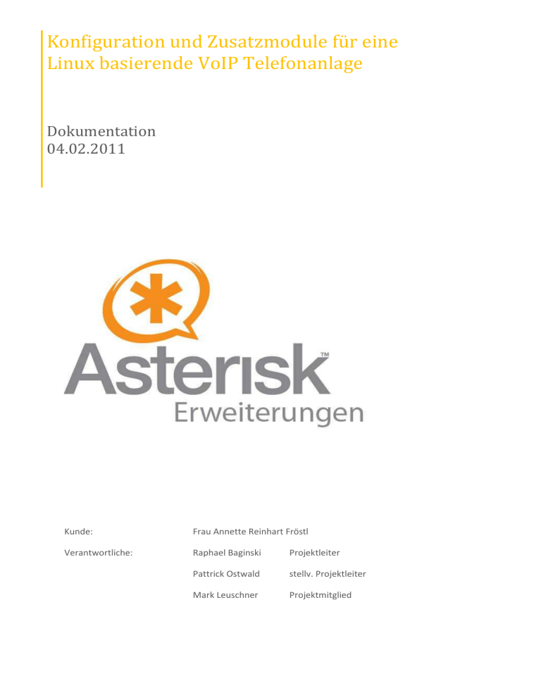 Konfiguration und Zusatzmodule für eine Linux basierende VoIP Telefonanlage Dokumentation 04.02.2011 Kunde: Frau Annette Reinhart Fröstl Verantwortliche: Raphael Baginski Projektleiter Pattrick Ostwald stellv. Projektleiter Mark Leuschner Projektmitglied Projekt: Kunde: Dokument: Konfiguration und Zusatzmodule für eine Linux basierende VoIP-Telefonanlage Frau Annette Reinhart Fröstl Dokumentation Inhaltsverzeichnis 1. Projektdefinition .............................................................................................................. Seite 3 1.1. Vorwort....................................................................................................................... Seite 3 1.2. Urheberrecht .............................................................................................................. Seite 3 1.3. Projektumfeld ............................................................................................................. Seite 3 1.4. Kontaktdaten .............................................................................................................. Seite 4 1.5. Ist-Aufnahme .............................................................................................................. Seite 5 1.6. Zieldefinition ............................................................................................................... Seite 5 1.7. Sollzustand .................................................................................................................. Seite 5 1.8. Projektauftrag ............................................................................................................. Seite 5 1.9. Pflichtenheft ............................................................................................................... Seite 5 2. Projektplanung ................................................................................................................ Seite 6 2.1. Projektstrukturplan .................................................................................................... Seite 6 2.2. Verantwortungsmatrix ............................................................................................... Seite 7 2.3. Vorgangsliste .............................................................................................................. Seite 8 2.4. Balkendiagramm ......................................................................................................... Seite 9 2.5. Meilensteinliste .......................................................................................................... Seite 9 2.6. Netzplan...................................................................................................................... Seite 9 2.7. Projektablaufplan ..................................................................................................... Seite 10 3. Durchführung ................................................................................................................ Seite 11 3.1. Beschreibung ............................................................................................................ Seite 11 3.2. Die Arbeitsumgebung ............................................................................................... Seite 11 3.3. Die Installation .......................................................................................................... Seite 13 3.3.1. Installation des Ubuntu-Betriebssystems ..................................................... Seite 13 3.3.2. Update und Upgrade des Servers ................................................................. Seite 14 3.3.3. Installation der Telefonanlage Asterisk, Version 1.6 ..................................... Seite 14 3.3.4. Erstkonfiguration der Telefonanlage ............................................................ Seite 15 Verantwortliche: R. Baginski, M. Leuschner, P. Ostwald Seite 1 von 38 Projekt: Kunde: Dokument: Konfiguration und Zusatzmodule für eine Linux basierende VoIP-Telefonanlage Frau Annette Reinhart Fröstl Dokumentation 3.4. Die Einbindung und Konfiguration der Module........................................................ Seite 16 3.4.1. Das Anrufbeantworter-Modul ....................................................................... Seite 17 3.4.2. Das Konferenz-Modul .................................................................................... Seite 18 3.4.3. Das Weiterleitungsmodul-Modul .................................................................. Seite 21 3.4.4. Das Mithören-Modul ..................................................................................... Seite 22 3.4.4. Das Fax-Modul ............................................................................................... Seite 22 3.5. Funktionstest ........................................................................................................... Seite 27 3.6. Skripte ....................................................................................................................... Seite 32 4. Projektabschluss ........................................................................................................... Seite 36 4.1. Projektziel ................................................................................................................. Seite 36 4.2. Soll-Ist-Vergleich ....................................................................................................... Seite 36 4.3. Termine/Fazit ........................................................................................................... Seite 37 4.4. Fazit........................................................................................................................... Seite 37 5. Anhang.......................................................................................................................ab Seite 38 5.1. Projektauftrag .............................................................