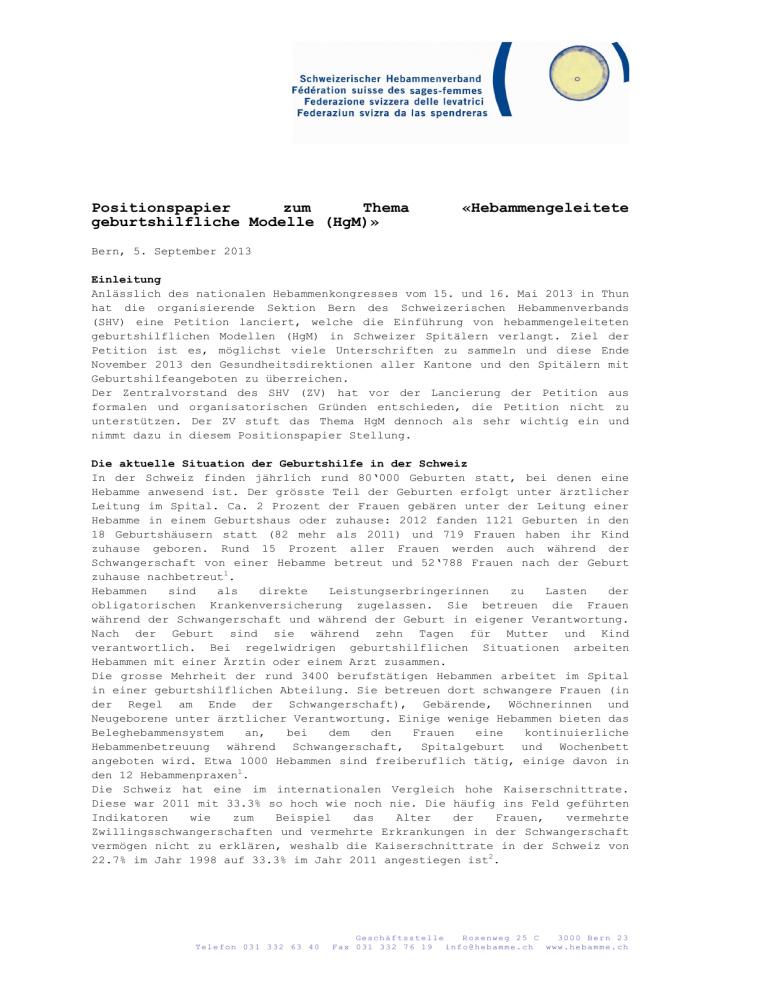 Positionspapier zum Thema geburtshilfliche Modelle (HgM)» «Hebammengeleitete Bern, 5. September 2013 Einleitung Anlässlich des nationalen Hebammenkongresses vom 15. und 16. Mai 2013 in Thun hat die organisierende Sektion Bern des Schweizerischen Hebammenverbands (SHV) eine Petition lanciert, welche die Einführung von hebammengeleiteten geburtshilflichen Modellen (HgM) in Schweizer Spitälern verlangt. Ziel der Petition ist es, möglichst viele Unterschriften zu sammeln und diese Ende November 2013 den Gesundheitsdirektionen aller Kantone und den Spitälern mit Geburtshilfeangeboten zu überreichen. Der Zentralvorstand des SHV (ZV) hat vor der Lancierung der Petition aus formalen und organisatorischen Gründen entschieden, die Petition nicht zu unterstützen. Der ZV stuft das Thema HgM dennoch als sehr wichtig ein und nimmt dazu in diesem Positionspapier Stellung. Die aktuelle Situation der Geburtshilfe in der Schweiz In der Schweiz finden jährlich rund 80‘000 Geburten statt, bei denen eine Hebamme anwesend ist. Der grösste Teil der Geburten erfolgt unter ärztlicher Leitung im Spital. Ca. 2 Prozent der Frauen gebären unter der Leitung einer Hebamme in einem Geburtshaus oder zuhause: 2012 fanden 1121 Geburten in den 18 Geburtshäusern statt (82 mehr als 2011) und 719 Frauen haben ihr Kind zuhause geboren. Rund 15 Prozent aller Frauen werden auch während der Schwangerschaft von einer Hebamme betreut und 52‘788 Frauen nach der Geburt zuhause nachbetreut1. Hebammen sind als direkte Leistungserbringerinnen zu Lasten der obligatorischen Krankenversicherung zugelassen. Sie betreuen die Frauen während der Schwangerschaft und während der Geburt in eigener Verantwortung. Nach der Geburt sind sie während zehn Tagen für Mutter und Kind verantwortlich. Bei regelwidrigen geburtshilflichen Situationen arbeiten Hebammen mit einer Ärztin oder einem Arzt zusammen. Die grosse Mehrheit der rund 3400 berufstätigen Hebammen arbeitet im Spital in einer geburtshilflichen Abteilung. Sie betreuen dort schwangere Frauen (in der Regel am Ende der Schwangerschaft), Gebärende, Wöchnerinnen und Neugeborene unter ärztlicher Verantwortung. Einige wenige Hebammen bieten das Beleghebammensystem an, bei dem den Frauen eine kontinuierliche Hebammenbetreuung während Schwangerschaft, Spitalgeburt und Wochenbett angeboten wird. Etwa 1000 Hebammen sind freiberuflich tätig, einige davon in den 12 Hebammenpraxen1. Die Schweiz hat eine im internationalen Vergleich hohe Kaiserschnittrate. Diese war 2011 mit 33.3% so hoch wie noch nie. Die häufig ins Feld geführten Indikatoren wie zum Beispiel das Alter der Frauen, vermehrte Zwillingsschwangerschaften und vermehrte Erkrankungen in der Schwangerschaft vermögen nicht zu erklären, weshalb die Kaiserschnittrate in der Schweiz von 22.7% im Jahr 1998 auf 33.3% im Jahr 2011 angestiegen ist2. Telefon 031 332 63 40 Geschäftsstelle Rosenweg 25 C 3000 Bern 23 Fax 031 332 76 19 [email protected] www.hebamme.ch Hebammengeleitete Modelle (HgM) Definition Der Begriff der hebammengeleiteten Geburtshilfe (Midwife-led care) wurde von verschiedenen englischsprachigen Autorinnen und Autoren definiert. Charakteristisch für alle Definitionen sind folgende Punkte: Schwangerschaft und Geburt sind im Leben einer Frau natürliche, physiologische Ereignisse. Die hebammengeleitete Geburtshilfe unterstützt diesen Prozess und orientiert sich an den Bedürfnissen und Wünschen der Frau. Zentral ist die kontinuierliche Begleitung durch eine erfahrene Hebamme im Kontinuum Schwangerschaft, Geburt und Wochenbett, wobei dem physischen, psychischen und sozialen Wohlbefinden der Frau als auch der Familie besonders grosse Beachtung geschenkt wird. Medizinische oder technische Interventionen werden minimiert. Die Verantwortung liegt bei der Hebamme. Zielgruppen sind gesunde Gebärende resp. Frauen mit einer niedrigen Risikoeinstufung. Es gibt Modelle, in dem ganze Hebammenteams zusammenarbeiten oder in einem interdisziplinären Netz verankert sind. Zudem werden in der Klinik integrierte Modelle beschrieben, aber auch vom Spital unabhängige Institutionen3. Die aus Sicht des SHV zentralen Erfolgsmerkmale von HgM sind die Eigenverantwortlichkeit der Hebammen und die kontinuierliche Betreuung während Schwangerschaft, Geburt und Wochenbett. Der SHV steht deshalb für die folgende Definition ein: HgM sind Abteilungen oder Einheiten in einem Spital oder einem Geburtshaus, in denen die fachliche Verantwortung und organisatorische Leitung in der Verantwortung der Hebammen liegen und in denen der Kontinuität der Betreuung während Schwangerschaft, Geburt und Wochenbett hohe Beachtung geschenkt wird. Die Zielgruppe sind gesunde Schwangere ohne oder mit einem niedrigen Risiko. In den HgM sollen die physiologischen Prozesse während der ganzen Mutterschaft gefördert und die Frauen in ihren eigenen Ressourcen bestärkt werden. HgM in der Schweiz In der Schweiz gibt es verschiedene Spitäler, die über HgM-ähnliche Angebote verfügen. Diese stehen grösstenteils unter ärztlicher Leitung, die Hebammen tragen die fachliche Verantwortung nicht. Auch die kontinuierliche Betreuung während der ganzen Zeit der Mutterschaft fehlt mehrheitlich. Eigentliche HgM werden bisher in der Schweiz von den Geburtshäusern verwirklicht. Am Universitätsspital in Genf (HUG) wurde 2011 das Projekt der kontinuierlichen und hebammengeleiteten Betreuung während Schwangerschaft, Geburt und Wochenbett gestartet, wobei das Projekt der ärztlichen Leitung unterstellt ist. Die Erfahrungen nach den ersten zwei Jahren zeigen eine deutlich grössere Zufriedenheit der betreuten Frauen und der darin arbeitenden Hebammen. Die in diesem Projekt involvierten Hebammen verfügen gegenüber ihren Kolleginnen in herkömmlichen Modellen zudem über deutlich mehr Kompetenzen. Von den 150 in der Maternité des HUG angestellten Hebammen haben sich acht für die Mitarbeit in diesem Modell entschieden. 2 HgM im Ausland Im Vergleich zur Schweiz we
