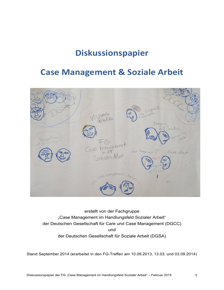 Diskussionspapier Case Management & Soziale Arbeit erstellt von der Fachgruppe „Case Management im Handlungsfeld Sozialer Arbeit“ der Deutschen Gesellschaft für Care und Case Management (DGCC) und der Deutschen Gesellschaft für Soziale Arbeit (DGSA) Stand September 2014 (erarbeitet in den FG-Treffen am 10.09.2013, 13.03. und 03.09.2014) Diskussionspapier der FG „Case Management im Handlungsfeld Sozialer Arbeit“ – Februar 2015 1 Inhaltsverzeichnis 1. Einleitung ......................................................................................................... 3 2. Dimensionen .................................................................................................... 4 2.1. Dimension: Soziale Arbeit im Case Management ......................................................... 4 2.2. Dimension: Case Management in der Sozialen Arbeit .................................................. 5 2.3. Dimension: Schnittmengen und Gemeinsamkeiten zwischen Case Management und Soziale Arbeit........................................................................................................................ 6 3. Thesen zum Case Management im Kontext der Sozialen Arbeit ..................... 6 4. Fazit .................................................................................................................. 7 Diskussionspapier der FG „Case Management im Handlungsfeld Sozialer Arbeit“ – Februar 2015 2 1. Einleitung Dieses Diskussionspapier wurde im Rahmen der Fachgruppe „Case Management im Handlungsfeld Sozialer Arbeit“ entwickelt. Die Fachgruppe setzt sich aus VertreterInnen der DGCC und DGSA, aus der Praxis sowie aus dem wissenschaftlichen Bereich zusammen. Ziel des Diskussionspapiers ist es, einen Beitrag zu leisten, das Verhältnis von Sozialer Arbeit und Case Management näher zu bestimmen und die Diskussion über die Verortung und Ausrichtung von Case Management in der Sozialen Arbeit und der Sozialen Arbeit im Case Management anzuregen. Insofern versteht sich dieses Papier nicht als „Endprodukt“, sondern soll vielmehr eine kontroverse Diskussion und Weiterentwicklung vorantreiben. Die Konturen und Funktionen von Case Management sind sowohl theoretisch als auch praktisch teilweise schwer zu erfassen, da sich das Handlungskonzept in unterschiedlichen beruflichen Kontexten entwickelt hat. Theoretische Ausführungen beziehen sich vor allem auf die Bereiche Soziale Arbeit und Pflege. Verwurzelt ist Case Management jedoch klar in der Sozialen Arbeit, wo es sich aus der Einzelfallarbeit (casework) im Laufe des 20. Jahrhunderts weiterentwickelt hat. Mittlerweile wird Case Management von vielen Berufsgruppen in unterschiedlichen Handlungsfeldern wie Kinder- und Jugendhilfe, Justiz, Altenhilfe und Pflege umgesetzt. Die Umsetzung erfolgt in Anlehnung an die theoretischen Bezüge, die sich im Laufe der Zeit entfaltet haben. Da der theoretische Hintergrund von Case Management durch verschiedene Wissenschaften geprägt ist, geht es der Fachgruppe insbesondere darum, die Basics der Sozialen Arbeit im Case Management herauszustellen. Weiterentwicklungsmöglichkeiten aber auch Erfordernisse aus Sicht der Sozialen Arbeit an Case Management sollen aufgezeigt werden. Das vorliegende Diskussionspapier möchte im Sinne des „good practice“-Ansatzes eine Orientierung für die Konzeptionierung und Umsetzung von Case Management bieten. Zudem soll es der Positionierung von Praktikern z.B. gegenüber dem Team, Vorgesetzten, Kooperationspartnern oder anderer Dienste dienen. Diskussionspapier der FG „Case Management im Handlungsfeld Sozialer Arbeit“ – Februar 2015 3 2. Dimensionen Im Rahmen einer ausführlichen Diskussion innerhalb der Fachgruppe wurden drei Dimensionen herausgearbeitet, die nachfolgend beschrieben werden: 1. Soziale Arbeit im Case Management, 2. Case Management in der Sozialen Arbeit sowie 3. Schnittmengen und Gemeinsamkeiten zwischen Case Management und Soziale Arbeit. Wir möchten betonen, dass es sich nicht um hierarchische, sondern um gleichrangige Dimensionen handelt. 2.1. Dimension: Soziale Arbeit im Case Management Unterschiedlichste soziale Problemlagen von Menschen sowie gesellschaftliche Exklusionsprozesse erfordern, dass SozialarbeiterInnen in verschiedenen Lebensbereichen und Versorgungssystemen (wie Bildungs-, Sozial- und Gesundheitswesen) agieren, um individuelle Lebensbedingungen als auch gesellschaftliche Bedingungen zu verbessern. Im Rahmen dieser Dimension ist zu betrachten, welche Wurzeln dem Handlungsansatz Case Management zugrunde liegen z.B. in Bezug auf die Historie, systemische Aspekte und die Gestaltung der Beziehungsebene. Ein ökosozialer Theoriehintergrund mit einem doppelten Fokus auf die Personen und deren Umwelt kennzeichnen Case Management., d. h. sozialarbeiterische Denk- und Handlungsweise sind in jedem Case Management-Ansatz eingebettet und zwar auch wenn diese im Kontext des Gesundheits- und Versicherungswesens realisiert werden. Dies bedeutet, dass sozialarbeiterisches Wissen und Handlungskompetenzen im Case Management notwendig sind. Beispiele hierfür sind: • Gesprächsführung à Beziehungsarbeit und Herstellung von Arbeitsbündnissen/beziehungen • nicht nur lineares Denken, sondern „sozialer“ mehrdimensionaler Blick/Perspektive auf das Individuum, Sozialsysteme und die Gesellschaft • systemisches Denken, das Wechselwirkungen und Vernetzungen zwischen Systemen berücksichtig • Hilfeprozesse nicht auf Verfahrensabläufe/Maßnahmen reduzieren • Netzwerkarbeit: Verknüpfung formeller und informeller Netze/Gemeinwesen • Lebensweltorientierung und „Vielfalt des Lebens“/des Sozialen wahrnehmen • Selbstreflexionsfähigkeit der Fachkräfte • Generalistischer Ansatz der Sozialen Arbeit, in dessen Rahmen SozialarbeiterInnen „Übergangskommunikation machen“/Übersetzerfunktion übernehmen • Berufsauftrag der Sozialen Arbeit à Einsatz für Soziale Gerechtigkeit und das Selbstbestimmungsrecht des