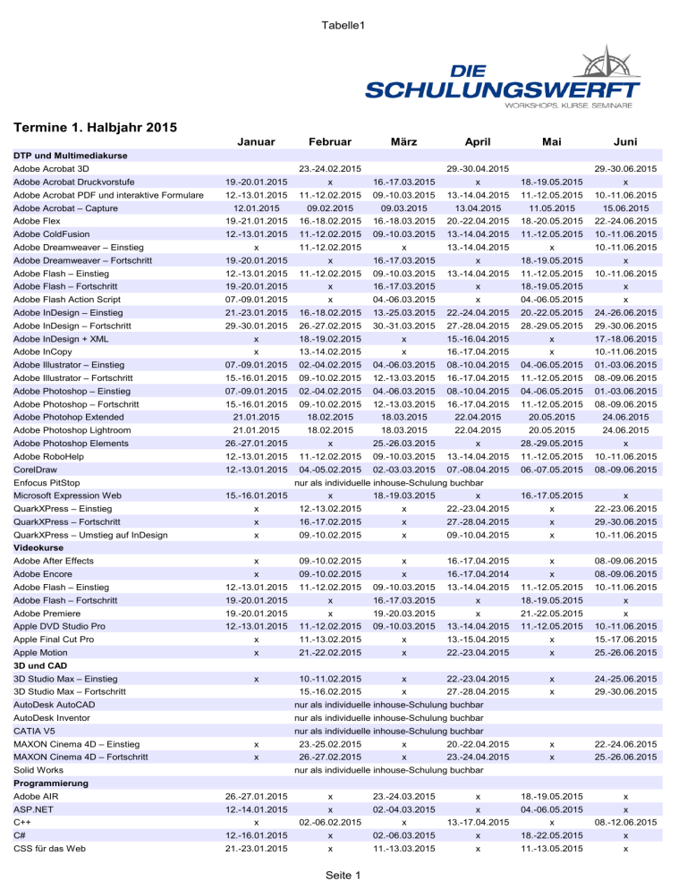 Tabelle1 Termine 1. Halbjahr 2015 Januar Februar März April Mai Juni DTP und Multimediakurse Adobe Acrobat 3D 23.-24.02.2015 29.-30.04.2015 29.-30.06.2015 Adobe Acrobat Druckvorstufe 19.-20.01.2015 x 16.-17.03.2015 x 18.-19.05.2015 x Adobe Acrobat PDF und interaktive Formulare 12.-13.01.2015 11.-12.02.2015 09.-10.03.2015 13.-14.04.2015 11.-12.05.2015 10.-11.06.2015 Adobe Acrobat – Capture 12.01.2015 09.02.2015 09.03.2015 13.04.2015 11.05.2015 15.06.2015 Adobe Flex 19.-21.01.2015 16.-18.02.2015 16.-18.03.2015 20.-22.04.2015 18.-20.05.2015 22.-24.06.2015 Adobe ColdFusion 12.-13.01.2015 11.-12.02.2015 09.-10.03.2015 13.-14.04.2015 11.-12.05.2015 10.-11.06.2015 x 11.-12.02.2015 x 13.-14.04.2015 x 10.-11.06.2015 Adobe Dreamweaver – Einstieg Adobe Dreamweaver – Fortschritt 19.-20.01.2015 x 16.-17.03.2015 x 18.-19.05.2015 x Adobe Flash – Einstieg 12.-13.01.2015 11.-12.02.2015 09.-10.03.2015 13.-14.04.2015 11.-12.05.2015 10.-11.06.2015 x Adobe Flash – Fortschritt 19.-20.01.2015 x 16.-17.03.2015 x 18.-19.05.2015 Adobe Flash Action Script 07.-09.01.2015 x 04.-06.03.2015 x 04.-06.05.2015 x Adobe InDesign – Einstieg 21.-23.01.2015 16.-18.02.2015 13.-25.03.2015 22.-24.04.2015 20.-22.05.2015 24.-26.06.2015 Adobe InDesign – Fortschritt 29.-30.01.2015 26.-27.02.2015 30.-31.03.2015 27.-28.04.2015 28.-29.05.2015 29.-30.06.2015 Adobe InDesign + XML x 18.-19.02.2015 x 15.-16.04.2015 x 17.-18.06.2015 Adobe InCopy x 13.-14.02.2015 x 16.-17.04.2015 x 10.-11.06.2015 Adobe Illustrator – Einstieg 07.-09.01.2015 02.-04.02.2015 04.-06.03.2015 08.-10.04.2015 04.-06.05.2015 01.-03.06.2015 Adobe Illustrator – Fortschritt 15.-16.01.2015 09.-10.02.2015 12.-13.03.2015 16.-17.04.2015 11.-12.05.2015 08.-09.06.2015 Adobe Photoshop – Einstieg 07.-09.01.2015 02.-04.02.2015 04.-06.03.2015 08.-10.04.2015 04.-06.05.2015 01.-03.06.2015 Adobe Photoshop – Fortschritt 15.-16.01.2015 09.-10.02.2015 12.-13.03.2015 16.-17.04.2015 11.-12.05.2015 08.-09.06.2015 Adobe Photohop Extended 21.01.2015 18.02.2015 18.03.2015 22.04.2015 20.05.2015 24.06.2015 Adobe Photoshop Lightroom 21.01.2015 18.02.2015 18.03.2015 22.04.2015 20.05.2015 24.06.2015 Adobe Photoshop Elements 26.-27.01.2015 x 25.-26.03.2015 x 28.-29.05.2015 x Adobe RoboHelp 12.-13.01.2015 11.-12.02.2015 09.-10.03.2015 13.-14.04.2015 11.-12.05.2015 10.-11.06.2015 CorelDraw 12.-13.01.2015 04.-05.02.2015 02.-03.03.2015 07.-08.04.2015 06.-07.05.2015 08.-09.06.2015 Enfocus PitStop Microsoft Expression Web QuarkXPress – Einstieg nur als individuelle inhouse-Schulung buchbar 15.-16.01.2015 x 18.-19.03.2015 x 16.-17.05.2015 x x 12.-13.02.2015 x 22.-23.04.2015 x 22.-23.06.2015 QuarkXPress – Fortschritt x 16.-17.02.2015 x 27.-28.04.2015 x 29.-30.06.2015 QuarkXPress – Umstieg auf InDesign x 09.-10.02.2015 x 09.-10.04.2015 x 10.-11.06.2015 Adobe After Effects x 09.-10.02.2015 x 16.-17.04.2015 x 08.-09.06.2015 Adobe Encore x 09.-10.02.2015 x 16.-17.04.2014 x 08.-09.06.2015 Adobe Flash – Einstieg 12.-13.01.2015 11.-12.02.2015 09.-10.03.2015 13.-14.04.2015 11.-12.05.2015 10.-11.06.2015 Adobe Flash – Fortschritt 19.-20.01.2015 x 16.-17.03.2015 x 18.-19.05.2015 x Videokurse Adobe Premiere 19.-20.01.2015 x 19.-20.03.2015 x 21.-22.05.2015 x Apple DVD Studio Pro 12.-13.01.2015 11.-12.02.2015 09.-10.03.2015 13.-14.04.2015 11.-12.05.2015 10.-11.06.2015 Apple Final Cut Pro x 11.-13.02.2015 x 13.-15.04.2015 x 15.-17.06.2015 Apple Motion x 21.-22.02.2015 x 22.-23.04.2015 x 25.-26.06.2015 3D und CAD 3D Studio Max – Einstieg x 3D Studio Max – Fortschritt 10.-11.02.2015 x 22.-23.04.2015 x 24.-25.06.2015 15.-16.02.2015 x 27.-28.04.2015 x 29.-30.06.2015 AutoDesk AutoCAD nur als individuelle inhouse-Schulung buchbar AutoDesk Inventor nur als individuelle inhouse-Schulung buchbar CATIA V5 nur als individuelle inhouse-Schulung buchbar MAXON Cinema 4D – Einstieg x 23.-25.02.2015 x 20.-22.04.2015 x 22.-24.06.2015 MAXON Cinema 4D – Fortschritt x 26.-27.02.2015 x 23.-24.04.2015 x 25.-26.06.2015 x Solid Works nur als individuelle inhouse-Schulung buchbar Programmierung Adobe AIR 26.-27.01.2015 x 23.-24.03.2015 x 18.-19.05.2015 ASP.NET 12.-14.01.2015 x 02.-04.03.2015 x 04.-06.05.2015 x x 02.-06.02.2015 x 13.-17.04.2015 x 08.-12.06.2015 C++ C# 12.-16.01.2015 x 02.-06.03.2015 x 18.-22.05.2015 x CSS für das Web 21.-23.01.2015 x 11.-13.03.2015 x 11.-13.05.2015 x Seite 1 Tabelle1 HTML 12.-14.01.2015 16.-18.02.2015 16.-18.03.2015 13.-15.04.2015 18.-20.05.2015 15.-17.06.2015 x 11.-12.02.2015 x 13.-14.04.2015 x 10.-11.06.2015 Java – Einstieg 12.-16.01.2015 09.-13.02.2015 02.-06.03.2015 13.-17.04.2015 04.-08.05.2015 08.-12.06.2015 Java – Fortschritt 19.-22-01.2015 x 23.-26.03.2015 x x 08.-11.06.2015 JavaScript 19.-21.01.2015 09.-11.02.2015 25.-27.03.2015 13.-15.04.2015 11.-13.05.2015 08.-10.06.2015 PHP 19.-20.01.2015 11.-13.02.2015 09.-11.03.2015 13.-15.04.2015 11.-13.05.2015 15.-17.06.2015 Perl x 02.-06.02.2015 x 13.-17.04.2015 x 08.-12.06.2015 Typo3 12.-14.01.2015 16.-18.02.2015 16.-18.03.2015 13.-15.04.2015 18.-20.05.2015 15.-17.06.2015 Visual Basic 12.-14.01.2015 16.-18.02.2015 16.-18.03.2015 13.-15.04.2015 18.-20.05.2015 15.-17.06.2015 Visual Basic mit Word x 09.-11.02.2015 x 13.-15.04.2015 x 08.-10.06.2015 Visual Basic mit Excel 12.-14.01.2015 09.-11.02.2015 02.-04.03.2015 13.-15.04.2015 04.-06.05.2015 08.-10.06.2015 Visual Basic mit Access 26.-28.01.2015 23.-25.02.2015 25.-27.03.2015 20.-22.04.2015 20.-22.05.2015 22.-24.06.2015 XML 26.-28.01.2015 23.-25.02.2015 23.-25.03.2015 20.-22.04.2015 18.-20.05.2015 22.-24.06.2015 Microsoft Access – Einstieg 19.-21.01.2015 11.-13.02.2015 09.-11.03.2015 13.-15.04.2015 11.-13.05.2015 15.-17.06.2015 Microsoft Access – Fortschritt 28.-29.01.2015 23.-24.02.2015 18.-19.03.2015 20.-21.04.2015 26.-27.05.2015 22.-23.06.2015 My SQL 08.-09.01.2015 02.-03.02.2015 04.-05.03.2015 01.-02.04.2015 04.-05.05.2015 01.-02.06.2015 Microsoft Excel – Einstieg 12.-13.01.2015 04.-05.02.2015 02.-03.03.2015 07.-08.04.2015 06.-07.05.2015 08.-09.06.2015 Microso