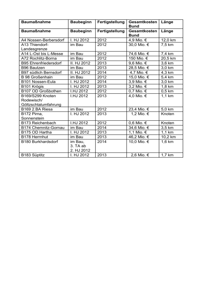 Baumaßnahme Baubeginn Baumaßnahme Baubeginn A4 Nossen-Berbersdorf A13 ThiendorfLandesgrenze A14 L-Ost bis L-Messe A72 Rochlitz-Borna B95 Ehrenfriedersdorf B96 Bautzen B97 südlich Bernsdorf B 98 Großenhain B101 Nossen-Eula B101 Krögis B107 OD Großbothen B169/S299 Knoten Rodewisch/ Göltzschtalumfahrung B169 2.BA Riesa B172 Pirna, Sonnenstein B173 Reichenbach B174 Chemnitz-Gornau B175 OD Hartha B178 Herrnhut B180 Burkhardsdorf I. HJ 2012 im Bau Fertigstellung Gesamtkosten Bund Fertigstellung Gesamtkosten Bund 2012 4,9 Mio. € 2012 30,0 Mio. € im Bau im Bau II. HJ 2012 im Bau II. HJ 2012 im Bau I. HJ 2012 I. HJ 2012 I.HJ 2012 I.HJ 2012 2012 2012 2013 2013 2014 2012 2014 2013 2012 2013 74,6 Mio. € 150 Mio. € 9,6 Mio. € 28,5 Mio. € 4,7 Mio. € 15,0 Mio. € 3,9 Mio. € 3,2 Mio. € 0,7 Mio. € 4,0 Mio. € 7,4 km 20,5 km 3,6 km 3,0 km 4,3 km 5,4 km 3,0 km 1,8 km 0,5 km 1,1 km im Bau I. HJ 2012 2012 2013 23,4 Mio. € 1,2 Mio. € 5,0 km Knoten I.HJ 2012 im Bau I. HJ 2012 im Bau im Bau, 3. TA ab 2. HJ 2012 I. HJ 2012 2012 2014 2013 2013 2014 0,6 Mio. € 34,6 Mio. € 1,1 Mio. € 46,2 Mio. € 10,0 Mio. € Knoten 3,5 km 1,1 km 10,2 km 1,6 km 2013 2,6 Mio. € 1,7 km B183 Süptitz Länge Länge 12,0 km 7,5 km