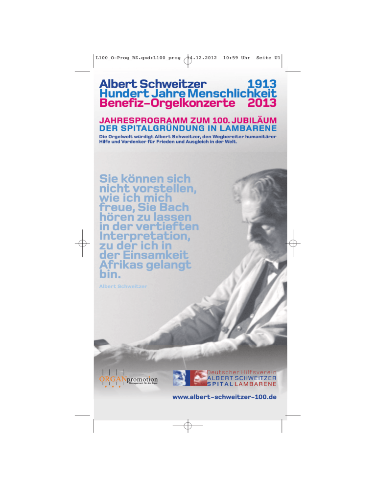 L100_O-Prog_RZ.qxd:L100_prog 14.12.2012 10:59 Uhr Seite U1 Albert Schweitzer 1913 Hundert JahreMenschlichkeit Benefiz-Orgelkonzerte 2013 JAHRESPROGRAMM ZUM 100. JUBILÄUM DER SPITALGRÜNDUNG IN LAMBARENE Die Orgelwelt würdigt Albert Schweitzer, den Wegbereiter humanitärer Hilfe und Vordenker für Frieden und Ausgleich in der Welt. Sie können sich nicht vorstellen, wie ich mich freue, Sie Bach hören zu lassen in der vertieften Interpretation, zu der ich in der Einsamkeit Afrikas gelangt bin. Albert Schweitzer www.albert-schweitzer-100.de L100_O-Prog_RZ.qxd:L100_prog 14.12.2012 10:59 Uhr Seite U2 Ehrfurcht vor dem Leben bedeutet: Ich bin Leben, das leben will, inmitten von Leben, das leben will. 2013 feiern wir das 100. Jubiläum von Albert Schweitzers Spitalgründung in Afrika. Mit seinem Spital in Lambarene ist er zum Wegbereiter humanitärer Hilfe geworden. Seine Ethik der Ehrfurcht vor dem Leben ist richtungsweisend für Menschlichkeit und Frieden, auch in der heutigen Welt. Wir würdigen das humanitäre Erbe Albert Schweitzers mit einem umfangreichen Jahresprogramm aus Vorträgen, einem Symposium, Ausstellungen, Publikationen und über 150 Benefiz-Orgelkonzerten. Albert Schweitzer Das Jahresprogramm „Hundert Jahre Menschlichkeit“ ist eine Initiative des Deutschen Hilfsvereins für das Albert-Schweitzer-Spital in Lambarene e. V., Frankfurt am Main, in Zusammenarbeit mit ORGANpromotion, der Gesellschaft der Orgelfreunde und dem Albert-SchweitzerKomitee e. V., Weimar Schirmherr Dr. Friedrich Schorlemmer Alle Informationen auch unter: www.albert-schweitzer-100.de 1 L100_O-Prog_RZ.qxd:L100_prog 14.12.2012 10:59 Uhr Seite 2 Hundert Jahre Lambarene Grußwort des Schirmherrn Hundert Jahre Menschlichkeit Wenn Herz und Vernunft zusammenstimmen Albert Schweitzer (1875–1965) verlebte seine Kindheit und Jugend in Günsbach im Elsass, wo sein Vater, ein liberaler evangelischer Theologe, eine Pfarrstelle hatte. Diese Umgebung, eine besondere Veranlagung und einschneidende Erlebnisse führten dazu, dass er bereits in jungen Jahren ein starkes ethisches Bewusstsein entwickelte. Albert Schweitzer ist ein in sich stimmiger Mensch gewesen, der mit aller Konsequenz einem Lebensideal folgte, der vielfach idealisiert wurde, ohne dass er selber Heroisches, Heiliges, Überhebliches oder gar Eingebildetes an sich gehabt hätte – wiewohl er sich wirkungsvoll darzustellen wusste und seine Schwächen, das Ungenügen seiner Erkenntnis und seiner Lebenspraxis durchaus kannte. Schon während seines Lebens wurde er für Ungezählte ein Vorbild. Er hat mehrere Generationen motiviert und inspiriert, bereichert und bestärkt, aufgerichtet und ausgerichtet. Auf die Jugend hat er nie aufgehört, seine Hoffnung zu setzen. Er war und ist ein Lebenslehrer – mit seinem Wissen, seiner Weite, seiner Weisheit. Nachdem er sich zunächst als Theologe, Schriftsteller und Organist einen Namen gemacht hatte, entschloss er sich mit 30 Jahren zu einem Studium der Medizin, um daraufhin 1913 in der französischen Missionsstation in Lambarene in Äquatorialafrika mit seiner Frau Helene ein Spital zu gründen und so in den Dienst der „Ärmsten der Armen“ zu treten. Neben der Arbeit als Arzt und Baumeister des Spitals entwickelte er seine berühmt gewordene Ethik der „Ehrfurcht vor dem Leben“ – ein Begriff, der Allgemeingut wurde und den heute viele karitative und Umweltorganisationen beherzigen. Von früher Kindheit an hatte Schweitzer das Orgelspiel erlernt und schon als Neunjähriger den Organisten bei den Gottesdiensten seines Vaters vertreten. Später wurde er als Autor eines französischen und deutschen Bachbuches, vor allem aber als Organist, über Europa hinaus bekannt. Es waren seine Orgelkonzerte, die ihm bei vielen Europaaufenthalten die finanziellen Mittel für den Unterhalt seines Spitals einbrachten. Mit über 150 Benefiz-Orgelkonzerten und anderen Veranstaltungen im Jubiläumsjahr 2013 wollen wir Albert Schweitzers immer aktuellere Gedankenwelt im Bewusstsein unserer Zeit wachhalten. Mit den Spenden des Jubiläumsjahrs möchten wir die dringend notwendige Sanierung des Spitals in Lambarene unterstützen, damit dieses Symbol der Menschlichkeit noch möglichst vielen medizinischer Hilfe bedürftigen Menschen zugutekommt. Dieser Friedensnobelpreisträger war ein deutscher Gelehrter, der in wissenschaftlicher Lehre oder in seinem Ruhm als Theologe, Philosoph, Bach-Forscher und Organist nicht sein Genüge zu finden vermochte, solange es auf der Welt Menschen gibt, die verhungern und verkommen, verlassen und vergessen sind. Er dachte und handelte – wie wir es heute sagen würden – global. Und er suchte den Ort auf, an dem er lokal nützlich sein könnte. Er wollte kein Vorbild sein, sondern schlicht, konsequent und mit Empathie dem Vorbild eines Jesus folgen, der sich um die Mühseligen und Beladenen kümmerte. Tief-innen verspürte (Mit-)Verantwortung für leidende Geschöpfe trieb ihn an. Hilfe ist nötig. Hilfe ist möglich. Hilfe braucht Menschen, die sie persönlich bringen, mit ganzem Einsatz, mit aller zur Verfügung stehenden Kompetenz, mit Einfühlung und Willenskraft. Sich heute mit Albert Schweitzer auseinanderzusetzen bedeutet, sich selber mit Fragen zu konfrontieren, die nichts von ihrer Dringlichkeit verloren haben. Dr. Friedrich Schorlemmer Schirmherr des Jubiläumsjahres Dr. Einhard Weber Vorsitzender des Vorstands des Deutschen Hilfsvereins für das Albert-Schweitzer-Spital in Lambarene e. V. 2 3 L100_O-Prog_RZ.qxd:L100_prog 14.12.2012 10:59 Uhr Seite 4 Die Orgelwelt und das humanitäre Erbe Albert Schweitzers Albert Schweitzer und die Orgel 100 Jahre Albert-Schweitzer-Spital in Lambarene: Für die internationale Gesellschaft der Orgelfreunde (GdO) ist es eine besondere Ehre und Verpflichtung gleichermaßen, die Benefizkonzerte des Jahres 2013 für Lambarene zu unterstützen sowie teilweise als Mitveranstalter auch zu gestalten. Albert Schweitzer hat sein humanitäres Engagement immer ve