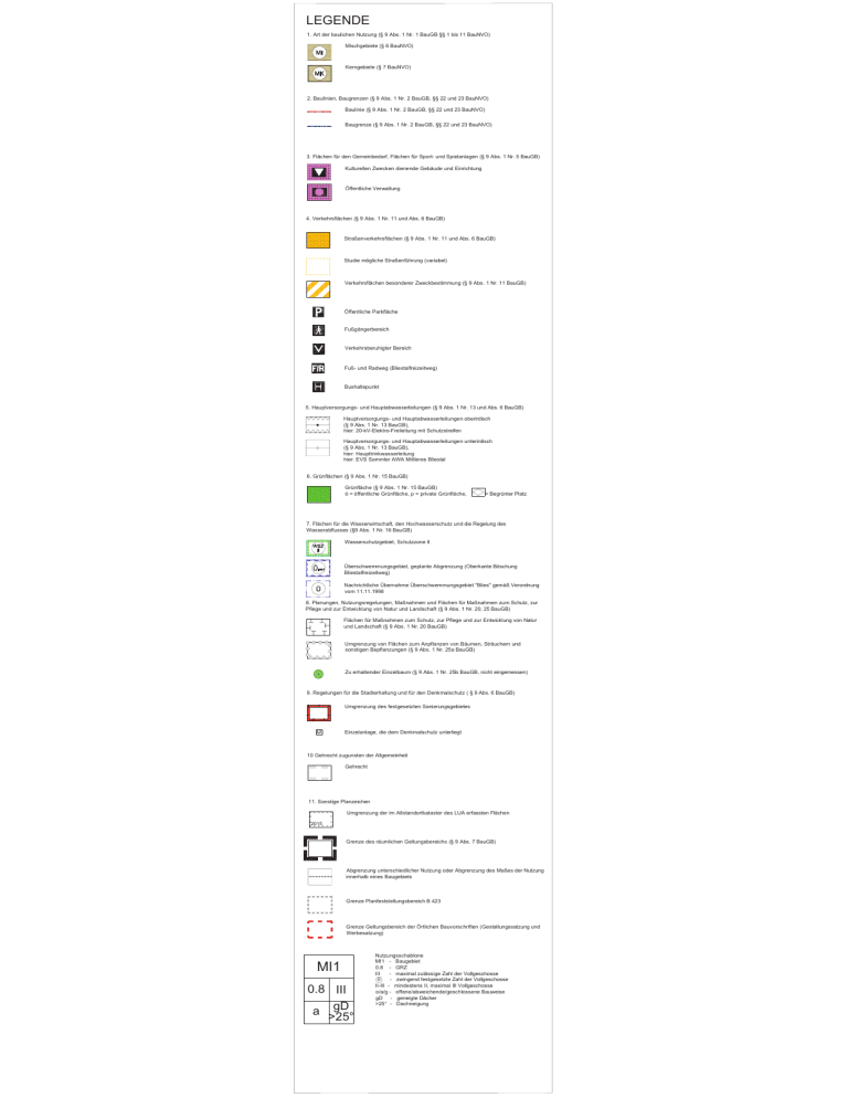 LEGENDE 1. Art der baulichen Nutzung (§ 9 Abs. 1 Nr. 1 BauGB §§ 1 bis 11 BauNVO) Mischgebiete (§ 6 BauNVO) Kerngebiete (§ 7 BauNVO) 2. Baulinien, Baugrenzen (§ 9 Abs. 1 Nr. 2 BauGB, §§ 22 und 23 BauNVO) Baulinie (§ 9 Abs. 1 Nr. 2 BauGB, §§ 22 und 23 BauNVO) Baugrenze (§ 9 Abs. 1 Nr. 2 BauGB, §§ 22 und 23 BauNVO) 3. Flächen für den Gemeinbedarf, Flächen für Sport- und Spielanlagen (§ 9 Abs. 1 Nr. 5 BauGB) Kulturellen Zwecken dienende Gebäude und Einrichtung Öffentliche Verwaltung 4. Verkehrsflächen (§ 9 Abs. 1 Nr. 11 und Abs. 6 BauGB) Straßenverkehrsflächen (§ 9 Abs. 1 Nr. 11 und Abs. 6 BauGB) Studie mögliche Straßenführung (variabel) Verkehrsflächen besonderer Zweckbestimmung (§ 9 Abs. 1 Nr. 11 BauGB) Öffentliche Parkfläche Fußgängerbereich Verkehrsberuhigter Bereich Fuß- und Radweg (Bliestalfreizeitweg) Bushaltepunkt 5. Hauptversorgungs- und Hauptabwasserleitungen (§ 9 Abs. 1 Nr. 13 und Abs. 6 BauGB) Hauptversorgungs- und Hauptabwasserleitungen oberirdisch (§ 9 Abs. 1 Nr. 13 BauGB), hier: 20-kV-Elektro-Freileitung mit Schutzstreifen Hauptversorgungs- und Hauptabwasserleitungen unterirdisch (§ 9 Abs. 1 Nr. 13 BauGB), hier: Haupttrinkwasserleitung hier: EVS Sammler AWA Mittleres Bliestal 6. Grünflächen (§ 9 Abs. 1 Nr. 15 BauGB) Grünfläche (§ 9 Abs. 1 Nr. 15 BauGB) ö = öffentliche Grünfläche, p = private Grünfläche, = Begrünter Platz 7. Flächen für die Wasserwirtschaft, den Hochwasserschutz und die Regelung des Wasserabflusses (§9 Abs. 1 Nr. 16 BauGB) Wasserschutzgebiet, Schutzzone II Überschwemmungsgebiet, geplante Abgrenzung (Oberkante Böschung Bliestalfreizeitweg) Nachrichtliche Übernahme Überschwemmungsgebiet "Blies" gemäß Verordnung vom 11.11.1998 8. Planungen, Nutzungsregelungen, Maßnahmen und Flächen für Maßnahmen zum Schutz, zur Pflege und zur Entwicklung von Natur und Landschaft (§ 9 Abs. 1 Nr. 20, 25 BauGB) Flächen für Maßnahmen zum Schutz, zur Pflege und zur Entwicklung von Natur und Landschaft (§ 9 Abs. 1 Nr. 20 BauGB) Umgrenzung von Flächen zum Anpflanzen von Bäumen, Sträuchern und sonstigen Bepflanzungen (§ 9 Abs. 1 Nr. 25a BauGB) Zu erhaltender Einzelbaum (§ 9 Abs. 1 Nr. 25b BauGB, nicht eingemessen) 9. Regelungen für die Stadterhaltung und für den Denkmalschutz ( § 9 Abs. 6 BauGB) Umgrenzung des festgesetzten Sanierungsgebietes D Einzelanlage, die dem Denkmalschutz unterliegt 10 Gehrecht zugunsten der Allgemeinheit Gehrecht 11. Sonstige Planzeichen Umgrenzung der im Altstandortkataster des LUA erfassten Flächen 2015 Grenze des räumlichen Geltungsbereichs (§ 9 Abs. 7 BauGB) Abgrenzung unterschiedlicher Nutzung oder Abgrenzung des Maßes der Nutzung innerhalb eines Baugebiets Grenze Planfeststellungsbereich B 423 Grenze Geltungsbereich der Örtlichen Bauvorschriften (Gestaltungssatzung und Werbesatzung) MI1 0.8 III gD a >25° Nutzungsschablone MI1 - Baugebiet 0.8 - GRZ III - maximal zulässige Zahl der Vollgeschosse II - zwingend festgesetzte Zahl der Vollgeschosse II-III - mindestens II, maximal III Vollgeschosse o/a/g - offene/abweichende/geschlossene Bauweise gD - geneigte Dächer >25° - Dachneigung TEIL B: TEXTLICHE FESTSETZUNGEN I. FESTSETZUNGEN gemäß § 9 Abs. 1 BauGB und BauNVO 1. 1.1 Art der baulichen Nutzung gemäß § 9 Abs. 1 Nr. 1 BauNVO Mischgebiete gemäß § 6 BauNVO Mischgebiete dienen dem Wohnen und der Unterbringung von Gewerbebetrieben, die das Wohnen nicht wesentlich stören. Allgemein zulässig sind: 1. 2. 3. 4. 5. Wohngebäude Geschäfts- und Bürogebäude Einzelhandelsbetriebe, Schank- und Speisewirtschaften sowie Betriebe des Beherbergungsgewerbes Sonstige Gewerbebetriebe Anlagen für Verwaltungen sowie für kirchliche, kulturelle, gesundheitliche und sportliche Zwecke Im Baugebiet MI3 wird in Anwendung des § 1 Abs. 6 Nr. 2 BauNVO festgesetzt, dass Gartenbaubetriebe und Tankstellen allgemein zulässig sind. Im Baugebiet MI1* (Pavillon Luitpoldplatz) sind ausschließlich Einzelhandelsbetriebe, Schank- und Speisewirtschaften sowie Anlagen für kulturelle Zwecke und öffentliche Einrichtungen (z.B. Information) zulässig. In Anwendung des § 1 Abs. 5 BauNVO wird festgesetzt, dass folgende Nutzungsarten des § 6 Abs. 2 BauNVO nicht Bestandteil dieses Bebauungsplanes werden und somit unzulässig sind: 1. Gartenbaubetriebe (außer im MI 3) 2. Tankstellen (außer MI 3) 3. Vergnügungsstätten im Sinne des § 4a Abs. 3 Nr. 2 BauNVO 1.2 Kerngebiete gemäß § 7 BauNVO Kerngebiete dienen vorwiegend der Unterbringung von Handelsbetrieben sowie der zentralen Einrichtungen der Wirtschaft, der Verwaltung und der Kultur. Allgemein zulässig sind: 1. 2. 3. 4. 5. 6. Geschäfts-, Büro- und Verwaltungsgebäude Einzelhandelsbetriebe, Schank- und Speisewirtschaften sowie Betriebe des Beherbergungsgewerbes Sonstige nicht wesentlich störenden Gewerbebetriebe Anlagen für kirchliche, kulturelle, soziale, gesundheitliche und sportliche Zwecke Wohnungen für Aufsichts- und Bereitschaftspersonen sowie für Betriebsinhaber und Betriebsleiter sonstige Wohnungen ab dem 1. Obergeschoss. In Anwendung des § 1 Abs. 5 BauNVO wird festgesetzt, dass innerhalb der Kerngebiete Vergnügungsstätten und Tankstellen unzulässig sind. Zulässig sind ferner Tiefgaragen und Parkdecks, sofern sie in den Baukörper integriert werden und sich in das gestalterische Umfeld der historischen Altstadt einfügen. Gemäß § 9 Abs. 2 Nr. 2 wird festgesetzt, dass bis zur Realisierung der Kerngebietsnutzung innerhalb der MK1 im Bereich Festhallenvorplatz und Florianstraße/Ecke Bahnhofstraße eine Nutzung als öffentlicher Parkplatz zulässig ist. 2. Maß der baulichen Nutzung gemäß § 9 Abs. 1 Nr. 1 BauGB 2.1 Grundflächenzahl Gemäß § 16 Abs. 2 Nr. 1 i.V.m. §§ 17, 19 BauNVO wird die Obergrenze der GRZ festgesetzt. 2.2 Zahl der Vollgeschosse / Gebäudehöhen Die zulässige Anzahl der Vollgeschosse wird als Höchstmaß bzw, als zwingendes Maß festgesetzt. Zu beachten ist, dass die Gebäudehöhen benachbarter denkma