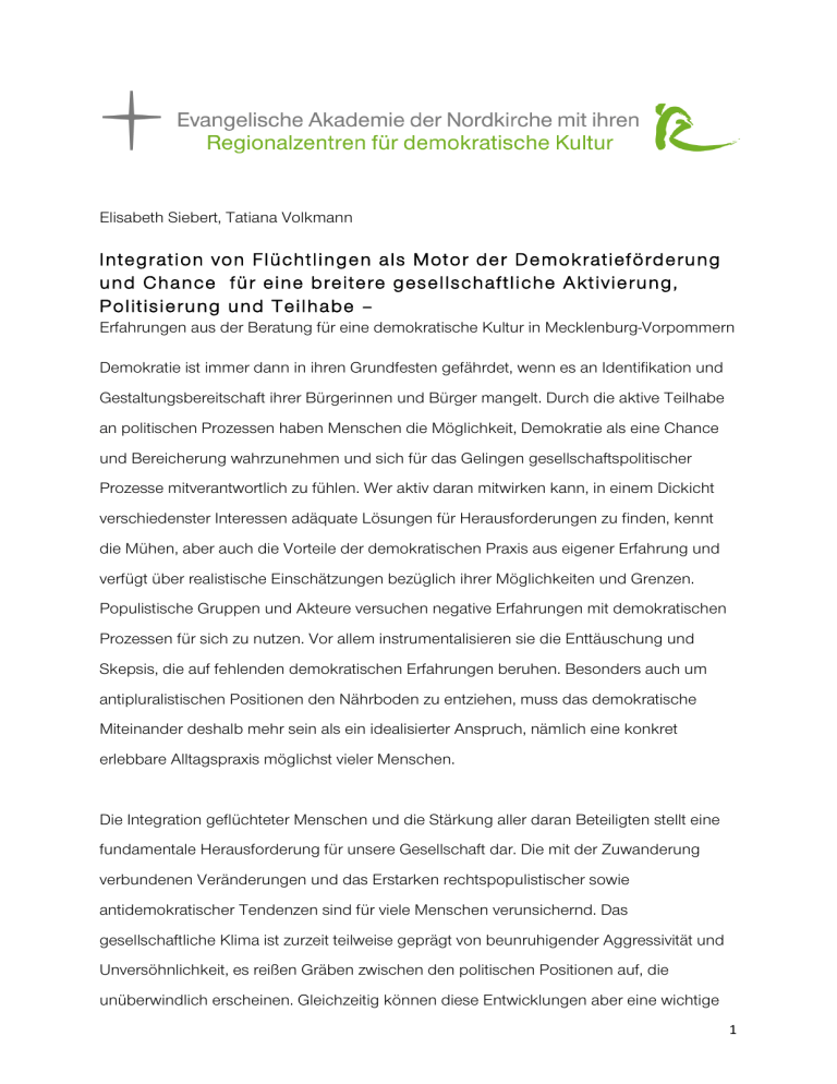 Elisabeth Siebert, Tatiana Volkmann Integration von Flüchtlingen als Motor der Demokratieförderung und Chance für eine breitere gesellschaftliche Aktivierung, Politisierung und Teilhabe – Erfahrungen aus der Beratung für eine demokratische Kultur in Mecklenburg-Vorpommern Demokratie ist immer dann in ihren Grundfesten gefährdet, wenn es an Identifikation und Gestaltungsbereitschaft ihrer Bürgerinnen und Bürger mangelt. Durch die aktive Teilhabe an politischen Prozessen haben Menschen die Möglichkeit, Demokratie als eine Chance und Bereicherung wahrzunehmen und sich für das Gelingen gesellschaftspolitischer Prozesse mitverantwortlich zu fühlen. Wer aktiv daran mitwirken kann, in einem Dickicht verschiedenster Interessen adäquate Lösungen für Herausforderungen zu finden, kennt die Mühen, aber auch die Vorteile der demokratischen Praxis aus eigener Erfahrung und verfügt über realistische Einschätzungen bezüglich ihrer Möglichkeiten und Grenzen. Populistische Gruppen und Akteure versuchen negative Erfahrungen mit demokratischen Prozessen für sich zu nutzen. Vor allem instrumentalisieren sie die Enttäuschung und Skepsis, die auf fehlenden demokratischen Erfahrungen beruhen. Besonders auch um antipluralistischen Positionen den Nährboden zu entziehen, muss das demokratische Miteinander deshalb mehr sein als ein idealisierter Anspruch, nämlich eine konkret erlebbare Alltagspraxis möglichst vieler Menschen. Die Integration geflüchteter Menschen und die Stärkung aller daran Beteiligten stellt eine fundamentale Herausforderung für unsere Gesellschaft dar. Die mit der Zuwanderung verbundenen Veränderungen und das Erstarken rechtspopulistischer sowie antidemokratischer Tendenzen sind für viele Menschen verunsichernd. Das gesellschaftliche Klima ist zurzeit teilweise geprägt von beunruhigender Aggressivität und Unversöhnlichkeit, es reißen Gräben zwischen den politischen Positionen auf, die unüberwindlich erscheinen. Gleichzeitig können diese Entwicklungen aber eine wichtige 1 Chance für eine Weiterentwicklung des demokratischen Diskurses und des Meinungsstreits bieten, denn immerhin ist das Desinteresse gegenüber politischen Entwicklungen, das in den vergangenen Jahrzehnten stetig zunahm, aktuell geringer denn je. Die Meinungen zum Thema Flucht und Asyl sind nicht immer reflektiert und beruhen oft auch auf Mutmaßungen oder Fehlinformationen, aber: es gibt kaum jemand, der oder die keine Position bezieht und Meinung äußert, und genau darin liegt auch eine Chance für Maßnahmen der Demokratieförderung. Mit welchen Inhalten und Ansätzen die Demokratieförderung diese Chancen mit Beratung und anderen Formen der Unterstützung zu nutzen versucht, wird hier am Beispiel der Regionalzentren für demokratische Kultur der Evangelischen Akademie der Nordkirche und deren Beratungstätigkeit in Mecklenburg-Vorpommern veranschaulicht. 1. Gemeinwesenbezogene Demokratieentwicklung – Regionalzentren für demokratische Kultur Die Anlässe und Möglichkeiten, sich in modernen Gesellschaften zu beraten und beraten zu lassen, sind vielfältig. Das Verständnis von Beratung reicht dabei von schlichter Information bis hin zu konzeptionell an therapeutischen Ansätzen orientierten Maßnahmen. Die Beratung für eine demokratische Kultur ist ein vergleichsweise junges Arbeitsfeld und eine sich noch im Stadium einer fortschreitenden Entwicklung befindliche Profession. In ihrem Fokus steht die plurale Gesellschaft, in der unterschiedliche Lebens- und Weltanschauungen wechselseitige Anerkennung finden sollen. Dort, wo Menschen einander begegnen, sei es in einer Gemeinde, einem Verein oder einer Organisation, am Arbeitsplatz, oder im privaten Umfeld, werden sowohl ihre Gemeinsamkeiten als auch ihre Unterschiedlichkeit erlebbar. Mit dieser spannenden Vielfalt gehen bisweilen auch Missverständnisse und mitunter auch Konflikte einher. Dies trifft insbesondere auf kulturell unterschiedlich geprägte Lebenswelten zu, die umso mehr zum Dialog und der Entwicklung einer konstruktiven Streitkultur herausfordern. 2 In Mecklenburg-Vorpommern arbeiten fünf Regionalzentren für demokratische Kultur, zwei davon in Trägerschaft der Evangelischen Akademie der Nordkirche. Die Arbeit wird durch das Bundesprogramm „Demokratie leben!“ des Bundesministeriums für Familie, Senioren, Frauen und Jugend sowie den Europäischen Sozialfonds geförderte. Ziel der fachlichen Beratung und Qualifizierung der Regionalzentren für demokratische Kultur ist es, demokratische Strukturen zu stärken und die Gesellschaft in der Prävention gegen demokratiefeindliche Ideologien zu unterstützen. Im Fokus der Beratungen stehen die Stärkung der Motivation, Befähigung und Gelegenheit zur gesellschaftlichen Teilhabe und die Förderung einer positiven Grundhaltung gegenüber der Pluralität kultureller und sozialer Lebenswirklichkeiten. Zu den Beratungsnehmenden zählen Amts- und Mandatsträger sowie ehrenamtlich Engagierte in Kirchen, Verwaltung, Politik und zivilgesellschaftlichen Organisationen. Die Anfänge der Regionalzentren für demokratische Kultur liegen in den Jahren unmittelbar vor und nach der Jahrtausendwende. Sie sind zum damaligen Zeitpunkt das Ergebnis des Wechselwirkens unterschiedlicher gesellschaftspolitischer Faktoren – damals mit starkem, aber nicht ausschließlichem Fokus auf Ostdeutschland: -­‐ latente Präsenz und teilweise massive Gewaltbereitschaft rechtsextremer Akteure, -­‐ unterschwellige Spannung zwischen einer institutionell starken Demokratie, einer in relevanten Teilen skeptisch-distanzierten Öffentlichkeit und einer sich allmählich entwickelnden, zivilen kritischen Bürgergesellschaft und schließlich -­‐ die Ausrufung des „Aufstandes der Anständigen“ durch den damaligen Bundeskanzler Gerhard Schröder im Jahr 2001 als Startsignal für ein langjähriges Engagement der damaligen Bundesregierung in die Entwicklung dieses Arbeitsfeldes. Das anfänglich zugrunde gelegte