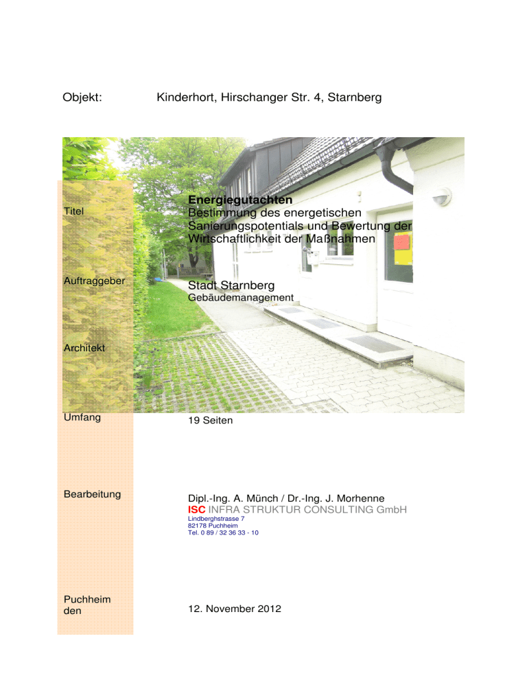 Objekt: Titel Auftraggeber Kinderhort, Hirschanger Str. 4, Starnberg Energiegutachten Bestimmung des energetischen Sanierungspotentials und Bewertung der Wirtschaftlichkeit der Maßnahmen Stadt Starnberg Gebäudemanagement Architekt Umfang 19 Seiten Bearbeitung Dipl.-Ing. A. Münch / Dr.-Ing. J. Morhenne ISC INFRA STRUKTUR CONSULTING GmbH Lindberghstrasse 7 82178 Puchheim Tel. 0 89 / 32 36 33 - 10 Puchheim den 12. November 2012 Energiegutachten Kinderhort ; Hirschanger Str. 4; Starnberg ISC GmbH Puchheim Inhalt: ZUSAMMENFASSUNG ......................................................................................................... 3 AUFGABE UND ZIEL............................................................................................................. 3 VORGEHENSWEISE ............................................................................................................. 4 ISTZUSTAND........................................................................................................................... 5 BAULICHE BESCHREIBUNG IM ÜBERBLICK ........................................................................... 5 BAULICHER ZUSTAND IM DETAIL ........................................................................................... 5 ISTZUSTAND DER TECHNIK..................................................................................................... 6 Beleuchtung .................................................................................................................... 6 Heizung ............................................................................................................................ 6 Warmwasserbereitung ................................................................................................. 6 Lüftung ............................................................................................................................. 6 Elektrische Verbraucher .............................................................................................. 6 ENERGIEBEDARF DES GEBÄUDES ................................................................................ 6 MAßNAHMEN IM BAULICHEN BEREICH ........................................................................ 7 AUßENWAND DÄMMEN ........................................................................................................... 9 EINSCHRÄNKUNGEN IN DER SANIERUNG DER WÄNDE........................................................ 11 ERNEUERUNG DER FENSTER ............................................................................................... 11 DACH- BZW. DECKENDÄMMUNG .......................................................................................... 13 KELLERDECKENDÄMMUNG .................................................................................................. 13 MAßNAHMEN IM TECHNISCHEN BEREICH ................................................................. 14 HEIZUNGSVERTEILUNG......................................................................................................... 14 HEIZUNGSANLAGE ................................................................................................................ 14 ÄNDERUNG DER WARMWASSERBEREITUNG ....................................................................... 15 ÄNDERUNG DER BELEUCHTUNG .......................................................................................... 15 ALTERNATIVE HEIZWÄRMERZEUGUNG ................................................................................ 16 FOTOVOLTAIK ....................................................................................................................... 16 BETRIEBSÄNDERUNGEN....................................................................................................... 16 ZUSAMMENFASSUNG VON EINSPARUNG UND KOSTEN ...................................... 17 DURCHFÜHRUNGSPRIORITÄTEN UND ABHÄNGIGKEITEN .................................. 18 ANHANG: WIRTSCHAFTLICHKEITSBETRACHTUNGEN EINZELMAßNAHMEN UND GESAMT ....................................................................................................................... 19 2 Energiegutachten Kinderhort ; Hirschanger Str. 4; Starnberg ISC GmbH Puchheim Zusammenfassung Der Kinderhort der Stadt Starnberg weist energetisches Sanierungspotential auf, das wirtschaftlich erschlossen werden kann. Eine umfassende Sanierung ermöglicht eine Energieeinsparung von 48% Wärme und 45% Strom. Wesentliche Maßnahmen sind • die Verbesserung der Wärmedämmung der Gebäudehülle • die Verbesserung der Beleuchtung • die Erneuerung der Heizung Prioritäten der Sanierung und die Wirtschaftlichkeit der Maßnahmen werden im folgenden Bericht aufgezeigt. Aufgabe und Ziel Unter dem Druck steigender Energiekosten und der Verantwortlichkeit für den Ausstoß klimaschädlicher Treibhausgasen, hervorgerufen durch das Verbrennen fossiler Brennstoffe, gilt es mit beschränkten finanziellen Ressourcen ein Maximum an Energieeinsparung und Sanierungseffekten zu erreichen. Dies erfordert eine grundlegende Betrachtung der Energieverluste und der baulichen Substanz, um Synergien zu erreichen, langfristige Konzepte zu entwickeln und den Gebäudebestand zukunftsfähig zu machen. Zukunftsfähigkeit bedeutet, die Gebäude in einer Weise zu ertüchtigen, dass sowohl der finanziellen Spielraum für zu erwartende Steigerungen der Energiekosten erreicht wird, als auch gegen Verknappungen im Energiesektor gerüstet zu sein. Mit der vorliegenden Studie wird dem Rechnung getragen, indem der Bestand analysiert wird und, auf dieser Betrachtung basierend, Konzepte entwickelt werden, die zu einer effektiven Reduktion des Energieverbrauchs führen 3 Energiegutachten Kinderhort ; Hirschanger Str. 4; Starnberg ISC GmbH Puchheim Vorgehensweise Basierend auf den vorhanden Bauunterlagen und Baubeschreibungen1, enthalten in den Bauakten, aber im wesentlichen basierend auf einer umfassenden Begehung, wurden G