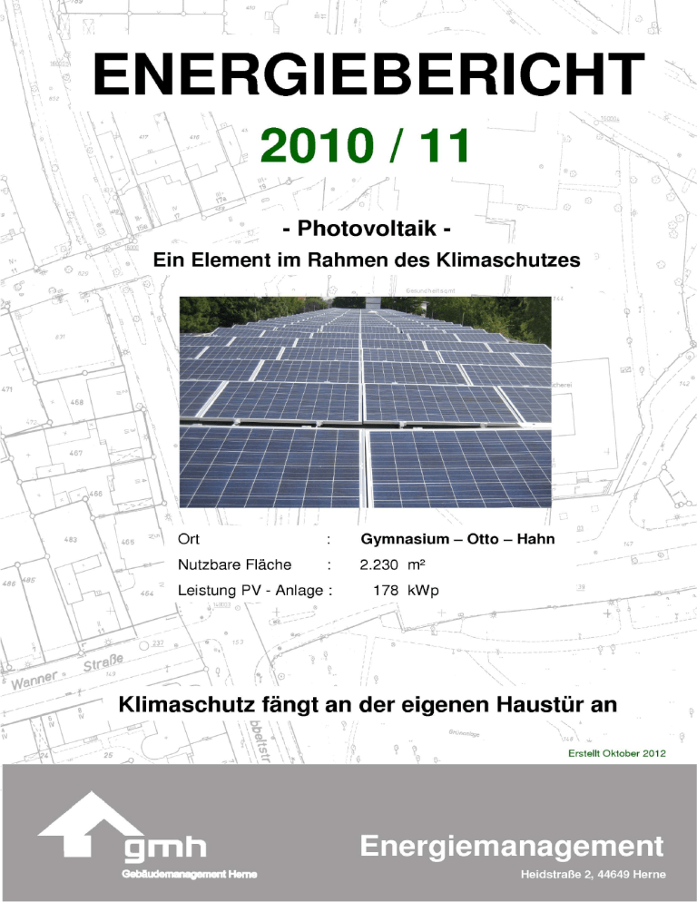 ENERGIEBERICHT 2010 / 11 Seite 0 FuB 3 ENERGIEBERICHT 2010 / 11 Inhaltsverzeichnis ENERGIEBERICHT 2010 / 2011 1. Verbrauchsanalyse Wärme / Strom / Wasser 2010 / 2011, Statistik 2. Beurteilung Wärme 2010 / 2011 witterungsbereinigt, Statistik 3. Kostenanalyse Wärme / Strom / Wasser 2010 / 2011 , Statistik 4. Kostenprognose Wärme / Strom / Wasser 2012 / 2013, HSK .………..……………… 15 5. Kostenszenario witterungsbereinigt …..……………………. 19 6. Ansatz Wirtschaftsplan/ Vorauszahlung / Abrechnung Energiebuchhaltung Verbrauchsjahre 2010 / 2011 7. Energieeffizienzkampagne „ mission E “ Zwischenbericht 8. Energiekontrolle, Regeltechnik, Gebäudeleittechnik (GLT) 9. Energetische Sanierung – Klimaschutz als Herausforderung FuB 3 …………….....….… 3 ……………………………………... 8 …………….……………. 11 ....……….. 23 …………………………... 25 .………. 32 ...… 39 9.1 Grundsatz Nachhaltigkeit ……………………………. 41 9.2 Energiesparhaus und Co. ………………………..…… 44 9.3 Die Anforderung steigt – Lüftung in Schulen .............…… 51 Seite 1 ENERGIEBERICHT 2010 / 11 10. Solarenergie in Herne …..……………………………................... 56 ………………….. 56 10.1 Bandbreite der Solarenergienutzung 10.2 Wissensvermittlung – wesentlicher Aspekt in Herne 10.3 Solar – City Herne?! ........... 59 …………………………….……..... 62 11. Das Solar - Dachflächen - Kataster der Stadt Herne ……………. 64 12. Verpachtung städtischer Dachflächen zum Zwecke der Solarenergienutzung ..….………. 70 13. Bauliche und technische Maßnahmen …………..…….…....... 75 13.1 Energetische Sanierung - Gymnasium Wanne 14. Seite 2 ………..….... 75 13.2 Techniksanierung 2009 - GS Vellwigstraße ........................ 87 13.3 Techniksanierung KiTa Mont-Cenis-Straße ........................ 91 Impressum ………………………………………….………..………. 94 FuB 3 ENERGIEBERICHT 2010 / 11 1.0 Verbrauchsanalyse Wärme / Strom / Wasser Wärme Tabelle und Diagramm 1 zeigen die Verbrauchsentwicklung Wärme aller städtischen Liegenschaften. Die Darstellung umfasst die Verbrauchsjahre 2006 - 2011 mit absoluter und prozentualer Verbrauchsstatistik, gegliedert nach unterschiedlichen Energieträger, Versorgern und Tarifen. Dargestellt werden die realen Verbräuche ohne Berücksichtigung der Witterung. Tabelle 1 - Verbrauch Diagramm 1 - Entwicklung Verbrauch Für die Versorgung aller städtischen Liegenschaften mit Wärme der Träger Gas, Fernwärme sowie Sonstige waren im Verbrauchsjahr 2010 real rd. 70.400.000 kWh und im Verbrauchsjahr 2011 rd. 55.900.000 kWh notwendig. Im Vergleich der Verbrauchsjahre 2010/11 zum Jahr 2009, zeigt sich die Einflussnahme der Witterung auf die realen Verbrauchswerte. Die extreme Witterung zum Jahreswechsel 2009/10 mit der langen Kälteperiode im ersten Quartal 2010, zeigt sich in der Spitze der Kurve im Diagramm 1. Die wesentlich günstigere Witterung im Verbrauchsjahr 2011 und die langsam greifenden Maßnahmen zur Verbrauchsreduzierung, sind ursächlich für die erhebliche reale Verbrauchsreduzierung. FuB 3 Seite 3 ENERGIEBERICHT 2010 / 11 Einflussnahme auf die Höhe der Verbräuche hatte auch die Fertigstellung mehrerer Projekte aus dem Konjunkturpaket II und dem Investitionspakt, die sukzessive zu realen Verbrauchs- und Kosteneinsparungen führten. Neben den besonderen Projekten wurden durch die unten beispielhaft aufgeführten Maßnahmen des Energiemanagements, die zum Teil als Tagesgeschäft regelmäßig bearbeitet werden, weitere Verbrauchseinsparungen erreicht. - Energiekontrolle Optimierung der Regelparameter Optimierung der Regeltechnik Optimierung der Raum- und Wassertemperaturen Hausmeisterschulung Seite 4 FuB 3 ENERGIEBERICHT 2010 / 11 Strom Tabelle und Diagramm 2 zeigen die Verbrauchsentwicklung Strom aller städtischen Liegenschaften. Die Darstellung umfasst die Verbrauchsjahre 2006-2011 mit absoluter und prozentualer Verbrauchsstatistik, gegliedert nach den Tarifen SA Strom (Sonderabnehmer Strom, Mittelspannung), Sondertarif (Niederspannung mit Lastgangzählung) und TA Strom (Tarifabnehmer Strom, Niederspannung). Tabelle 2 Diagramm 2 Für die Versorgung aller Liegenschaften mit Strom wurden im Verbrauchsjahr 2010 rd. 14.175.000 kWh und im Verbrauchsjahr 2011 rd. 14.190.000 kWh benötigt. Die prozentualen aber auch absoluten Verbrauchsunterschiede innerhalb der einzelnen Tarifgruppen begründen sich durch allg. Verbrauchsschwankungen und durch verbrauchsbedingte Tarifgruppenwechsel, die im Rahmen der Kosten nicht relevant sind. Grundsätzlich zeigt die Statistik, dass der Stromverbrauch trotz verstärkten Bedarfs an Informations- und Kommunikationstechnik mit vielfältigem Einsatz an EDV sowie notwendiger technischer Kühlung weiterhin stabil gehalten werden konnte. Der Gesamtverbrauch ist zwar im Vergleich der Verbrauchsjahre 2009/10 gestiegen, für den Vergleich der Verbrauchsjahre 2010/11 zeigt sich aber ein geringerer Anstieg, der auch auf greifende Sparmaßnahmen zurückzuführen ist. FuB 3 Seite 5 ENERGIEBERICHT 2010 / 11 Die Tatsache, dass Verbräuche gering stiegen, lag u. a. in der Verbesserung der technischen Gebäudeausstattung. Auf der anderen Seite ist wohl auch ein verantwortungsvoller Umgang mit Energie dafür ausschlaggebend. Wasser Wie regelmäßig erläutert ist der Wasserverbrauch von den Faktoren - Anzahl Nutzer Nutzungsfrequenz Witterung, Sportplatzbewässerung Hygieneparameter, Badewassertechnik, Legionellenprophylaxe Bauvorhaben, Schließungen und Rohrbrüchen abhängig. Tabelle 3 Diagramm 3 Tabelle/ Diagramm 3 stellen die Wasserverbrauchsstatistik der Jahre 2006-2011 dar. In den Verbrauchsjahren 2010 und 2011 hat sich der Wasserverbrauch weiterhin reduziert und stellt mit einer Summe von 214.321 m³ im Verbrauchsjahr 2010 den derzeit geringsten Wasserverbr