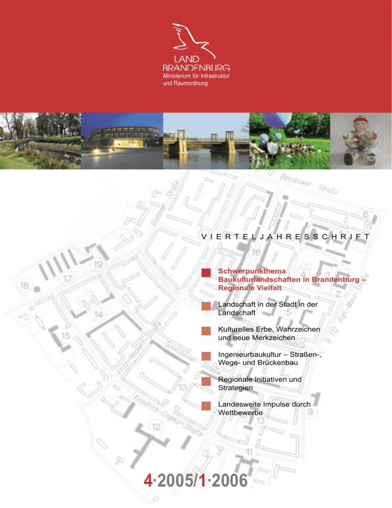 Ministerium für Infrastruktur und Raumordnung V I E R T E L J A H R E S S C H R I F T Schwerpunkthema Baukulturlandschaften in Brandenburg – Regionale Vielfalt Landschaft in der Stadt in der Landschaft Kulturelles Erbe, Wahrzeichen und neue Merkzeichen Ingenieurbaukultur – Straßen-, Wege- und Brückenbau Regionale Initiativen und Strategien Landesweite Impulse durch Wettbewerbe 4∙2005/1∙2006 Inhaltsverzeichnis Editorial Baukulturlandschaften in Brandenburg – Regionale Vielfalt Einführung Minister Szymanski Einführung Ministerin Wanka ........................................................................................ 3 ............................................................................................................................................. 5 ................................................................................................................................................. 6 Kulturland Brandenburg 2006 Baukultur ............................................................................................................................... Baukulturlandschaften Brandenburgs als neue Potenziale entdecken . 7 ................................................................................ 8 ......................................................................................... 9 Landschaft in der Stadt in der Landschaft Luckau – die Landschaft in der Stadt in der Landschaft Luckenwalde – Städtebauliche und landschaftsarchitektonische Entwicklung ..................................................... 11 .......................................................................... 13 ...................................................................................... 14 Guben – Vom Industriekanal zur grünen Ader für Gubens Mitte Kulturelles Erbe, Wahrzeichen und neue Merkzeichen Unser Denkmal des Monats – eine Aktion wird Tradition Eisenhüttenstadt – die Wohnkomplexe I-IV – Zukunftsfragen ............................................................................... 17 Guben – Neues Stadtzentrum hinter historischer Hülle Zur Revitalisierung einer Industriebrache ............................................................................................................ 21 Hennigsdorf – Gestaltung,Funktionalität und Identität – Baukultur im Herzen der Stadt ....................................... 23 .................................... 26 ............................................................................ 28 Prenzlau – Die Uckerseehalle – eine Dreifachturnhalle mit integrierter Mehrfachnutzung Luckenwalde – Bibliothek im Bahnhof (Architekturwettbewerb) Frankfurt (Oder) – Das Kleistforum – Kultur und Kongresszentrum Cottbus – Umbau des Dieselkraftwerks zum Kunstmuseum ..................................................................... 30 ................................................................................ 31 Perleberg – Wallgebäude – Kulturzentrum und Stadtinformation ........................................................................ Wusterhausen/Dosse – Neue Aussichten für eine bedrohte Art – Zur Sanierung eines Ackerbürgerhauses 34 ....... 35 ................................................................................................................... 38 Ingenieurbaukultur – Straßen-, Wege- und Brückenbau Baukultur, die man mit den Füßen tritt Baukultur bei der Gestaltung von Ortsdurchfahrten .............................................................................................. Die ehemalige Autobahntankstelle Fürstenwalde West – ein Denkmal an der Bundesautobahn A 12 .................. 46 ................................................................................. 47 ................................................................................................................ 49 Die Bahnhofsgebäude an der Berlin-Hamburger Eisenbahn Die Nedlitzer Nordbrücke Neu-Fahrland 42 Der Fürst-Pückler-Radweg der IBA Lausitz ........................................................................................................... Ein neues Schiffshebewerk für Niederfinow – Geschichte des Verkehrsbaus im Barnim wird fortgeschrieben ............................................................................. Der preußische Baukondukteur Johann August Röbling (1806-1869) 52 54 ................................................................... 55 .................................................................... 56 Regionale Initiativen und Strategien Landesentwicklung mit ornamented farms: Zum historisch-kulturellen Erbe des Naturparks Märkische Schweiz 2 MIRAKTUELL 4∙2005/1∙2006 Senftenberg – Plattform SEEstadt ......................................................................................................................... Landkunst – Kunstland. Der Kunstwanderweg zwischen Wiesenburg und Belzig ............................................... Brücken bauen, Wurzeln schlagen, Netze knüpfen – Baruth und seine Initiative zur Kulturraumentwicklung 59 60 ....... 62 Die REGIONALEN in Nordrhein-Westfalen – ein Strukturprogramm für regionale Kooperationen, integrierte Regionalentwicklung und Impulse für den Kultur- und Wirtschaftsraum ............................................... 64 Landesweite Impulse durch Wettbewerbe Die Preisträger des Schülerwettbewerbs Ansichtssache Stadt Erster Preis für Willy Cottbus ............................................................................. 66 ................................................................................................................................. 67 Der Brandenburgische Ingenieurpreis ................................................................................................................... 68 Der Brandenburgische Architekturpreis ................................................................................................................. 