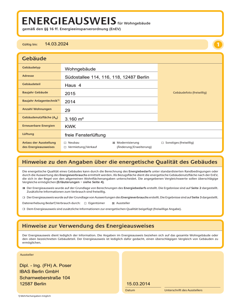 ENERGIEAUSWEIS für Wohngebäude gemäß den §§ 16 ff. Energieeinsparverordnung (EnEV) Gültig bis: 14.03.2024 1 Gebäude Gebäudetyp Wohngebäude Adresse Südostallee 114, 116, 118, 12487 Berlin Gebäudeteil Haus 4 Baujahr Gebäude 2015 Baujahr Anlagentechnik1) 2014 Anzahl Wohnungen 29 Gebäudenutzfläche (AN) 3.160 m² Erneuerbare Energien KWK Lüftung freie Fensterlüftung Anlass der Ausstellung des Energieausweises Gebäudefoto (freiwillig) Neubau Vermietung/Verkauf Modernisierung (Änderung/Erweiterung) Sonstiges (freiwillig) Hinweise zu den Angaben über die energetische Qualität des Gebäudes Die energetische Qualität eines Gebäudes kann durch die Berechnung des Energiebedarfs unter standardisierten Randbedingungen oder durch die Auswertung des Energieverbrauchs ermittelt werden. Als Bezugsfläche dient die energetische Gebäudenutzfläche nach der EnEV, die sich in der Regel von den allgemeinen Wohnflächenangaben unterscheidet. Die angegebenen Vergleichswerte sollen überschlägige Vergleiche ermöglichen (Erläuterungen – siehe Seite 4). Der Energieausweis wurde auf der Grundlage von Berechnungen des Energiebedarfs erstellt. Die Ergebnisse sind auf Seite 2 dargestellt. Zusätzliche Informationen zum Verbrauch sind freiwillig. Der Energieausweis wurde auf der Grundlage von Auswertungen des Energieverbrauchs erstellt. Die Ergebnisse sind auf Seite 3 dargestellt. Datenerhebung Bedarf/Verbrauch durch: Eigentümer Aussteller Dem Energieausweis sind zusätzliche Informationen zur energetischen Qualität beigefügt (freiwillige Angabe). Hinweise zur Verwendung des Energieausweises Der Energieausweis dient lediglich der Information. Die Angaben im Energieausweis beziehen sich auf das gesamte Wohngebäude oder den oben bezeichneten Gebäudeteil. Der Energieausweis ist lediglich dafür gedacht, einen überschlägigen Vergleich von Gebäuden zu ermöglichen. Aussteller Dipl. - Ing. (FH) A. Poser IBAS Berlin GmbH Scharnweberstraße 104 12587 Berlin 15.03.2014 Datum 1) Mehrfachangaben möglich Unterschrift des Ausstellers ENERGIEAUSWEIS für Wohngebäude gemäß den §§ 16 ff. Energieeinsparverordnung (EnEV) Südostallee 114, 116, 118, 12487 Berlin Haus 4 Berechneter Energiebedarf des Gebäudes 2 Energiebedarf CO2-Emissionen1) [kg/(m²·a)] Endenergiebedarf 64 0 50 kWh/(m²·a) 100 41 150 200 250 300 350 ≥ 400 kWh/(m²·a) Primärenergiebedarf "Gesamtenergieeffizienz" Anforderungen gemäß EnEV 2) Für Energiebedarfsberechnungen verwendetes Verfahren Primärenergiebedarf Ist-Wert 41 kWh/(m2 ·a) Anforderungswert 88 kWh/(m2 ·a) Verfahren nach DIN V 4108-6 und DIN V 4701-10 Verfahren nach DIN V 18599 Energetische Qualität der Gebäudehülle H’T Ist-Wert 0,44 W/(m2 ·K) Anforderungswert Sommerlicher Wärmeschutz (bei Neubau) 0,70 W/(m2 ·K) Vereinfachungen nach § 9 Abs. 2 EnEV eingehalten Endenergiebedarf Energieträger Jährlicher Endenergiebedarf in kWh/(m2 ·a) für Heizung Warmwasser Hilfsgeräte 4) Erdgas H 39,7 22,2 Gesamt in kWh/(m2 ·a) 2,2 64,1 Vergleichswerte Endenergiebedarf Ersatzmaßnahmen 3) Anforderungen nach § 7 Nr. 2 EEWärmeG kWh/(m2 ·a) Transmissionswärmeverlust H’T Verschärfter Anforderungswert: W/(m2 ·K) au s 100 150 200 250 300 350 ≥ 400 Ne ub au H Ne ub EF au H gu en e t m rg od eti er sch ni sie rt Du W rch oh sc ng hn eb itt M äu FH de we e se ne nt rg lic eti h m sc EF od h ni H er ch we e ni t se ne sie nt rg rt lic eti h m sc h od ni er ch ni t sie rt Verschärfter Anforderungswert: M Primärenergiebedarf FH % verschärft. 50 vh Die Anforderungswerte der EnEV sind um Pa ssi Anforderungen nach § 7 Nr. 2 i. V. m. § 8 EEWärmeG 0 EF Die um 15 % verschärften Anforderungswerte sind eingehalten. 5) Erläuterungen zum Berechnungsverfahren Die Energieeinsparverordnung lässt für die Berechnung des Energiebedarfs zwei alternative Berechnungsverfahren zu, die im Einzelfall zu unterschiedlichen Ergebnissen führen können. Insbesondere wegen standardisierter Randbedingungen erlauben die angegebenen Werte keine Rückschlüsse auf den tatsächlichen Energieverbrauch. Die ausgewiesenen Bedarfswerte sind spezifische Werte nach der EnEV pro Quadratmeter Gebäudenutzfläche (AN). 1) Freiwillige Angabe 2) bei Neubau sowie bei Modernisierung im Fall des § 16 Abs. 1 Satz 2 EnEV 3) nur bei Neubau im Falle der Anwendung von § 7 Nr. 2 Erneuerbare-Energien-Wärmegesetz 4) Ggf. einschließlich Kühlung 5) EFH: Einfamilienhäuser, MFH: Mehrfamilienhäuser ENERGIEAUSWEIS für Wohngebäude gemäß den §§ 16 ff. Energieeinsparverordnung (EnEV) Erfasster Energieverbrauch des Gebäudes 3 Energieverbrauchskennwert 0 50 Energieverbrauch für Warmwasser: 100 150 enthalten 200 250 300 350 ≥ 400 nicht enthalten Das Gebäude wird auch gekühlt; der typische Energieverbrauch für Kühlung beträgt bei zeitgemäßen Geräten etwa 6 kWh je m2 Gebäudenutzfläche und Jahr und ist im Energieverbrauchskennwert nicht enthalten. Verbrauchserfassung – Heizung und Warmwasser Energieträger Zeitraum von Energieverbrauch [kWh] bis Anteil Warmwasser [kWh] Klimafaktor Energieverbrauchskennwert in kWh/(m2 ·a) (zeitlich bereinigt, klimabereinigt) Heizung Warmwasser Kennwert Durchschnitt Vergleichswerte Endenergiebedarf 150 200 250 300 350 ≥ 400 Soll ein Energieverbrauchskennwert verglichen werden, der keinen Warmwasseranteil enthält, ist zu beachten, dass auf die Warmwasserbereitung je nach Gebäudegröße 20 – 40 kWh/(m2 ·a) entfallen können. EF FH M Pa ssi v 100 Ne ub au H Ne ub EF au H gu en t m erg od eti er sch ni sie rt Du W rch oh sc ng hn eb itt M äu F de we H e n se nt erg lic eti h m sc EF od h ni H er ch we e ni t se ne sie r nt rt lic geti h m sc h od ni er ch ni t sie rt 50 ha us 0 Die modellhaft ermittelten Vergleichswerte beziehen sich auf Gebäude, in denen die Wärme für Heizung und Warmwasser durch Heizkessel im Gebäude bereitgestellt wird. 1) Soll ein Energieverbrauchskennwert eines mit Fern- oder Nahwärme beheizten Gebäudes verglichen werden, ist zu