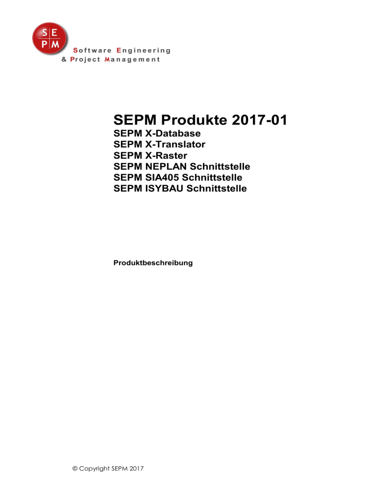SEPM Produkte 2017-01 SEPM X-Database SEPM X-Translator SEPM X-Raster SEPM NEPLAN Schnittstelle SEPM SIA405 Schnittstelle SEPM ISYBAU Schnittstelle Produktbeschreibung © Copyright SEPM 2017 SEPM Produktbeschreibung Dokument Information Art Beschreibung Abstrakt Dieses Dokument beschreibt die SEPM Produkte Translator, X-Raster und die SEPM Schnittstellen. Version 2017-01 X-Database, X- Haftungsausschluss Alle in diesem Dokument verwendeten Logos und Warenzeichen gehören ihren entsprechenden Besitzern. Kontakt Software Engineering and Project Management Gerliswilstrasse 42 CH-6020 Emmenbrücke Switzerland Tel +41 79 632 28 20 Fax +41 41 260 57 20 www.sepm.ch [email protected] © Copyright SEPM 2017 2 SEPM Produktbeschreibung Inhaltsverzeichnis 1 Einführung 1.1 2 6 Glossar ............................................................................................................ 8 X-Database 9 2.1 Übersicht ......................................................................................................... 9 2.2 X-Database "Sia 405" .................................................................................... 10 2.2.1 Datenmodelle ....................................................................................... 10 2.2.2 Beispiel................................................................................................. 10 2.3 X-Database "Swisstopo" ................................................................................ 11 2.3.1 Übersicht .............................................................................................. 11 2.3.2 Datenmodelle ....................................................................................... 11 3 X-Translator 15 3.1 Einführung ..................................................................................................... 15 3.1.1 Übersicht .............................................................................................. 15 3.1.2 Unterstützte Formate ............................................................................ 15 3.2 Bedienung ..................................................................................................... 16 3.2.1 Import ................................................................................................... 16 3.2.2 Export ................................................................................................... 19 3.3 Funktionsumfang ........................................................................................... 21 3.3.1 Quelle, Ziel, Abbildung und Optionen ................................................... 21 3.3.2 Smallworld-Export ................................................................................ 22 3.3.3 Unterstützung von Zeichenmethoden und Bemassungen .................... 23 3.3.4 Definition von Export-Prädikaten .......................................................... 24 3.3.5 Umwandlung von Koordinaten .............................................................. 24 3.3.6 Welten .................................................................................................. 25 3.3.7 "Simple GUI" ........................................................................................ 25 3.3.8 Optionen............................................................................................... 26 3.4 Formate ......................................................................................................... 27 3.4.1 TFM/TFD Import und Export ................................................................. 27 3.4.2 DWG/DXF Export ................................................................................. 27 3.4.3 DWG/DXF Import ................................................................................. 28 3.4.4 DXF Export ........................................................................................... 28 © Copyright SEPM 2017 3 SEPM Produktbeschreibung 3.4.5 MapInfo MIF ......................................................................................... 28 3.4.6 ESRI Shape.......................................................................................... 28 3.4.7 INTERLIS 1 .......................................................................................... 29 3.4.8 INTERLIS 2.3 ....................................................................................... 29 3.4.9 KML Export ........................................................................................... 30 3.4.10 Text.................................................................................................. 32 3.4.11 Spatial Target .................................................................................. 34 3.4.12 PostGIS ........................................................................................... 35 3.4.13 SVG ................................................................................................. 36 3.5 Installation ..................................................................................................... 37 3.5.1 Software Modules ................................................................................. 37 3.5.2 X-Translator Datenbank ....................................................................... 38 3.6 Das X-Translator XML Format ....................................................................... 39 3.6.1 Datenmodell ......................................................................................... 39 3.6.2 Beispiel ................................................................................................. 39 3.7 Konfiguration ................................................................................................. 41 3.7.1 Benutzeranwendungen ......................................................................... 41 3.7.2 Weitere Möglichkeiten .......................................................................... 41 3.7.3 Create Database ............................