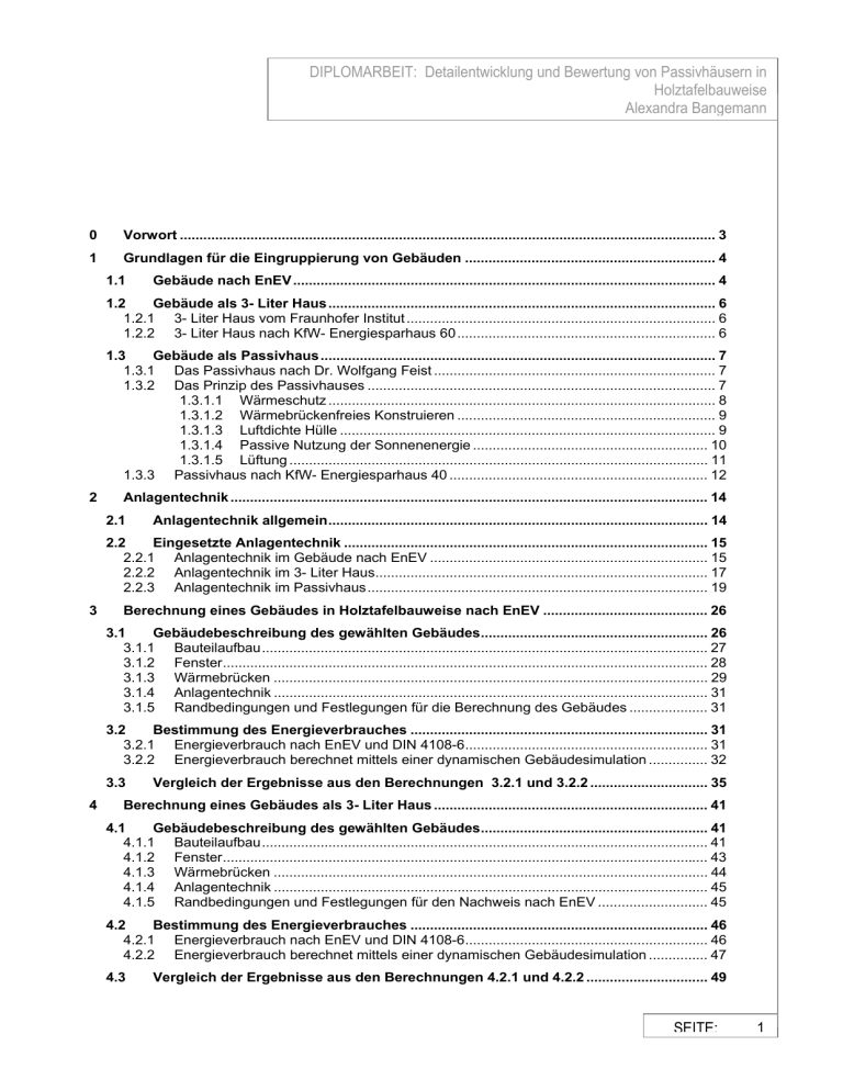 DIPLOMARBEIT: Detailentwicklung und Bewertung von Passivhäusern in Holztafelbauweise Alexandra Bangemann 0 Vorwort ......................................................................................................................................... 3 1 Grundlagen für die Eingruppierung von Gebäuden ................................................................ 4 1.1 Gebäude nach EnEV ............................................................................................................ 4 1.2 Gebäude als 3- Liter Haus ................................................................................................... 6 1.2.1 3- Liter Haus vom Fraunhofer Institut ............................................................................... 6 1.2.2 3- Liter Haus nach KfW- Energiesparhaus 60.................................................................. 6 1.3 Gebäude als Passivhaus ..................................................................................................... 7 1.3.1 Das Passivhaus nach Dr. Wolfgang Feist ........................................................................ 7 1.3.2 Das Prinzip des Passivhauses ......................................................................................... 7 1.3.1.1 Wärmeschutz ................................................................................................... 8 1.3.1.2 Wärmebrückenfreies Konstruieren .................................................................. 9 1.3.1.3 Luftdichte Hülle ................................................................................................ 9 1.3.1.4 Passive Nutzung der Sonnenenergie ............................................................ 10 1.3.1.5 Lüftung ........................................................................................................... 11 1.3.3 Passivhaus nach KfW- Energiesparhaus 40 .................................................................. 12 2 Anlagentechnik .......................................................................................................................... 14 2.1 Anlagentechnik allgemein................................................................................................. 14 2.2 Eingesetzte Anlagentechnik ............................................................................................. 15 2.2.1 Anlagentechnik im Gebäude nach EnEV ....................................................................... 15 2.2.2 Anlagentechnik im 3- Liter Haus..................................................................................... 17 2.2.3 Anlagentechnik im Passivhaus....................................................................................... 19 3 Berechnung eines Gebäudes in Holztafelbauweise nach EnEV .......................................... 26 3.1 Gebäudebeschreibung des gewählten Gebäudes.......................................................... 26 3.1.1 Bauteilaufbau.................................................................................................................. 27 3.1.2 Fenster............................................................................................................................ 28 3.1.3 Wärmebrücken ............................................................................................................... 29 3.1.4 Anlagentechnik ............................................................................................................... 31 3.1.5 Randbedingungen und Festlegungen für die Berechnung des Gebäudes .................... 31 3.2 Bestimmung des Energieverbrauches ............................................................................ 31 3.2.1 Energieverbrauch nach EnEV und DIN 4108-6.............................................................. 31 3.2.2 Energieverbrauch berechnet mittels einer dynamischen Gebäudesimulation ............... 32 3.3 4 Vergleich der Ergebnisse aus den Berechnungen 3.2.1 und 3.2.2 .............................. 35 Berechnung eines Gebäudes als 3- Liter Haus ...................................................................... 41 4.1 Gebäudebeschreibung des gewählten Gebäudes.......................................................... 41 4.1.1 Bauteilaufbau.................................................................................................................. 41 4.1.2 Fenster............................................................................................................................ 43 4.1.3 Wärmebrücken ............................................................................................................... 44 4.1.4 Anlagentechnik ............................................................................................................... 45 4.1.5 Randbedingungen und Festlegungen für den Nachweis nach EnEV ............................ 45 4.2 Bestimmung des Energieverbrauches ............................................................................ 46 4.2.1 Energieverbrauch nach EnEV und DIN 4108-6.............................................................. 46 4.2.2 Energieverbrauch berechnet mittels einer dynamischen Gebäudesimulation ............... 47 4.3 Vergleich der Ergebnisse aus den Berechnungen 4.2.1 und 4.2.2 ............................... 49 SEITE: 1 DIPLOMARBEIT: Detailentwicklung und Bewertung von Passivhäusern in Holztafelbauweise Alexandra Bangemann 5 Berechnung eines Gebäudes als Passivhaus ........................................................................ 54 5.1 Gebäudebeschreibung des gewählten Gebäudes.......................................................... 54 5.1.1 Bauteilaufbau.................................................................................................................. 54 5.1.2 Fenster............................................................................................................................ 57 5.1.3 Wärmebrücken ............