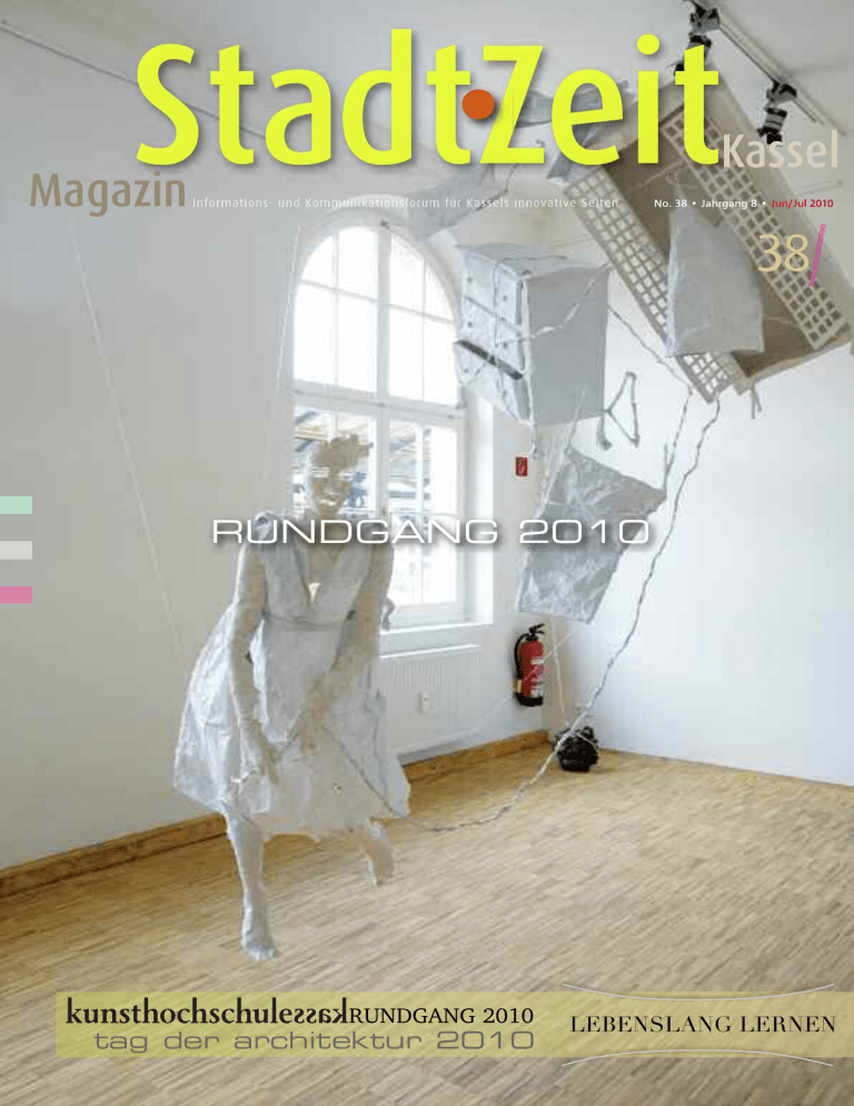 Kassel Magazin No. 38 • Jahrgang 8 • Jun/Jul 2010 RUNDGANG 2010 RUNDGANG 2010 tag der architektur 2010 LEBENSLANG LERNEN OBJEKTE 1 2 3 4 5 6 7 8 9 10 11 12 13 14 15 16 17 18 19 20 21 22 23 24 25 26 27 28 32 TERMINE Samstag, 26. Juni und Sonntag, 27. Juni 2010 KASSEL 21 Modehaus Köhler, Sanierung der Fassade Obere Königsstraße 37, 34117 Kassel Führung: SO 16 Uhr 8 Neubau Cafeteria a. Friedrichsgymnasium Humboldtstraße 5, 34117 Kassel Öffnungszeiten: SO 12 – 14 Uhr 5 Erweiterung Elisabeth-Krankenhaus Kassel Weinbergstraße 7, 34117 Kassel Führung: SA 15 Uhr 11 Modernisierung Bundessozialgericht Kassel Graf-Bernadotte-Platz 5, 34119 Kassel Öffnungszeiten: SA 10 – 15 Uhr Führungen: während der Öffnungszeiten zu jeder vollen Stunde 3 Erweiterung der Kindertagesstätte am "Kleinen Holzweg" Kleiner Holzweg 28, 34121 Kassel Öffnungszeiten: SA 10.30 – 12 Uhr 14 Neubau Erziehungs- & Sprachwissenschaften der UNI Kassel Kurt-Wolters-Straße 5, 34125 Kassel Führung: SA + SO 15 Uhr, Treffpunkt Foyer Haupthaus 28 Zeughaus Ruine, Cafeteria Weserstraße 7a, 34125 Kassel Öffnungszeiten: SA + SO 11 – 14 Uhr 27 Umnutzung Karlshospital Kassel Weserstraße 2a, 34125 Kassel Öffnungszeiten: SA + SO 12 – 14 Uhr Führung: SA + SO 12.00 4 Erweiterung einer Schule Grenzweg 10, 34125 Kassel Öffnungszeiten: SA 10 – 14 Uhr Führung während der Öffnungszeiten 9 K+S Kindergarten GlücksKinder Amalie-Wündisch-Straße 35, 34131 Kassel Öffnungszeiten: SA 10 – 14 Uhr Führung: während der Öffnungszeiten 24 Sporthalle Bad Wilhelmshöhe Büchnerstraße 1, 34131 Kassel Öffnungszeiten: SA 11 – 12.30 und 13.30 – 15 Uhr Führung: während der Öffnungszeiten 1 An- und Umbau an denkmalgeschütztem Einfamilienhaus Im Rosental 20, 34132 Kassel – Bad Wilhelmshöhe Öffnungszeiten: SA + SO 11 – 16 Uhr 6 Erweiterung J.-Amos-Comenius-Schule Leimbornstraße 14, 34134 Kassel Öffnungszeiten: SA 11 – 13 Uhr 10 Lehrsaalgebäude Neubau für die Verwaltungsfachhochschule Wiesbaden Frankfurter Str. 365, 34134 Kassel (Liegenschaft der IV. Bereitschaftspolizeiabteilung) Führung: SA + SO 14 Uhr (Treffp. Eingang Wache) Hinweis: Personalausweis bereithalten. Besichtung nur während der Führung möglich. LANDKREIS KASSEL 23 Schulerweiterung Mensa Akazienallee 23, 34225 Baunatal Führung: SA 14 Uhr 12 Werkstatt für behinderte Menschen Modernisierung und Umbau Kirchbaunaer Straße 19, 34225 Baunatal Öffnungszeiten: SA 10 – 14 Uhr Führung: während der Öffnungszeiten 2 Autobahnkapelle Alexander-von-Humboldstraße 1, 34253 Lohfelden Führung: SO 12 Uhr 22 Schul- und Gemeindebibliothek Lohfelden Lange Straße 51b, 34253 Lohfelden Öffnungszeiten: SA + SO 11 – 15 Uhr Führung: SO 11 Uhr 7 Erweiterungsbau einer bestehenden Altenpflegeeinrichtung Quellenweg 60, 34253 Lohfelden Führung: SA + SO 15 Uhr 13 Neubau Bibliothek Kampweg 24, 34376 Immenhausen Öffnungszeiten: SO 14 – 15.30 Uhr, Führungen: bei Bedarf 17 Neubau der Kindertagesstätte an der Stadtmauer der Stadt Grebenstein Sauertalsweg 2, 34393 Grebenstein Führung: SA 11 Uhr, SO 14 Uhr 15 Neubau Mensa Hofgeismarer Straße 9, 34393 Grebenstein Öffnungszeiten: SO 12 – 13.30 Uhr Führung: SO bei Bedarf 25 Umbau einer Panzerhalle zur Schule Pommernkaserne 22, 34466 Wolfhagen Führung: SA 16 Uhr LANDKREIS WALDECKFRANKENBERG 26 Umbau und Sanierung Sporthalle Breiter Hagen Breiter Hagen 3, 34537 Bad Wildungen Öffnungszeiten: SA + SO 11 – 16 Uhr Führung: SA + SO 12 Uhr 19 Neubau einer Sport- und Mehrzweckhalle Auf dem Knöchel, 35104 LichtenfelsSachsenberg Öffnungszeiten: SO 10 – 18 Uhr WERRA-MEISSNER-KREIS 16 Neubau Stadtbahnhof Eschwege Niederhoner Straße 1, 37269 Eschwege Führung: SA + SO 12, 14, 15.30 Uhr SCHWALM-EDER-KREIS 20 Neubau eines Einfamilienhauses Oberer Kolberg 20, 34212 Melsungen Führung SA + SO 15 Uhr 18 Neubau einer Kinderkrippe mit 3 Gruppen in Wabern Ziegenhainer Straße 18, 34590 Wabern Öffnungszeiten: SA + SO 10 – 16 Uhr Führung: SA 14 + 15 Uhr, SO 11 + 12 Uhr RAHMENPROGRAMM „Abschlussfete“ mit Musik im KAZimKUBA Veranstalter: Kasseler Architekturzentrum Veranstaltungsort: KAZimKUBA, Kulturbahnhof Kassel, gegenüber Gleis 8 Termin: SA 26.06., 17 – 23 Uhr Kontakt: Dipl.-Ing. Ursula Winter [email protected] Tel. 0561 / 76690455 Architektour „Stadtteilspaziergang Kassel-Marbachshöhe - Von der Kaserne zur Stadt" Veranstalter: Dipl.-Ing. Klaus Schaake Veranstaltungsort: Treffpunkt wird nach Anmeldung bekannt gegeben, Kassel-Marbachshöhe Termin: SO 27.06., 11 Uhr Anmeldung über StadtZeit Kassel bis Freitag, 25.06., 14 Uhr, Kosten: € 5 je Teilnehmer Kontakt: Tel. 0561 / 475 10 11 [email protected] Info: www.marbachshoehe.net tag der architektur 2010 Gehen Sie auf Entdeckungstour! Zeitgenössische Architektur in unmittelbarer Umgebung A m letzten Juni-Wochenende findet wie jedes Jahr der „Tag der Architektur“ – und damit die publikums- und medienwirksamste Architekturveranstaltung in Deutschland – statt. Jeder ist an diesem Wochenende eingeladen, zeitgenössische Architektur in der unmittelbaren Umgebung zu besichtigen. Bereits zum 16. Mal lockt der hessische "Tag der Architektur" Tausende interessierte Besucher an. Wohnhäuser und Büros, Industriebauten und Schulen, Gärten und Parks – die unterschiedlichsten Projekte können besichtigt werden. Am Samstag und Sonntag (26. und 27. Juni) werden allein in Hessen 164 Bauten, die in der Regel sonst nicht öffentlich zugänglich sind, offen stehen. Und auch Nordhessen und die Region Kassel sind wieder gut vertreten. Vor Ort erläutern Architekten und Bauherren ihre Projekte und beantworten gerne alle Fragen. Die Bauten wurden durch ein unabhängiges Gremium ausgewählt, so dass mit der Auswahl Maßstäbe gesetzt werden: Für gute Alltagsarchitektur, die wir tagtäglich sehen, nutzen, bewohnen – und die unser Leben und unsere Umwelt weit mehr bestimmen als das eine außergewöhnliche Bauwerk. So werden auch in diesem Jahr wieder viele spannende
