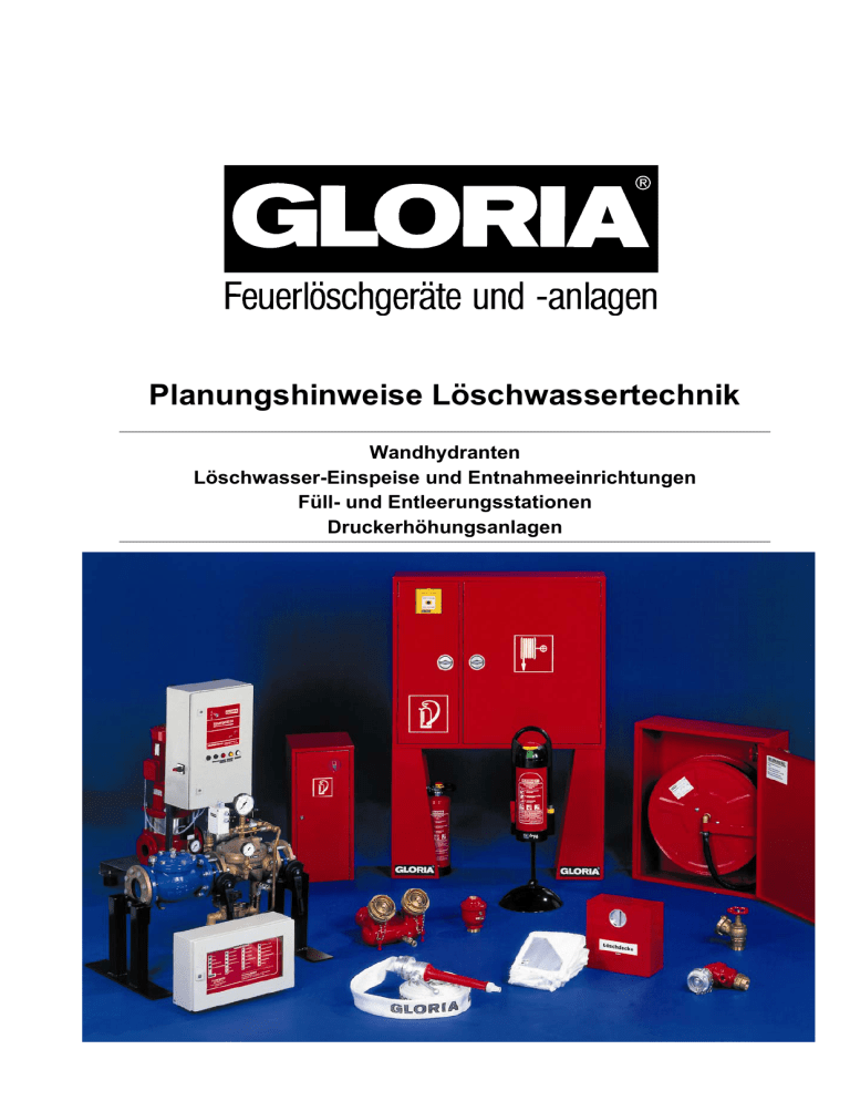 Planungshinweise Löschwassertechnik Wandhydranten Löschwasser-Einspeise und Entnahmeeinrichtungen Füll- und Entleerungsstationen Druckerhöhungsanlagen Die Broschüre wurde überreicht durch: Planungshinweise Löschwassertechnik Planungshinweise Löschwassertechnik Artikel-Nr.: 924 366.0000 – 01 Ausgabe: März 2008 Herausgeber: GLORIA GmbH Diestedder Straße 39 59329 Wadersloh Tel. +49 2523 / 77-0 www.gloria.de Nachdruck und sonstige Vervielfältigung, auch auszugsweise, nur mit ausdrücklicher Genehmigung der GLORIA GmbH gestattet. Die Urheberrechte und die strafrechtliche Verfolgung von Zuwiderhandlungen‚ behalten wir uns vor. 924 366-01 Technische Änderungen vorbehalten Seite 3 Planungshinweise Löschwassertechnik Hinweise für den Benutzer Diese Broschüre ist alle Personen gerichtet, der sich mit der Planung und Auslegung von Löschwasseranlagen beschäftigen. Angesichts der vielfältigen örtlichen Gegebenheiten und der anwendbaren Normen ist es besonders wichtig, für den Bedarfsfall bereits in der Projektierungsphase das richtige Konzept auszuwählen. Dieses Dokument soll Sie bei der Konzipierung solcher Anlagen unterstützen. Schwerpunkte bilden die aktuellen Normen und deren Umsetzung. Als weitere Grundlage der behandelten Themen sind umfangreiche Erfahrungen während der Entwicklung und dem Betrieb von Löschwasseranlagen herangezogen worden. Diese Planungshinweise können jedoch nicht als alleiniger Leitfaden sein und die Kenntnisse der gelten Vorschriften und Normen ersetzen. Für den Umgang mit dieser Broschüre werden vielmehr grundlegende Kenntnisse im Bereich Sanitärinstallation und baulicher Brandschutz vorausgesetzt. Als Komplettanbieter im Bereich Löschwassertechnik wird GLORIA einem hohen Anspruch gerecht und entwickelt die eigene Produktpalette entsprechend den Bedürfnissen der Kundschaft ständig weiter und ist auch im Bereich der nationalen Normung wie auch im europäischen Normungswesen tätig. Somit ist diese Broschüre ein Produkt der aktuellen Informationen auf der Planungsseite und aktiver Mitgestaltung im Normungswesen sowie jahrelanger Kompetenz auf der Herstellerseite. Seite 4 Technische Änderungen vorbehalten 924 366-01 Planungshinweise Löschwassertechnik Inhaltsverzeichnis Hinweise für den Benutzer ................................................................................................................... 4 Inhaltsverzeichnis ................................................................................................................................. 5 1 Planung einer Löschwasseranlage .............................................................................................. 7 1.1 1.2 1.3 1.4 Rechtliche Grundlagen............................................................................................................................. 7 Fachplaner ............................................................................................................................................... 7 Fachfirma für die Anlagenerrichtung ........................................................................................................ 7 Planungsablauf ........................................................................................................................................ 8 1.4.1 1.4.2 1.4.3 1.4.4 1.4.5 1.4.6 1.4.7 1.4.8 1.4.9 1.4.10 1.4.11 1.4.12 2 Löschwasseranlagen „trocken“.................................................................................................. 22 2.1 2.2 2.3 2.4 2.5 2.6 2.7 2.8 3 Schematische Darstellung ..................................................................................................................... 27 Definition und Einsatzbereich................................................................................................................. 28 Allgemeine Anforderungen..................................................................................................................... 28 besondere Anforderungen an Rohrleitungssystem und Armaturen ....................................................... 29 Druckerhöhungsanlagen in Trinkwasser-Installationen.......................................................................... 29 Wandhydranten mit formstabilem Schlauch, Typ S nach DIN 14461-1.................................................. 30 Be- und Entlüfter in Trinkwasser-Installationen mit Wandhydranten ...................................................... 31 Löschwasseranlagen „nass“ ...................................................................................................... 32 4.1 4.2 4.3 4.4 4.5 4.6 4.7 4.8 5 Schematische Darstellung ..................................................................................................................... 22 Definition und Einsatzbereich................................................................................................................. 23 Allgemeine Anforderungen..................................................................................................................... 23 besondere Anforderungen an Rohrleitungssystem und Armaturen ....................................................... 23 Löschwasser-Einspeiseeinrichtungen .................................................................................................... 24 Löschwasser-Entnahmeeinrichtungen ................................................................................................... 25 Be- und Entlüfter für Löschwasseranlagen „trocken“ ............................................................................. 26 Druckerhöhungsanlagen in Löschwasseranlagen „trocken“................................................................... 26 Trinkwasserinstallation mit Wandhydranten............................................................................. 27 3.1 3.2 3.3 3.4 3.5 3.6 3.7 4 Schematische Darstellung ....................................................................