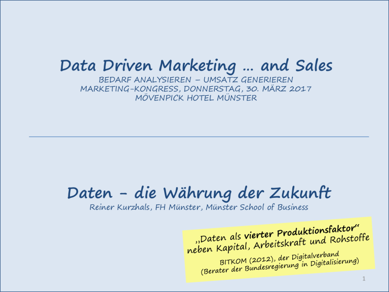 Data Driven Marketing … and Sales BEDARF ANALYSIEREN – UMSATZ GENERIEREN MARKETING-KONGRESS, DONNERSTAG, 30. MÄRZ 2017 MÖVENPICK HOTEL MÜNSTER Daten - die Währung der Zukunft Reiner Kurzhals, FH Münster, Münster School of Business 1 Zusammenfassung Was Sie heute von mir zu hören bekommen Bedeutung Digitalisierung, Big Data, Data Science Reiner Kurzhals, FH Münster, Münster School of Business 2 Reiner Kurzhals, FH Münster, Münster School of Business 3 Reiner Kurzhals, FH Münster, Münster School of Business 4 Ein Arbeits-Leben mit Daten Hoechst AG Statistik Studium Big Data Start-Up Gründer Daten 18 Jahre Strategie Beratung Reiner Kurzhals, FH Münster, Münster School of Business Roland Berger Strategieberatung 8 Jahre Industrie (F&E) Westfälische Hochschule FH Münster Münster School of Business 18 Jahre Statistik Professor 4tree GmbH Sonstige signifikante Tätigkeiten - Chef-Fußballtrainer Waldorfschule MS - Co-Trainer des Co-Trainers U12 Westf. Kinderhaus 5 Reiner Kurzhals, FH Münster, Münster School of Business 6 Gestern und Heute: Meist interne Daten nutzen um Marketing/Vertrieb Entscheidungen zu verbessern, als Reaktion auf Vergangenem Ziel war und ist es • mit CRM/ERP/BI Lösungen das operative Ergebnis zu verbessern • Betriebsabläufe über deskriptives Berichtwesen zu optimieren • mehr Reaktion (auf Vergangenes) als Aktion (für Zukünftiges) Entscheidungen verbessern Reiner Kurzhals, FH Münster, Münster School of Business Marketing Vertrieb 7 Neu ist Heute: der Datenstrom (Digitalisierung) explodiert und ein neues Wertschöpfungspotenzial wird verfügbar Die Zeiten haben sich geändert, jetzt gibt es • • • viel mehr Daten zur Verfügung (strukturiert/unstrukturiert, intern/extern) dramatisch bessere Datenverarbeitungsmöglichkeiten (z. B. Hadoop) neue Konkurrenz durch Globalisierung/Digitalisierung/Disruption damit haben sich auch die Ziele verändert intern + Entscheidungen verbessern extern + Vorhersage 1to1 Targeting Reiner Kurzhals, FH Münster, Münster School of Business Marketing Vertrieb + • • • • Customer Journey Kundenbindung Trends Echtzeit Analyse 8 Wesentlich ist das Sammeln von Kundendaten, um Entscheidungsträger mit einem aktuellen Bild des Kundenverhaltens zu versorgen Nutzen des Data-Driven Marketings • Schnelligkeit - Änderungen im Kaufverhalten schnell erkennen. • Nachhaltigkeit - Langfristige Kundenbeziehung • Konkurrenzfähigkeit – Wettbewerbsfähig bleiben • Vorausschauen - Bedürfnisse und Erwartungen der Kunden antizipieren • Effektivität - Kampagnen im Hinblick auf ROI-Wert wesentlich verbessern Reiner Kurzhals, FH Münster, Münster School of Business Zentrale Elemente 9 Neues Wertschöpfungspotential durch Digitalisierung, Big Data, Data Science Digitalisierung (Industrie 4.0) Natur funktioniert analog. Digitalisierung komprimiert Informationen • Berühmtestes Beispiel: MP3 Player • oder z. B. Call-Center Anrufe (1=sehr zufrieden, .., 10 = sehr unzufrieden) Umsetzung Big Data Wann sind Daten BIG? Sebastian Thrun, Google Labs Gründer, sagt dazu: • ca. ab 3-5 Terabyte (2016) Big Data Not Only-SQL Map-Reduce In-Memory • Data Science Ein Data Scientist braucht viele Kompetenzen Not so Big Data SQL Data Science Data Warehouse Verarbeitung von großen, komplexen, sich schnell ändernden Datenmengen die mit herkömmlichen Methoden der Datenverarbeitung nicht mehr auszuwerten sind Reiner Kurzhals, FH Münster, Münster School of Business Domain Wissen • • Analysiert was zukünftig passiert Macht aus „Big Data“ mit den entsprechenden Tools „Smart Data“ 10 Mögliche Gefahren im Online Marketing: Beschaffenheit und Beschaffung der Daten Beschaffenheit - je mehr Daten, desto schwieriger ist die Auswertung • • Welche Daten sind nützlich für Vertrieb/Kundenpflege. Erfolgreiches Data-Driven Marketing ist auf Smart Data und Tools angewiesen. Beschaffung – Datenschutz und Privatsphäre Kunden wünschen sich transparenten Dialog, wenn sie Daten zur Verfügung stellen • Sie wollen auch die Möglichkeit, den Datensatz zu verändern • Daten werden von Unternehmen wie Geheimnisse behandelt, führt zu Misstrauen Ein weiteres Problem: Rationalisierung der Informationen • • Kundendaten werden zu Zahlen, sind immer seltener mit den Menschen verknüpft Unternehmen müssen auch den Menschen mit all seinen Facetten dahinter sehen. Reiner Kurzhals, FH Münster, Münster School of Business 11 Populäre Anwendungen (I) Target How Target Figured Out A Teen Girl Was Pregnant Before Her Father Did • • • An angry man went into a Target outside of Minneapolis, demanding to talk to a manager: “My daughter got this in the mail!” he said. “She’s still in high school, and you’re sending her coupons for baby clothes and cribs? Are you trying to encourage her to get pregnant?” The manager apologized and then called a few days later to apologize again. On the phone, though, the father was somewhat abashed. “I had a talk with my daughter,” he said. “It turns out there’s been some activities in my house I haven’t been completely aware of. She’s due in August. I owe you an apology. Reiner Kurzhals, FH Münster, Münster School of Business 12 Populäre Anwendungen (II) Cambridge Analytica SPIEGEL ONLINE vom 6.12.2016:Ich ganz allein habe Trump ins Amt gebracht - Sieg durch Facebook Daten Camebridge Analytica hat eine Methode zur Psychografie per FacebookAktivität eingesetzt • • Persönlichkeit des Menschen durch Likes und Postings bestimmen dieselbe Firma auch für die Brexit-Kampagne gearbeitet Michael Kosinski stellt als Student 2008 an der Cambridge University eine kleine App ins (damals noch überschaubare) Facebook: MyPersonality • • • • 2012 erbringt Kosinski den Nachweis, dass man aus durchschnittlich 68 Facebook-Likes eines Users vorhersagen kann • welche Hautfarbe er hat (95-prozentige Treffsicherheit) • ob er homosexuell ist (88-prozentige Wahrsche