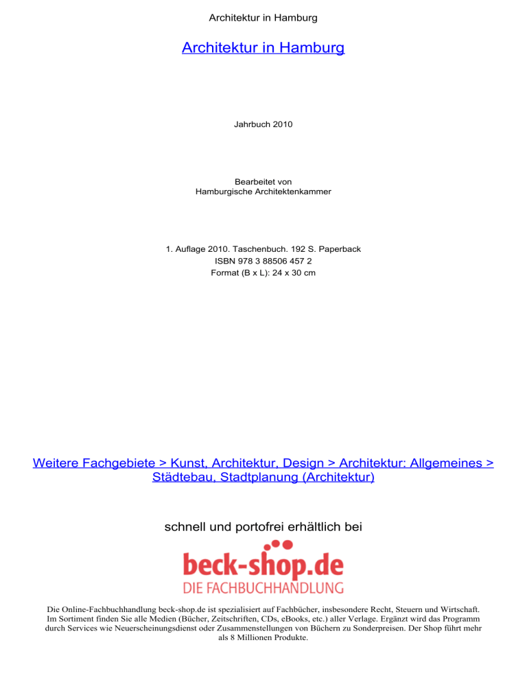 Architektur in Hamburg Architektur in Hamburg Jahrbuch 2010 Bearbeitet von Hamburgische Architektenkammer 1. Auflage 2010. Taschenbuch. 192 S. Paperback ISBN 978 3 88506 457 2 Format (B x L): 24 x 30 cm Weitere Fachgebiete > Kunst, Architektur, Design > Architektur: Allgemeines > Städtebau, Stadtplanung (Architektur) schnell und portofrei erhältlich bei Die Online-Fachbuchhandlung beck-shop.de ist spezialisiert auf Fachbücher, insbesondere Recht, Steuern und Wirtschaft. Im Sortiment finden Sie alle Medien (Bücher, Zeitschriften, CDs, eBooks, etc.) aller Verlage. Ergänzt wird das Programm durch Services wie Neuerscheinungsdienst oder Zusammenstellungen von Büchern zu Sonderpreisen. Der Shop führt mehr als 8 Millionen Produkte. 7 Editorial von Konstantin Kleffel 36 Ich weiß nicht/Was soll es bedeuten… – Das »Westend Ottensen« Hamburger Architektur in Hamburg und in der Welt Gestaltung: Flumdesign, Antonio Citterio and Hamburger Architektur 2007/2008 Partners mit Hinrichs Nicolovius Architekten Text: Gert Kähler 10 Vorne die Reeperbahn, hinten die Buchsbaumterrasse – Das Bavaria-Quartier auf St. Pauli Text: Hanno Rauterberg Architekten: PSP Architekten Ingenieure 44 Stadt mit Bügelfalte – Der Dalmannkai in der HafenCity Architekten: APB Architekten, KBNK Architekten, Léon Wohlhage Wernik, Loosen 17 Krone ohne König – Die Bauten des Bavaria-Quartiers Architecture, Marc-Olivier Mathez, Mevius Mörker Architekten, MRLV Architekten, NPS Chipperfield Architects, Coido Architects, Tchoban Voss, pfp architekten Prof. Fried- Herzog + Partner mit gmp – von Gerkan, Marg rich + Partner, SEHW Architekten, SML und Partner, KSP Engel und Zimmermann Archi­tekten, Spengler Wiescholek, spine Architekten, pfp architekten Prof. Fried- Architects, Winking Architekten mit Martin rich + Partner, Steidle + Partner, Jan Störmer Froh, überNormalNull Partner Text: Claas Gefroi Architekten: KBNK Architekten 74 Auf die Sechziger – Bürohaus Dornbusch 4 Architekten: msm meyer schmitz-morkramer 76 Voller Pioniergeist – Ein Choreographiezentrum auf Kampnagel Architekten: Schöning Spalt Architektur + Gestaltung Text: Gert Kähler 58 Kultivierter Aufstieg eines alten Kaispeichers – Das Internationale Maritime Museum Hamburg Architekten: Jürgen Mayer H. Architekten Architekten: MRLV Architekten Text: Dirk Meyhöfer Text: Ralf Lange 30 Lernschauspiel in Opernatmosphäre – Elbcampus in Harburg 70 Wohnen und Arbeiten am Wasser – Mixed-Block auf der Uhlenhorst Rüschoff Winkler, Carsten Lorenzen, LOVE Architekten: Axthelm Architekten, David 24 Stürme und Irritationen – Das Bürohaus »AdA 1« 66 Reeder‘s Digest – Reederei Ahrenkiel an der Außenalster 80 Raue Schale, edler Kern – Wohnhaus Abendrothsweg Architekten: BN Architekten Borchardt Nentwig 82 Hamburger Alternative – Restaurant am Heuberg Architekten: eins:eins architekten Architekten: pfp architekten Prof. Friedrich + Partner Text: Klaus Dieter Weiss 84 Pause vom Schulalltag – Mehrzweckhalle in Lurup Architekten: Dinse Feest Zurl Architekten 86 Verdienstvolle Arbeit – Die Krypta der Hauptkirche St. Michaelis Architekt: Paul Gerhard Scharf 8 Inhaltsverzeichnis 88 Reihung als Stadtprinzip – Wohnhäuser in Hamburg-Duvenstedt Architekten: Laura Jahnke Architekten 94 Mehr Licht – Gewerbeflächen in Bahrenfeld Architekten: Förster Trabitzsch 120 Innere Werte – Universitätsgebäude in Potsdam-Golm Architekten: Böge Lindner Architekten Architekten: Gössler Kinz Kreienbaum Architekten in Arbeitsgemeinschaft mit Pöyry 130 Weiß als Wille und Vorstellung – Atelierhaus Grindelhof Interview mit Ulli Hellweg, Geschäftsführer der IBA Hamburg GmbH 149 Mit Vollgas in die Stadt der Zukunft – Ein Situationsbericht zu den ersten zwei IBA-Jahren Text: Julian Petrin Architekten: blauraum Infra GmbH 102 Spielerische Geometrie – Bibliotheks­gebäude der Bucerius Law School Hamburger Feuilleton 142 Wilhelmsburger Mischung und globaler Kontext 126 Suprematistisches Spiel mit Scheiben und Kuben – Das Automobilmuseum »Prototyp« Architekten: Dinse Feest Zurl Architekten 98 Ankunft in der Gegenwart – Hauptbahnhof Lübeck 132 Unter falschen Hauben – Supermarkt und Ärztezentrum für Wellingsbüttel Architekt: Nägeli Architekten 154 Kann man küssen in der HafenCity? Text: Ernst Hubeli Schwerpunkt: 20 Jahre Jahrbuch Architektur in Hamburg Architekten: MPP – Meding Plan + Projekt 106 Preiswert, aber nicht arm – Campus-Apartments in Oldenburg Architekten: HS Architekten Holger Schmidt 136 Vorfahren, Setzungen, Landschaften – Ein Kunstlager in Pöttsching, Österreich Architekt: Carsten Roth Architekt 170 »Ungewöhnlich starke Wachstumsphase« – Hamburgs Stadtentwicklung in den letzten 20 Jahren Text: Gernot Knödler 110 Auf der Verkehrsinsel – Restaurant »Abendroth« in Othmarschen Architekten: BN Architekten Borchardt Nentwig 174 Hanseatische Metamorphosen – Bauen im Bestand Text: Dirk Meyhöfer 112 Subtile Skulptur im Hafenlicht – Bürohaus Große Elbstraße Architekten: SEHW Architekten 116 Auf der anderen Seite – Wohnquartier in Finkenwerder Architekten: Architekturbüro Beata Huke-Schubert 180 Alles weiterhin wie gehabt? – Anmerkungen zum Hamburger Wohnungsbau der letzten 20 Jahre Text: Ralf Lange 184 Hamburg und das unabgeschlossene Projekt der Moderne – Zur Architektur der letzten beiden Jahrzehnte Text: Jörn Walter 190 Autoren und Redaktion 191 Fotografen, Architekten 192 Impressum Inhaltsverzeichnis 9