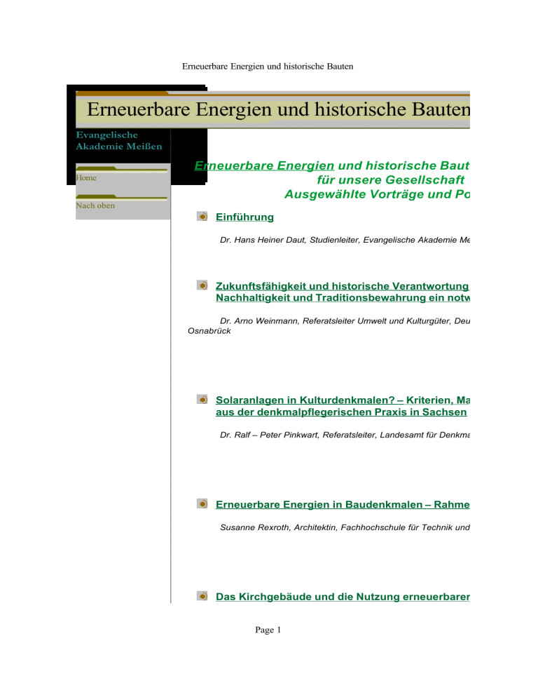 Erneuerbare Energien und historische Bauten Erneuerbare Energien und historische Bauten Evangelische Akademie Meißen Home Erneuerbare Energien und historische Bauten - Nachha für unsere Gesellschaft Ausgewählte Vorträge und Poster Nach oben Einführung Dr. Hans Heiner Daut, Studienleiter, Evangelische Akademie Meißen Zukunftsfähigkeit und historische Verantwortung Nachhaltigkeit und Traditionsbewahrung ein notwendiger Kom Dr. Arno Weinmann, Referatsleiter Umwelt und Kulturgüter, Deutsche Bundesstiftu Osnabrück Solaranlagen in Kulturdenkmalen? – Kriterien, Maßstäbe und B aus der denkmalpflegerischen Praxis in Sachsen Dr. Ralf – Peter Pinkwart, Referatsleiter, Landesamt für Denkmalpflege Sachsen, Erneuerbare Energien in Baudenkmalen – Rahmen, Spielräume Susanne Rexroth, Architektin, Fachhochschule für Technik und Wirtschaft, Berlin Das Kirchgebäude und die Nutzung erneuerbarer Energie Page 1 Erneuerbare Energien und historische Bauten Schöpfungsauftrag ?! Dr. Ulrich Böhme, Baureferent i. R., Landeskirchenamt der Ev.- Luth. Landeskirch Dresden Evangelische Akademie Meißen als Bildungseinrichtung und Demonstrationsobjekt für die Anwendung Erneuerbarer Dr. Eberhard Pfau, Architekturbüro Dresden Effiziente Energienutzung Dr. Stephan Scheffler, Ingenieurbüro, Dresden Photovoltaik bei der Restaurierung in Sachsen – eine Innovatio sich Bahn Dieter Winkler, Solarwatt, Solare- Systeme GmbH, Dresden Erneuerbare Energien und politische Umsetzung in Sachsen Dr. Bernd Wolters, Referent, Sächsisches Staatsministerium für Umwelt und Land Dresden Erneuerbare Energien und historische Bauten - Zusammenfass Diskussionsstandes Page 2 Erneuerbare Energien und historische Bauten Prof. Dr. Manfred Schmidt, Fachhochschule Zittau/ Görlitz, Zittau POSTER Bilder zum Vortrag D. Winkler Seitenanfang Einführung Dr. Hans Heiner Daut, Studienleiter, Evangelische Akademie Meißen Erneuerbare Energien stoßen bei ihrer Nutzung auf objektive und auf subjektive Probleme in der Gesellschaft. Kommen Erneuerbare Energien dabei mit historisch wertvollen Gebäuden in Berührung, nehmen die Akzeptanzschwierigkeiten zu. Die Evangelische Akademie versucht seit 10 Jahren diese Probleme zu benennen, im interdisziplinären Dialog zwischen Herstellern und Nutzern von Anlagen zur Umsetzung Erneuerbarer Energien sowie einer interessierten Öffentlichkeit technische Innovationen bekannt zu machen und Vorurteile abzubauen. Dabei ist deutlich, dass die Nutzung Erneuerbarer Energien ein Beitrag zur Bewahrung der Schöpfung sein kann und sie dann e akzeptiert erfolgt, wenn die technischen Lösungen den Einsatzerfordernissen angepasst w Probleme in gegenseitiger Abstimmung zu einer Annäherung geführt worden sind. Dass da individuelle Bewusstseinsänderungen erreicht werden müssen, ist immer wieder erkennbar Die Tagungen der Evangelischen Akademie Meißen haben versucht, diesen Bildungsauftra wahrzunehmen und in der praktischen Umsetzung die Chancen zu verdeutlichen, die in de Erneuerbarer Energie liegen. In dem 8. Meißner Forum – von der Deutschen Bundesstiftun dem Regierungspräsidium Dresden finanziell unterstützt –wird der Bildungsauftrag eindruck Präsentation der Demonstrationsobjekte der Evangelischen Akademie veranschaulicht. Ein rapsölbetriebenes Blockheizkraftwerk – von dem Sächsischen Umweltministerium geförder Regenwasseraufbereitung zur Speisung des Brauchwasserkreislaufes der Akademie im Einsatz, eine Solarthermie- und eine Photovoltaikanlage – von der Deutschen Bundesst gefördert und seit wenigen Monaten in Betrieb, demonstrieren den Einsatz Erneuerbarer En Akademie und führen vor, welchen Beitrag diese neuen Energiequellen zur thermischen un elektrischen Versorgung leisten können. Welchen Umfang Erneuerbare Energien in Sachs annehmen, welche technischen Lösungen möglich sind und wie eine von allen Beteiligten Lösung aussehen kann, ist darüber hinaus anschaulich dargestellt worden. Page 3 Erneuerbare Energien und historische Bauten Seitenanfang Zukunftsfähigkeit und historische Verantwortung – (k)ein Widerspruc Nachhaltigkeit und Traditions-bewahrung ein notwendiger Komprom Dr. Arno Weinmann, Referatsleiter Umwelt und Kulturgüter, Deutsche Bundesstiftung Umw Osnabrück Abstract Der Erhalt von Kulturdenkmälern ist kultureller Um Denkmalgeschützte Gebäude zu bewahren und zu schont Ressourcen im Baubereich. Kulturlandscha historische Gärten zu erhalten dient auch dem Art der Erholung des Menschen. Im Bundesgesetz zu der Deutschen Bundesstiftung Umwelt von 1990 u daraus abgeleiteten Förderleitlinien Förderbereich Kulturgüter" wird die Verbindung von Umwelt- und Kulturgüterschutz deutlich. Religiös-ethisch findet der Kulturgüterschutz seine Rechtfertigung in der Bewahrung der Sc wozu ausdrücklich auch das vom Menschen Geschaffene gehört. Analog zur Biodiversität ist kulturelle Vielfalt in einer zunehmend globalisierten Welt geford schafft Identität. Kultur beantwortet die Frage: Woher kommt der Mensch? Die Nutzung regenerativer und umweltfreundlicher Energien ist ein Schritt zur Bewahrung u Umwelt. Die Deutsche Bundesstiftung Umwelt förderte deshalb in ihrem Programm für die Sonnenenergie" von 1999 – 2001 die Nutzung von solarthermischen Anlagen und Photovoltaikanlagen in Verknüpfung mit Maßnahmen der Öffentlichkeitsarbeit. Auch für denkmalgeschützte Gebäude ist zu fragen, wie ihre Nutzung den genannten Anforderunge Page 4 Erneuerbare Energien und historische Bauten Teilaspektes des Umweltschutzes angepasst werden kann. Verschiedene Umweltziele können miteinander konkurrieren. Es sei hier nur auf die aktuel zwischen Naturschützern und Befürwortern von Windenergie verwiesen. Auch der Erhalt ei denkmalgeschützten Gebäudes kann in Konflikt geraten mit der Nutzung umweltfreundliche sowie der geplanten Einsparung von Energie durch den Eigentümer. Es ist Aufgabe von Mo der DBU, solche Konflikte zu lösen und Ratschläge für den Umgang mit solchen Konfli