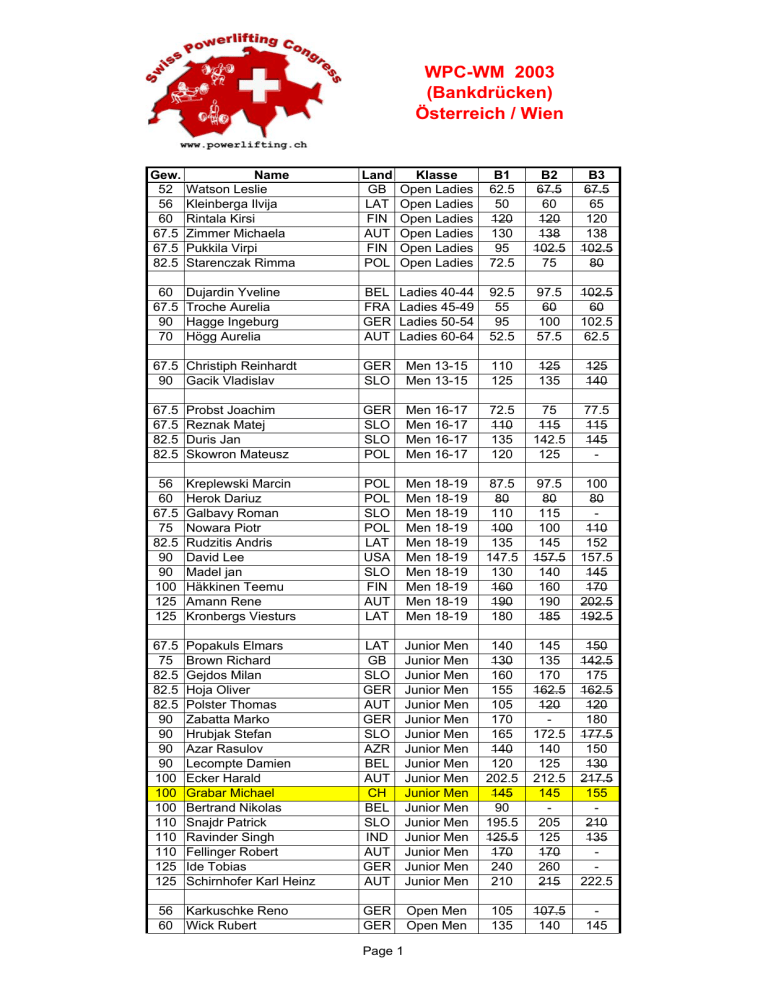 WPC-WM 2003 (Bankdrücken) Österreich / Wien Gew. 52 56 60 67.5 67.5 82.5 Name Watson Leslie Kleinberga Ilvija Rintala Kirsi Zimmer Michaela Pukkila Virpi Starenczak Rimma Land GB LAT FIN AUT FIN POL Klasse Open Ladies Open Ladies Open Ladies Open Ladies Open Ladies Open Ladies B1 62.5 50 120 130 95 72.5 B2 67.5 60 120 138 102.5 75 B3 67.5 65 120 138 102.5 80 60 67.5 90 70 Dujardin Yveline Troche Aurelia Hagge Ingeburg Högg Aurelia BEL FRA GER AUT Ladies 40-44 Ladies 45-49 Ladies 50-54 Ladies 60-64 92.5 55 95 52.5 97.5 60 100 57.5 102.5 60 102.5 62.5 67.5 Christiph Reinhardt 90 Gacik Vladislav GER SLO Men 13-15 Men 13-15 110 125 125 135 125 140 67.5 67.5 82.5 82.5 Probst Joachim Reznak Matej Duris Jan Skowron Mateusz GER SLO SLO POL Men 16-17 Men 16-17 Men 16-17 Men 16-17 72.5 110 135 120 75 115 142.5 125 77.5 115 145 - 56 60 67.5 75 82.5 90 90 100 125 125 Kreplewski Marcin Herok Dariuz Galbavy Roman Nowara Piotr Rudzitis Andris David Lee Madel jan Häkkinen Teemu Amann Rene Kronbergs Viesturs POL POL SLO POL LAT USA SLO FIN AUT LAT Men 18-19 Men 18-19 Men 18-19 Men 18-19 Men 18-19 Men 18-19 Men 18-19 Men 18-19 Men 18-19 Men 18-19 87.5 80 110 100 135 147.5 130 160 190 180 97.5 80 115 100 145 157.5 140 160 190 185 100 80 110 152 157.5 145 170 202.5 192.5 67.5 75 82.5 82.5 82.5 90 90 90 90 100 100 100 110 110 110 125 125 Popakuls Elmars Brown Richard Gejdos Milan Hoja Oliver Polster Thomas Zabatta Marko Hrubjak Stefan Azar Rasulov Lecompte Damien Ecker Harald Grabar Michael Bertrand Nikolas Snajdr Patrick Ravinder Singh Fellinger Robert Ide Tobias Schirnhofer Karl Heinz LAT GB SLO GER AUT GER SLO AZR BEL AUT CH BEL SLO IND AUT GER AUT Junior Men Junior Men Junior Men Junior Men Junior Men Junior Men Junior Men Junior Men Junior Men Junior Men Junior Men Junior Men Junior Men Junior Men Junior Men Junior Men Junior Men 140 130 160 155 105 170 165 140 120 202.5 145 90 195.5 125.5 170 240 210 145 135 170 162.5 120 172.5 140 125 212.5 145 205 125 170 260 215 150 142.5 175 162.5 120 180 177.5 150 130 217.5 155 210 135 222.5 Karkuschke Reno Wick Rubert GER GER Open Men Open Men 105 135 107.5 140 145 56 60 Page 1 WPC-WM 2003 (Bankdrücken) Österreich / Wien Gew. 67.5 67.5 75 75 75 82.5 82.5 82.5 82.5 90 90 90 90 90 90 90 90 Name Bacinsky Erik Herok Marcin Garcia Jean Luc Jelinek Radovan Strohmayer Roberto Schick Markus Trippl Jörg Hanns Günther Ptak Marek Scabolcs Onozo Sadkowski Andrzej Beck Oliver Auer Mario Kraus Helmut Romaner Christian Stadler Thomas Zuba Andreas Land SLO POL FRA SLO AUT GER AUT AUT GER HUN POL GER AUT GER AUT AUT AUT Klasse Open Men Open Men Open Men Open Men Open Men Open Men Open Men Open Men Open Men Open Men Open Men Open Men Open Men Open Men Open Men Open Men Open Men B1 135 110 200 150 130 260 210 190 165 260 220 205 192.5 185 165 170 170 B2 142.5 120 210 155 135 260 225 200 170 265 225 197.5 192.5 172.5 180 180 B3 122.5 215 160 135 273.5 225 200 170 270 230 205 192.5 170 180 180 100 100 100 100 100 100 100 100 100 100 100 100 100 100 100 Robert Mike Gayek Lutz Schwab Bernhard Haase Uwe Tiefenbacher Gerd Formela Dariusz Melkumjans Grigoits Ventre Pasquale Juren Markus Micek David Mayer Markus Retief Francois Brunner Franz Gamsjäger Lius Ekebom Mika USA GER AUT GER AUT POL LAT CH AUT GER AUT SA AUT AUT FIN Open Men Open Men Open Men Open Men Open Men Open Men Open Men Open Men Open Men Open Men Open Men Open Men Open Men Open Men Open Men 255 250 232.5 245 230 230 205 205 205 185 190 190 150 150 230 275 255 245 255 230 235 212.5 212.5 220 195 200 200 150 150 230 290 260 252.5 255 230 235 212.5 220 220 200 207.5 200 155 160 240 110 110 110 110 110 110 110 110 110 110 110 110 110 110 110 110 110 Cirulis Ivars Chenin Jean Marc Holzer Michael Kasparek Gernot Eberhart Ronnie Berndt Rene Mehmet Danni Kohs Gvido Novotny Herbert Daross Thomas Tugnait Som Nath Ettlinger Ralf Faber Andreas Scherr Rudolf Hartmann Frank Mayr Erich Tatinger Singh LAT FRA AUT AUT CH GER GB LAT AUT AUT IND AUT GER AUT GER AUT IND Open Men Open Men Open Men Open Men Open Men Open Men Open Men Open Men Open Men Open Men Open Men Open Men Open Men Open Men Open Men Open Men Open Men 240 240 237.5 210 225 225 192.5 210 195 200 190 175 170 160 170 210 160 247.5 247.5 242.5 220 240 237.5 210 220 195 210 200 185 180 165 170 210 160 252.5 252.5 245 230 240 245 220 220 202.5 210 210 200 190 175 170 - Page 2 WPC-WM 2003 (Bankdrücken) Österreich / Wien Gew. Name Land Klasse B1 B2 B3 125 125 125 125 125 125 125 Saastamoinen Petri Kruse Reiko Koszy Tomasz Seewald Franz Lorenz Sven Boulton Gary Moser Sergej FIN GER POL AUT GER GB UKR Open Men Open Men Open Men Open Men Open Men Open Men Open Men 230 220 230 210 190 180 240 240 227.5 235 225 200 185 240 250 240 235 225 205 190 240 140 140+ 140+ 140+ 140+ Frey Uwe Ber Ralf Jovanovic Milan Joch Thomas Zeggai Etienne GER AUT Serb AUT FRA Open Men Open Men Open Men Open Men Open Men 260 240 220 225 200 270 260 230 230 215 275 260 237.5 230 222.5 67.5 75 100 100 110 125 125 125 125 140 140+ 140+ 140+ 140+ Herzog Philippe Rien Bertold Brasseur Robert Val Bergs Jevgenijs Kudums Rainers Seminatore Dominique Judko Juris Ackermann Peter Siwarsky Roman Sandkühler Uwe Newrkla Josef Paratschek Harald Fricker Richard Böttcher CH GER FRA LAT LAT FRA LAT GER POL GER AUT AUT GB GER Men 40-44 Men 40-44 Men 40-44 Men 40-44 Men 40-44 Men 40-44 Men 40-44 Men 40-44 Men 40-44 Men 40-44 Men 40-44 Men 40-44 Men 40-44 Men 40-44 177.5 150 220 170 200 200 215 180 180 170 260 220 180 260 182.5 165 230 170 210 212.5 215 190 180 180 270 227.5 207.5 270 186.5 167.5 240 175 215 222.5 222.5 195 190 280 227.5 217.5 - 75 82.5 82.5 82.5 90 90 90 100 100 100 100 100 100 110 110 110 110 125 125 140 Werner Uwe Mattei Francis Tifaout Thierry Rien Dietmar Hirner Arthur Pawlukiewicz Mieczyslaw Wrobel Wieslaw Scott Lee Mehlich Eugeniusz Kaleja Stanislaw Zeller Erich Neubert Michael Schwaier Uwe Schmidt Dag Slosarek Christian Gürschka Gerhard Vrabetz Gerhard Pevko Viktors Mrosek Andreas Bialic Woj