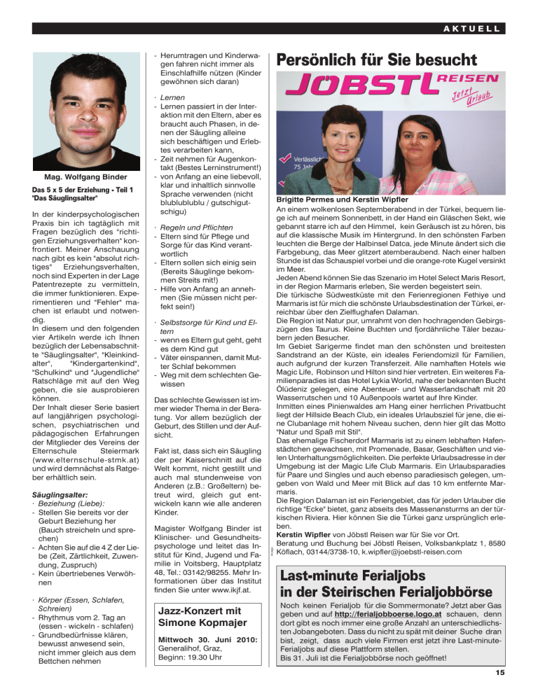AKTUELL - Herumtragen und Kinderwagen fahren nicht immer als Einschlafhilfe nützen (Kinder gewöhnen sich daran) Das 5 x 5 der Erziehung - Teil 1 "Das Säuglingsalter" In der kinderpsychologischen Praxis bin ich tagtäglich mit Fragen bezüglich des "richtigen Erziehungsverhalten" konfrontiert. Meiner Anschauung nach gibt es kein "absolut richtiges" Erziehungsverhalten, noch sind Experten in der Lage Patentrezepte zu vermitteln, die immer funktionieren. Experimentieren und "Fehler" machen ist erlaubt und notwendig. In diesem und den folgenden vier Artikeln werde ich Ihnen bezüglich der Lebensabschnitte "Säuglingsalter", "Kleinkindalter", "Kindergartenkind", "Schulkind" und "Jugendliche" Ratschläge mit auf den Weg geben, die sie ausprobieren können. Der Inhalt dieser Serie basiert auf langjährigen psychologischen, psychiatrischen und pädagogischen Erfahrungen der Mitglieder des Vereins der Elternschule Steiermark (www.elternschule-stmk.at) und wird demnächst als Ratgeber erhältlich sein. Säuglingsalter: · Beziehung (Liebe): - Stellen Sie bereits vor der Geburt Beziehung her (Bauch streicheln und sprechen) - Achten Sie auf die 4 Z der Liebe (Zeit, Zärtlichkeit, Zuwendung, Zuspruch) - Kein übertriebenes Verwöhnen · Körper (Essen, Schlafen, Schreien) - Rhythmus vom 2. Tag an (essen - wickeln - schlafen) - Grundbedürfnisse klären, bewusst anwesend sein, nicht immer gleich aus dem Bettchen nehmen · Lernen - Lernen passiert in der Interaktion mit den Eltern, aber es braucht auch Phasen, in denen der Säugling alleine sich beschäftigen und Erlebtes verarbeiten kann, - Zeit nehmen für Augenkontakt (Bestes Lerninstrument!) - von Anfang an eine liebevoll, klar und inhaltlich sinnvolle Sprache verwenden (nicht blublublublu / gutschigutschigu) · Regeln und Pflichten - Eltern sind für Pflege und Sorge für das Kind verantwortlich - Eltern sollen sich einig sein (Bereits Säuglinge bekommen Streits mit!) - Hilfe von Anfang an annehmen (Sie müssen nicht perfekt sein!) · Selbstsorge für Kind und Eltern - wenn es Eltern gut geht, geht es dem Kind gut - Väter einspannen, damit Mutter Schlaf bekommen - Weg mit dem schlechten Gewissen Das schlechte Gewissen ist immer wieder Thema in der Beratung. Vor allem bezüglich der Geburt, des Stillen und der Aufsicht. Fakt ist, dass sich ein Säugling der per Kaiserschnitt auf die Welt kommt, nicht gestillt und auch mal stundenweise von Anderen (z.B.: Großeltern) betreut wird, gleich gut entwickeln kann wie alle anderen Kinder. Magister Wolfgang Binder ist Klinischer- und Gesundheitspsychologe und leitet das Institut für Kind, Jugend und Familie in Voitsberg, Hauptplatz 48, Tel.: 03142/98255. Mehr Informationen über das Institut finden Sie unter www.ikjf.at. Jazz-Konzert mit Simone Kopmajer Mittwoch 30. Juni 2010: Generalihof, Graz, Beginn: 19.30 Uhr Anzeige Mag. Wolfgang Binder Persönlich für Sie besucht Brigitte Permes und Kerstin Wipfler An einem wolkenlosen Septemberabend in der Türkei, bequem liege ich auf meinem Sonnenbett, in der Hand ein Gläschen Sekt, wie gebannt starre ich auf den Himmel, kein Geräusch ist zu hören, bis auf die klassische Musik im Hintergrund. In den schönsten Farben leuchten die Berge der Halbinsel Datca, jede Minute ändert sich die Farbgebung, das Meer glitzert atemberaubend. Nach einer halben Stunde ist das Schauspiel vorbei und die orange-rote Kugel versinkt im Meer. Jeden Abend können Sie das Szenario im Hotel Select Maris Resort, in der Region Marmaris erleben, Sie werden begeistert sein. Die türkische Südwestküste mit den Ferienregionen Fethiye und Marmaris ist für mich die schönste Urlaubsdestination der Türkei, erreichbar über den Zielflughafen Dalaman. Die Region ist Natur pur, umrahmt von den hochragenden Gebirgszügen des Taurus. Kleine Buchten und fjordähnliche Täler bezaubern jeden Besucher. Im Gebiet Sarigerme findet man den schönsten und breitesten Sandstrand an der Küste, ein ideales Feriendomizil für Familien, auch aufgrund der kurzen Transferzeit. Alle namhaften Hotels wie Magic Life, Robinson und Hilton sind hier vertreten. Ein weiteres Familienparadies ist das Hotel Lykia World, nahe der bekannten Bucht Ölüdeniz gelegen, eine Abenteuer- und Wasserlandschaft mit 20 Wasserrutschen und 10 Außenpools wartet auf Ihre Kinder. Inmitten eines Pinienwaldes am Hang einer herrlichen Privatbucht liegt der Hillside Beach Club, ein ideales Urlaubsziel für jene, die eine Clubanlage mit hohem Niveau suchen, denn hier gilt das Motto "Natur und Spaß mit Stil". Das ehemalige Fischerdorf Marmaris ist zu einem lebhaften Hafenstädtchen gewachsen, mit Promenade, Basar, Geschäften und vielen Unterhaltungsmöglichkeiten. Die perfekte Urlaubsadresse in der Umgebung ist der Magic Life Club Marmaris. Ein Urlaubsparadies für Paare und Singles und auch ebenso paradiesisch gelegen, umgeben von Wald und Meer mit Blick auf das 10 km entfernte Marmaris. Die Region Dalaman ist ein Feriengebiet, das für jeden Urlauber die richtige "Ecke" bietet, ganz abseits des Massenansturms an der türkischen Riviera. Hier können Sie die Türkei ganz ursprünglich erleben. Kerstin Wipfler von Jöbstl Reisen war für Sie vor Ort. Beratung und Buchung bei Jöbstl Reisen, Volksbankplatz 1, 8580 Köflach, 03144/3738-10, [email protected] Last-minute Ferialjobs in der Steirischen Ferialjobbörse Noch keinen Ferialjob für die Sommermonate? Jetzt aber Gas geben und auf http://ferialjobboerse.logo.at schauen, denn dort gibt es noch immer eine große Anzahl an unterschiedlichsten Jobangeboten. Dass du nicht zu spät mit deiner Suche dran bist, zeigt, dass auch viele Firmen erst jetzt ihre Last-minuteFerialjobs auf diese Plattform stellen. Bis 31. Juli ist die Ferialjobbörse noch geöffnet! 15