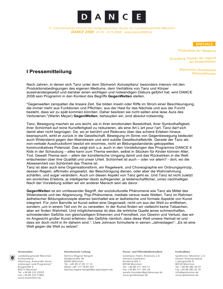I Pressemitteilung Nach Jahren, in denen sich Tanz unter dem Stichwort ‚Konzepttanz’ besonders intensiv mit den Produktionsbedingungen des eigenen Mediums, dem Verhältnis von Tanz und Körper auseinandergesetzt und darüber einen wichtigen und notwendigen Diskurs geführt hat, wird DANCE 2008 sein Programm in den Kontext des Begriffs GegenWelten stellen. "Gegenwelten zerspalten die lineare Zeit. Sie bilden Inseln oder Riffe im Strom einer Beschleunigung, die immer mehr aus Funktionen und Pflichten, aus der Hast für das Nächste und aus der Furcht besteht, dass wir zu spät kommen könnten. Daher besitzen sie nicht selten eine leise Aura des Verbotenen."(Martin Meyer) GegenWelten, behaupten wir, sind absolut notwendig. Tanz, Bewegung machen es uns leicht, sie in ihrer emotionalen Besetztheit, ihrer Symbolhaftigkeit, ihrer Schönheit auf reine Kunstfertigkeit zu reduzieren, als eine Art L’art pour l’art. Tanz darf sich damit aber nicht begnügen. Da, wo er berührt und Relevanz über das schiere Erleben hinaus beansprucht, wirkt er zurück in die Gesellschaft. Bewegung im Sinne von Gegenbewegung bedeutet auch Widerstand gegen den Mainstream und wird subtile Gesellschaftskritik. Gerade der Tanz als non-verbale Ausdrucksform besitzt ein enormes, nicht an Bildungsstandards gekoppeltes kommunikatives Potenzial. Das zeigt sich u.a. auch in den Vorstellungen des Programms DANCE 4 Kids in der Schauburg – alles kann zum Thema werden, selbst in Stücken für Kinder können Alter, Tod, Gewalt Thema sein – allein der künstlerische Umgang damit und das Rückwirken in die Welt entscheiden über ihre Qualität und unser Urteil. Schönheit ist auch – oder vor allem? - dort, wo die Abwesenheit von Schönheit das Thema ist. Tanz ist aber auch eine Organisationsform, ein Regelwerk, und Choreographie ein Ordnungsprinzip, dessen Regeln, affirmativ eingesetzt, der Beschönigung dienen, oder aber die Wahrnehmung schärfen, und sogar verändern. Auch um diesen Aspekt von Tanz geht es. Und Tanz ist nicht zuletzt ein sinnliches Erlebnis, je intelligenter desto aufregender, je leidenschaftlicher, umso nachhaltiger. Nach der Vorstellung sollten wir ein anderer Mensch sein als davor. GegenWelten ist ein umfassender Begriff, der soziokulturelle Phänomene wie Tanz als Mittel des Widerstands und der Abgrenzung, Pop-Phänomene, mediale versus reale Welten, Tanz im Rahmen ästhetischer Bildungskonzepte ebenso beinhaltet wie er ästhetische und formale Aspekte von Kunst integriert. Für John Banville ist Kunst selbst eine Gegenwelt, nicht um aus der Welt zu entfliehen, sondern „um in einem Teil von ihr zu verweilen. In der Kunst finden wir vielleicht keine Tatsachen, aber wir finden Wahrheit. Und möglicherweise ist dies die wirkliche Quelle jenes schmerzhaften, schneidenden Gefühls von gleichzeitigem Erkennen und Fremdheit, von Gewinn und Verlust, das wir im Angesicht großer Kunst erfahren; des Gefühls nämlich, dass diese Welt unsere Heimat ist und dass wir doch nicht in ihr daheim sind.“. Uwe Johnson formulierte in seinen „Jahrestagen“: „Es ist eine Welt gegen die Welt zu setzen“. DANCE2008 GegenWelten wird ein Geflecht sein aus Fragestellungen, die sich gegenseitig überlagern und ergänzen: Forschen nach der eigenen kreativen Biographie bei Rosemary Butcher und Wim Vandekeybus, nach dem kreativen Potential medialer Welten bei movingsky, WILHELM GRÖNER und Chris Ziegler, nach der Widerstandskraft der Imagination bei Claudia de Serpa Soares, Grayson Millwood, Egon Madsen und Eric Gauthier, bei Nacho Duato, Simone Sandroni, Marjoleine Boonstra und Stefan Dreher. Ivana Müller und L.I.S.A., Deborah Hay und Wendy Houstoun loten die Möglichkeiten und Verschränkungen verschiedener medialer und theatraler Ebenen aus – völlig unterschiedlich in ihren Ansätzen inszenieren sie Übergänge von Sprache zu Bewegung zu Sprache… mit viel Humor und jede auf überraschenden Wegen. Hofesh Shechters und Bruno Beltraos Stücke erobern eine neue Dimension von Bewegung, von Konkretion und Abstraktion…Und VAWölfl macht wie immer etwas ganz anderes… Bettina Wagner-Bergelt Künstlerische Leiterin Pressekontakt: Goldmann Public Relations Amalie v. Hinüber, Tel.: 089/ 21 11 64 11, Email: [email protected] II Vorschau auf das Festival-Programm Specials Zum ersten Mal werden vor dem Kernzeitraum des Festivals Specials stattfinden, in denen zwei große Kunstinstitutionen Münchens ein eigenes Programm in Kooperation mit DANCE präsentieren. Special DANCE 4 Kids in der SchauBurg, Theater der Jugend am Elisabethplatz 15. bis 31.Oktober 2008 Tanz für und mit Kindern ist seit Jahren ein viel diskutiertes Thema in der Bildungsdebatte, denn Tanz ist ein Medium, das dort einsetzt, wo Sprache ihre Grenzen findet. Unter der Intendanz von George Podt wurde die Schauburg, das Kinder- und Jugendtheater in München, zu einem Ort kreativer und sinnlicher Umsetzung existentieller Themen im Leben von Kindern, Jugendlichen und Erwachsenen. In Kooperation mit dem Tanzfestival DANCE 2008 veranstaltet die SCHAUBURG mit „DANCE 4 KIDS“ eine Tanzreihe, die sich vorrangig an Kinder im Grundschulalter richtet. Tanz kann Geschichten mit dem Körper erzählen. Tanz zeigt emotionale Begegnungen von Menschen durch Bewegung. Tanz ist eine künstlerische Ausdrucksform, die jeder verstehen kann, weil sie ohne Sprache auskommt. Wer Augen und Ohren hat, wer sehen und hören kann, der kann das auf der Bühne Gezeigte begreifen, erfassen, interpretieren, beurteilen, mit Sinn oder eigener Erfahrung füllen. Die Reihe präsentiert einerseits Vorstellungen, die ausdrücklich für ein junges Publikum kreiert wurden, andererseits auch Stücke, die für Erwachsene gemacht wurden wie „Don Q.“ oder „Edgar“, die sich aber in ihrer Allgemeingültigkeit an alle Menschen ab dem Schulalter richten. Statement: George Podt, Intendant Theater der Jugend Special Lange Nacht des Tanzes mit dem Bayerischen Staatsballett 18.Oktober 2008, 19.30