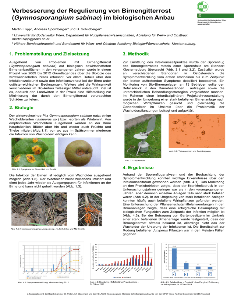 Verbesserung der Regulierung von Birnengitterrost (Gymnosporangium sabinae) im biologischen Anbau Martin Filippa, Andreas Spornbergera und B. Schildbergerb a Universität für Bodenkultur Wien, Department für Nutzpflanzenwissenschaften, Abteilung für Wein- und Obstbau; [email protected] b Höhere Bundeslehranstalt und Bundesamt für Wein- und Obstbau Abteilung Biologie/Pflanzenschutz; Klosterneuburg. 1. Problemstellung und Zielsetzung 3. Methodik Ausgehend von Problemen mit Birnengitterrost (Gymnosporangium sabinae) auf biologisch bewirtschafteten Birnenanbauflächen in den vergangenen Jahren wurde in einem Projekt von 2009 bis 2012 Grundlegendes über die Biologie des wirtswechselnden Pilzes erforscht, vor allem Details über den Infektionszeitpunkt sowie den Infektionsverlauf bei der Birne unter ostösterreichischen Bedingungen. Weiters wird die Wirksamkeit verschiedener im Bio-Anbau zulässiger Mittel untersucht. Ziel ist es, dadurch den Landwirten in der Praxis eine Hilfestellung zur Minimierung der durch den Birnengitterrost verursachten Schäden zu liefern. Zur Ermittlung des Infektionszeitpunktes wurde der Sporenflug des Birnengitterrostes mittels einer Sporenfalle am Standort Klosterneuburg überwacht (Abb. 3.1 und 3.2). Zusätzlich wurde an verschiedenen Standorten in Ostösterreich die Symptomentwicklung vom ersten erscheinen bis zum Zeitpunkt der letzten auftretenden Symptome detailliert beobachtet. Ein Monitoring von Bio-Birnenanlagen an 13 Betrieben sollte den Befallsdruck in den Baumbeständen aufzeigen sowie die unterschiedlichen Behandlungsstrategien vergleichbar machen. Im Rahmen einer interdisziplinären Projektlehrveranstaltung wurde in der Umgebung einer stark befallenen Birnenanlage nach möglichen Wirtspflanzen gesucht und gleichzeitig die Gartenbesitzer im Umkreis über die Problematik der Wacholderpflanzungen befragt und aufgeklärt. 2. Biologie Der wirtswechselnde Pilz Gymnosporangium sabinae nutzt einige Wacholderarten (Juniperus sp.) bzw. -sorten als Winterwirt. Von empfindlichen Wacholdern ausgehend werden an der Birne hauptsächlich Blätter aber hin und wieder auch Früchte und Triebe infiziert (Abb.1.1), von wo aus im Spätsommer wiederum die Infektion von Wacholdern erfolgen kann. Abb. 3.2: Teleutosporen und Basidiosporen Abb. 3.1: Sporenfalle 4. Ergebnisse Abb. 1.1: Symptome an Birnenblatt und Frucht Anhand der Sporenfluganalysen und der Beobachtung der Symptomentwicklung konnten wichtige Erkenntnisse über den Infektionszeitraum gewonnen werden (Abb. 4.1). Das Monitoring an den Praxisbetrieben zeigte, dass der Krankheitsdruck in den Untersuchungsjahren geringer war als in den vorangegangenen Jahren, aber dennoch einzelne Anlagen teils sehr stark befallen waren (Abb 4.2). In der Umgebung von stark befallenen Anlagen konnten häufig auch befallene Wirtspflanzen gefunden werden. Eine Untersuchung der Pflanzenschutzmittelanwendungen in den Birnenanlagen zeigte, dass eine erfolgreiche Bekämpfung mit biologischen Fungiziden zum Zeitpunkt der Infektion möglich ist (Abb. 4.3). Bei der Befragung von Gartenbesitzern im Umkreis einer stark befallenen Birnenanlage wurde festgestellt, dass der Birnengitterrost oftmals bekannt ist, allerdings nicht das der Wacholder der Ursprung der Infektionen ist. Die Bereitschaft zur Rodung befallener Juniperus Pflanzen war in den Meisten Fällen gegeben. Die Infektion der Birnen ist lediglich vom Wacholder ausgehend möglich (Abb.1.2). Der Wacholder bleibt zeitlebens infiziert und dient jedes Jahr wieder als Ausgangspunkt für Infektionen an der Birne und kann nicht geheilt werden (Abb. 1.3). 80 40 70 35 60 Befallstellen/100 Blätter Birnengitterrost Befallsstellen/100 Blätter Abb. 1.2: Teleutosporenlager an Juniperus sp. im April (links) und Mai (rechts) 50 40 30 20 10 0 25 20 15 9,71 10 4,27 3,30 5 0 Langtrieb Abb. 4.1: Symptomentwicklung, Klosterneuburg 2011 33,43 30 Fruchtsproß Abb. 4.2: Monitoring Befallsstärke Praxisbetriebe – St.Pölten 2010 ohne Fungizid 50m Fungizid 50m Fungizid 110m Fungizid 170m a* b* b* b* * Kruskal-Wallis -Test/ Post Hoc:Tamhane ; α=0.05; Homogene Untergruppen a, b Abb. 4.3: Befallsstärke - Fungizid/ ohne Fungizid, Entfernung zur Wirtspflanze; St. Pölten 2011 In Kooperation mit der Bezirkskammer St. Pölten, LK Steiermark und der HBLAWO Klosterneuburg (Barbara Schíldberger) und wurde von der OPST (Opst Partner Steiermark GmbH) finanziert