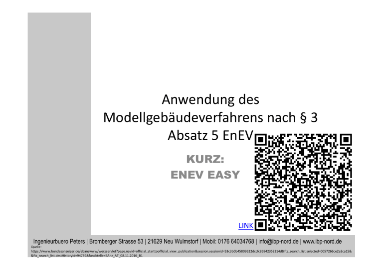 Anwendung des Modellgebäudeverfahrens nach § 3 Absatz 5 EnEV KURZ: ENEV EASY LINK Ingenieurbuero Peters | Bromberger Strasse 53 | 21629 Neu Wulmstorf | Mobil: 0176 64034768 | [email protected] | www.ibp-nord.de Quelle: https://www.bundesanzeiger.de/ebanzwww/wexsservlet?page.navid=official_starttoofficial_view_publication&session.sessionid=53c3b0b45809622dccfc86942352314d&fts_search_list.selected=0057266ce2a3ca15& &fts_search_list.destHistoryId=94739&fundstelle=BAnz_AT_08.11.2016_B1 Allgemeine Anwendungsvoraussetzungen a) Das Gebäude ist ein Wohngebäude im Sinne der Begriffsbestimmung in § 2 Nummer 1 EnEV; wird ein gemischt genutztes Gebäude nach § 22 Absatz 1 oder 2 EnEV in zwei Gebäudeteile aufgeteilt, so kann diese Bekanntmachung bei Erfüllung aller anderen Voraussetzungen auf den Wohngebäudeteil angewandt werden. b) Das Gebäude wird nicht mit anlagentechnischen Einrichtungen (Klimaanlage) gekühlt. c) Die Wärmebrücken, die im Rahmen von rechnerischen Nachweisen zu berücksichtigen wären, sind so auszuführen, dass sie mindestens gleichwertig mit den Musterlösungen der DIN 4108 Beiblatt 2: 2006-03 sind. Für Wärmebrücken, bei denen die angrenzenden Bauteile kleinere Wärmedurchgangskoeffizienten aufweisen, als in den Musterlösungen zugrunde gelegt sind, sind Gleichwertigkeitsnachweise nicht erforderlich (§ 7 Absatz 3 Satz 2 EnEV). d) Die Dichtheit des Gebäudes ist nach § 6 Absatz 1 Satz 2 in Verbindung mit Anlage 4 EnEV zu prüfen und muss die dort genannten Grenzwerte einhalten. e) Das Gebäude muss die Voraussetzungen erfüllen, die nach DIN 4108-2:2013-02 Nummer 8.2.2 Buchstabe b vorliegen müssen, dass der sommerliche Wärmeschutz auch ohne Nachweisrechnung als ausreichend angesehen werden kann: – Beim kritischen Raum (Raum mit der höchsten Wärmeeinstrahlung im Sommer gemäß DIN 4108-2:2013-02) beträgt der Fensterflächenanteil bezogen auf die Grundfläche dieses Raums nicht mehr als 35 vom Hundert. –Sämtliche Fenster in Ost-, Süd- oder Westorientierung (inklusive derer eines eventuellen Glasvorbaus) sind mit außenliegenden Sonnenschutzvorrichtungen mit einem Abminderungsfaktor FC ≤ 0,30 ausgestattet. Hinweis /Frage : Die DIN 4108-2:2013-02 bezieht sich auf den Fensterflächenanteil bezogen auf die Grundfläche dieses Raums (RICHTIG), jedoch steht unter Anlage 2 3 Hinweise Der maximale Flächenanteil der Fenster und Fenstertüren ist das Verhältnis der maximal zulässigen Flächensumme aller solcher Bauteile zur Gesamtfläche der Fassaden; dies ist die summierte Fläche der Außenwände, Fenster, Fenstertüren, speziellen Fenstertüren und Außentüren. Muss noch ein Sommerlicher Wärmeschutznachweis nach DIN 4108 erstellt werden (Nachweisfrei nach DIN 4108 bis 10-15%) Ingenieurbuero Peters | Bromberger Strasse 53 | 21629 Neu Wulmstorf | Mobil: 0176 64034768 | [email protected] | www.ibp-nord.de Geometrische Anwendungsvoraussetzungen a) Die Gebäudegröße AGS darf nicht kleiner als 115 m2 und nicht größer als 2 300 m2 sein. Sie ist ganzzahlig zu runden. b) Die mittlere Geschosshöhe des Gebäudes darf nicht kleiner als 2,5 m und nicht größer als 3 m sein. c) Der Umfang u (in m) der Bruttogeschossfläche jedes beheizten Geschosses AG (in m2) muss folgende Bedingung erfüllen: u2 ≤ 20 · AG d)Bei nicht freistehenden Gebäuden sind in den Umfang u auch die Gebäudeteile einzurechnen, die an ein anderes beheiztes Gebäude angrenzen. e) Bei Gebäuden mit beheizten Räumen in mehreren Geschossen müssen die beheizten Moderne Architektur Bruttogeschossflächen aller Geschosse ohne Vor- oder Rücksprünge deckungsgleich sein; nur das schwer mehr möglich! oberste Geschoss darf eine kleinere beheizte Bruttogeschossfläche als das darunter liegende Geschoss besitzen (Staffelgeschoss). Kellerabgänge und Kellervorräume sind keine beheizten Geschosse im Sinne dieser Regelung, soweit sie nur indirekt beheizt sind. f) Insgesamt darf das Gebäude nicht mehr als sechs beheizte Geschosse besitzen. g) Folgende Anteile transparenter Flächen dürfen nicht überschritten werden: 1.Der Anteil aller Fensterflächen des Gebäudes4 an der gesamten Fassadenfläche des Gebäudes darf bei zweiseitig angebauten Gebäuden nicht mehr als 35 vom Hundert, bei allen anderen Gebäuden nicht mehr als 30 vom Hundert betragen. 2. Der Anteil der Fensterfläche der Fassaden4, die zwischen Nordwest über Nord bis Nordost orientiert sind5, darf nicht mehr als 30 vom Hundert der zu diesen Himmelsrichtungen ausgerichteten Fassadenfläche betragen. 3. Der Anteil der Fläche spezieller Fenstertüren4 an der gesamten Fassadenfläche des Gebäudes darf den in Anlage 2 Tabelle 1 Zeile 6a genannten Anteil nicht überschreiten. 4.Der Anteil aller Flächen von Dachflächenfenstern, Lichtkuppeln und ähnlichen transparenten Bauteilen an allen waagerechten und geneigten Dachflächen darf den in Anlage 2 Tabelle 1 Zeile 7a bzw. 8a genannten Anteil nicht überschreiten. h) Die maximale Gesamtfläche aller Außentüren6 darf in Abhängigkeit von der Gebäudegröße AGS die Werte nach Tabelle 1 nicht überschreiten: Hinweis /Frage : Die Charakteristische Länge und Breite sind in der DIN V 18599-1: 2011-12 Abschnitt 8 benannt / vorhanden, jedoch kein „Umfang u (in m)“?! Die Bruttogeschossflächen aller Geschosse ohne Vor- oder Rücksprünge deckungsgleich sein… wie ist die genaue Definition von „Vor- oder Rücksprünge“ und was ist deckungsgleich ? Was sind z.B.„indirekt beheizt“ Kellerräume? Wie und wonach ist die mittlere Geschosshöhe nach zu weisen? Wie sind beheizte und unbeheizte Kellerräume innerhalb oder außerhalb der thermischen Hülle zu bewerten? Das oberste Geschoss darf kleiner sein als das darunter liegende Geschoss… um wieviel kleiner und auf welcher Betrachtungsgrundlage? Bruttogeschossfläche AG nach DIN V 18599-1: 2011-12 Abschnitt 8 Hinweis /Frage : Die „Bruttogeschossfläche“ wie auch das Indize „AG “ sind nicht in der nach DIN V 18599-1: 2011-12 Ab