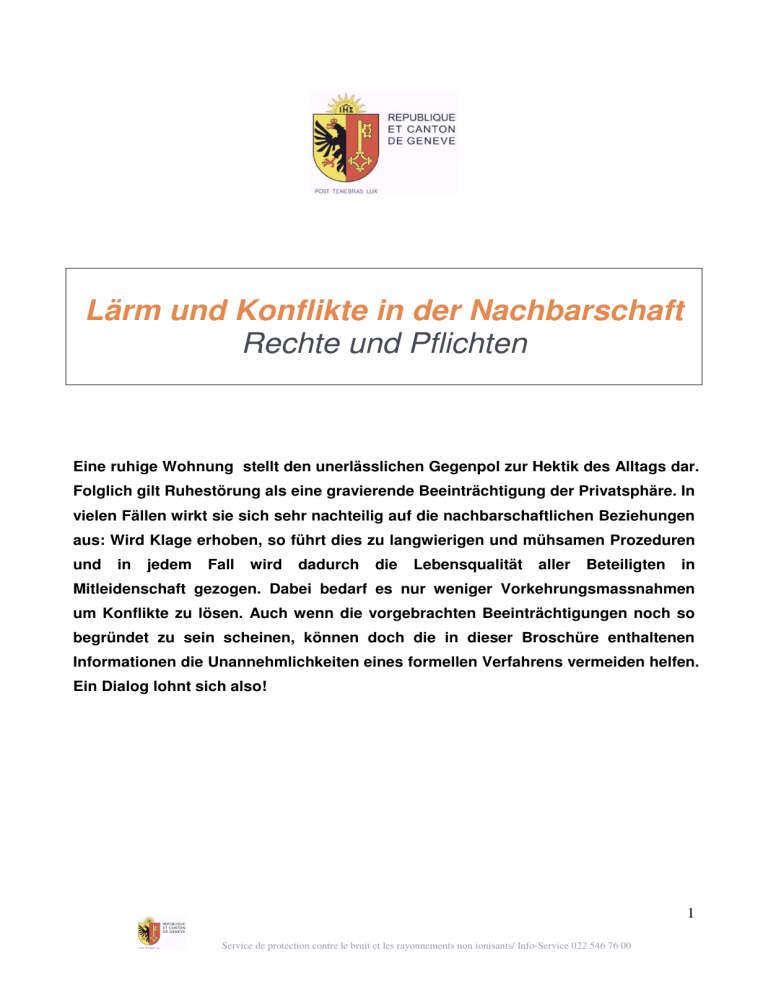 Lärm und Konflikte in der Nachbarschaft Rechte und Pflichten Eine ruhige Wohnung stellt den unerlässlichen Gegenpol zur Hektik des Alltags dar. Folglich gilt Ruhestörung als eine gravierende Beeinträchtigung der Privatsphäre. In vielen Fällen wirkt sie sich sehr nachteilig auf die nachbarschaftlichen Beziehungen aus: Wird Klage erhoben, so führt dies zu langwierigen und mühsamen Prozeduren und in jedem Fall wird dadurch die Lebensqualität aller Beteiligten in Mitleidenschaft gezogen. Dabei bedarf es nur weniger Vorkehrungsmassnahmen um Konflikte zu lösen. Auch wenn die vorgebrachten Beeinträchtigungen noch so begründet zu sein scheinen, können doch die in dieser Broschüre enthaltenen Informationen die Unannehmlichkeiten eines formellen Verfahrens vermeiden helfen. Ein Dialog lohnt sich also! 1 Service de protection contre le bruit et les rayonnements non ionisants/ Info-Service 022 546 76 00 Was sagt das Gesetz? Im Gegensatz zu einer weit verbreiteten Meinung ist Ruhestörung tagsüber ebenso wenig erlaubt wie in der Nacht, da Bürger und Bürgerinnen dazu verpflichtet sind, jeden unnötigen Lärm zu vermeiden, und dies ungeachtet der Tageszeit. Dieser Grundsatz ist jedoch während der Nacht noch strenger einzuhalten, um eine Ruhestörung der Nachbarn zu vermeiden. Die Gesetzgebung von Genf1 weist darauf hin, dass unnötiger Lärm zu jeder Zeit verboten ist. Diese Regel ist zwischen 21h und 7h besonders einzuhalten, da die Bezeichnung „unnötig“ während der Nacht noch offenkundiger ist2. Wie ferner aus dem Schweizerischen Zivilgesetzbuch hervorgeht 3 , sind Überschreitungen dieser Regel weder im privaten Bereich noch in der Öffentlichkeit erlaubt. Daher sind sämtliche Maßnahmen zu treffen, damit die Ruhe weder in der Öffentlichkeit, noch in der engsten Nachbarschaft 4 gestört wird. Für Mietwohnungen legen Mietverträge fest, dass der Mieter verpflichtet ist, seinen Nachbarn gegenüber die notwendige Rücksicht5 walten zu lassen und somit die Ruhe des Gebäudes in dem er wohnt, nicht stören darf. Was ist erlaubt? Das Gesetz sieht keinen Pegel vor, der „unnötigen“ Lärm genauer definiert. Hängt der Lärm von dem Verhalten einer Person ab, die nicht nach den allgemein zulässigen Gewohnheiten handelt, spricht man von Ruhestörung. Es ist daher nicht notwendig, Lärmpegel zu messen um Ruhestörung festzustellen. Hingegen sind Situationen in denen ein gewisser Lärm unerlässlich ist, erlaubt. Nachstehende Beispiele sollen den Unterschied klarer darlegen: Zulässiger Lärm Babygeschrei Umzug, gelegentliches Aufstellen von Möbeln, an Werktagen zwischen 7h und 21h Staubsauger, tagsüber Privat-Musikstunden, tagsüber Gelegentliche handwerkliche Arbeiten, werktags zwischen 7h und 21h Lärm durch Leitungen während des Tages Rasenmähen, werktags zwischen 8h bis 20h Unnötiger Lärm Hüpfen von Kindern auf dem Boden Ständiges, rücksichtsloses Hin- und Herschieben von Möbeln Haushaltsarbeiten während der Nachtstunden Laute Musik, die durch die Wohnung zu hören ist Handwerkliche Arbeiten, zwischen 21h und 7h oder an Sonn- und Feiertagen, auch wenn nur gelegentlich Baden während der Nacht Rasenmähen zwischen 20h und 8h oder an Sonn- und Feiertagen Ungenügende Isolierung Wohnungen, die nach dem 1. Januar 1985 gebaut wurden, haben Mindestbedingungen in Sachen Isolierung zu genügen. So kann ein Mieter seinen Besitzer - oder die Hausverwaltung - bitten diese Normen einzuhalten,6 sofern ein Gutachten diesbezüglich Lücken aufgedeckt hat. Im Falle eines Konfliktes in der Nachbarschaft, kann sich der Mieter jedoch nicht auf eine ungenügende Isolierung berufen, um eine Ruhestörung zu rechtfertigen: Sofern ein Lärm durch entsprechendes Verhalten unter Kontrolle gebracht werden kann, obliegt es stets der Person, die den Lärm verursacht, die nötigen Massnahmen zu treffen, die den Umständen entsprechen, um die Nachbarn nicht zu stören. 1 Regelung betreffend der öffentlichen Ruhe und der Ausübung der öffentlichen Freiheiten (F3 10.03) (in der Folge als „Regelung“ bezeichnet) 2 Art. 3 der Regelung 3 Art. 684, Schweizerisches Zivilgesetzbuch(SR 210) « verboten ist insbesondere jeder schädliche und die Grenzen der zwischen Nachbarn geltenden Toleranz überschreitende Lärm, je nach Lage und Beschaffenheit der Grundstücke …“ 4 Art. 1, Abs. 3 der Vorschrift 5 Art. 257f des Obligationenrechts (RS220) 6 Art. 62 Lärmschutzverordnung (SR 814.41 LSV) und SIA Norm 181 (Norm der Schweizerischen Gesellschaft für Ingenieure und Architekten) 2 Service de protection contre le bruit et les rayonnements non ionisants/ Info-Service 022 546 76 00 Praktische Empfehlungen zur Verhinderung von Konflikten Gelegentlicher Lärm oder regelmässiger Bei punktuellen Ereignissen und Festen, trägt eine vorherige Absprache mit den Nachbarn dazu bei, diese Ausnahme zu akzeptieren. Kinder Regelmässiges Weinen eines Kleinkindes kann nicht als unnötiger Lärm angesehen werden. Springen, Rollschuh fahren und Kegeln, sind hingegen Beispiele für Aktivitäten, die nicht für eine Wohnung bestimmt sind. Musik Stellen Sie die Bässe niedrig ein: Denn diese Töne dringen viel eher durch die Wände und können für Ihre Nachbarn ganz besonders unangenehm sein. Das Tragen eines Kopfhörers erlaubt eine optimale Tonqualität ohne dabei die Nachbarschaft zu stören. Hochfrequente Lautsprecher sind meist unnütz und können sogar der Tonqualität abträglich sein; Geräte vom Typ „Sono“ haben oft nur eine recht mittelmässige Qualität. Beim Kauf ist darauf zu achten, dass die Stärke des Geräts mit der Grösse der Wohnfläche kompatibel ist (man rechnet 1 Watt / m2 Wohnfläche) Musikgeräte sollten nie direkt mit dem Fussboden oder der Wand in Kontakt stehen. Eine Isolierschicht hilft nicht nur die Lärmübertragung, sondern auch die Tonqualität zu verbessern. Diese Vorsichtsmassnahme nützt jedoch nichts, wenn Musik laut und ohne Rücksichtnahme auf die Nachbarn gespielt wird. Eine