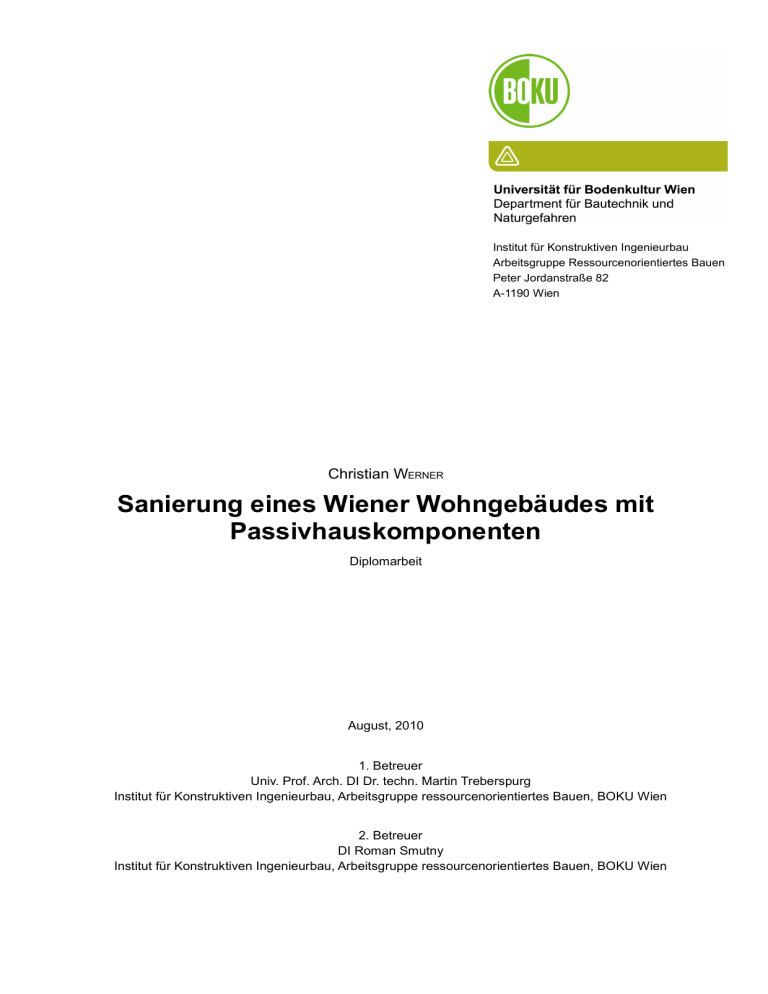 Institut für Konstruktiven Ingenieurbau Arbeitsgruppe Ressourcenorientiertes Bauen Peter Jordanstraße 82 A-1190 Wien Christian WERNER Sanierung eines Wiener Wohngebäudes mit Passivhauskomponenten Diplomarbeit August, 2010 1. Betreuer Univ. Prof. Arch. DI Dr. techn. Martin Treberspurg Institut für Konstruktiven Ingenieurbau, Arbeitsgruppe ressourcenorientiertes Bauen, BOKU Wien 2. Betreuer DI Roman Smutny Institut für Konstruktiven Ingenieurbau, Arbeitsgruppe ressourcenorientiertes Bauen, BOKU Wien PER ASPERA AD ASTRA Danksagung Aufrichtiger Dank gilt vor allem meinen Eltern, die mich lange Zeit unterstützt haben. Ein herzliches Dankeschön gebührt auch dem Architekten Friedrich Mühling und dem Bauphysiker Wilhelm Hofbauer, welche mir bei der Ausarbeitung der Hochbaudetails für die thermische Gebäudehülle des Wohngebäudes in der Wiener Hütteldorfer Straße 252 zur Hand gingen. I Inhaltsverzeichnis 1 Einleitung..........................................................................................................................................................1 1.1 Persönliche Motivation.............................................................................................................................1 1.2 Fachliche Motivation................................................................................................................................1 2 Ziel, Fragestellungen und Arbeitsmethoden....................................................................................................3 2.1 Ziel............................................................................................................................................................3 2.2 Fragestellungen.......................................................................................................................................3 2.3 Arbeitsmethoden......................................................................................................................................4 2.3.1 Bestandsaufnahme..........................................................................................................................4 2.3.2 Erstellung der Energieausweise für den Bestand............................................................................4 2.3.3 Zubau eines Dachgeschoßes..........................................................................................................5 2.3.4 Erstellung der Energieausweise für die Sanierungsvarianten.........................................................5 2.3.5 Gebäudeschnitt und Hochbaudetails...............................................................................................5 2.3.6 Computerprogramm ArchiPHYSIK der Softwarefirma A-Null..........................................................5 3 Rechtliche und normative Rahmenbedingungen.............................................................................................7 3.1 Richtlinie 2002/91/EG über die Gesamtenergieeffizienz von Gebäuden................................................7 3.2 Energieausweis-Vorlage-Gesetz (EAVG)................................................................................................7 3.3 Wiener Wohnbauförderungs- und Wohnhaussanierungsgesetz (WWFSG 1989)................................10 3.3.1 Allgemeine Bestimmungen - Begriffsbestimmungen.....................................................................10 3.3.2 Thermisch-energetische und bauökologische Mindestanforderungen..........................................11 3.3.3 Umfassende thermisch-energetische Sanierung...........................................................................12 3.4 ÖNORM B 8110 Teil 1............................................................................................................................14 3.5 OIB-Richtlinie 6......................................................................................................................................15 4 Sanierungsmaßnahmen und ausgeführte Beispiele......................................................................................17 4.1 Altbaumodernisierung und energetische Sanierung..............................................................................17 4.2 Möglichkeiten der energetischen Sanierung von Gebäuden.................................................................17 4.2.1 Verbesserung der Wärmedämmung..............................................................................................17 4.2.1.1 Wärmedämm-Verbundsysteme.............................................................................................17 4.2.1.2 Innendämmung......................................................................................................................18 4.2.2 Fenstersanierung...........................................................................................................................19 4.2.3 Zubau von Pufferräumen und Wintergärten..................................................................................20 4.2.4 Modernisierung der Haustechnik...................................................................................................21 4.2.4.1 Wärmeerzeugung..................................................................................................................21 4.2.4.2 Solarthermische Anlagen.......................................................................................................21 II 4.3 Ausgeführte Beispiele............................................................................................................................21 4.3.1 Wohnhaussanierung auf Passivhausstandard, Makartstraße 30, 32 und 34, Linz.......................22 4.3.2 Wohnhaussanierung auf Niedrigenergiehausstandard, Pötzleinsdorfer Straße 21 und 23, Wien 18..............................................................................................................................................