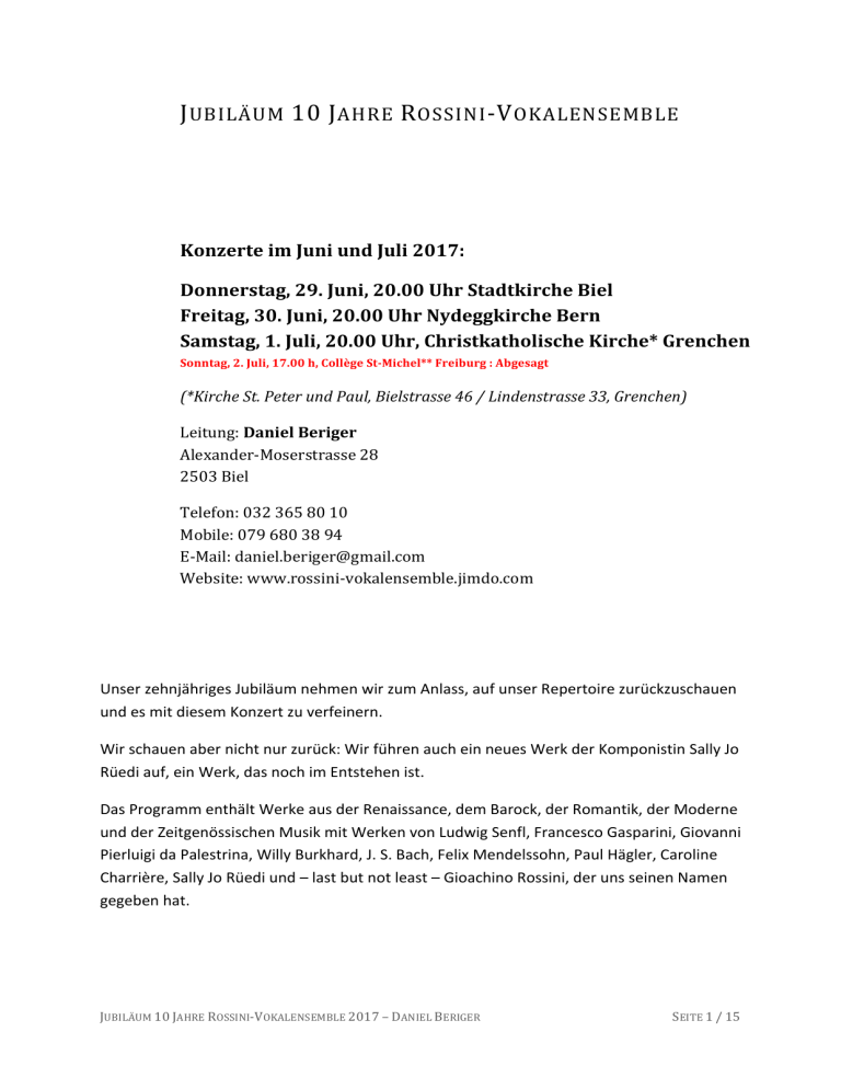 J UBILÄUM 10 J AHRE R OSSINI -­‐V OKALENSEMBLE Konzerte im Juni und Juli 2017: Donnerstag, 29. Juni, 20.00 Uhr Stadtkirche Biel Freitag, 30. Juni, 20.00 Uhr Nydeggkirche Bern Samstag, 1. Juli, 20.00 Uhr, Christkatholische Kirche* Grenchen Sonntag, 2. Juli, 17.00 h, Collège St-­‐Michel** Freiburg : Abgesagt (*Kirche St. Peter und Paul, Bielstrasse 46 / Lindenstrasse 33, Grenchen) Leitung: Daniel Beriger Alexander-­‐Moserstrasse 28 2503 Biel Telefon: 032 365 80 10 Mobile: 079 680 38 94 E-­‐Mail: [email protected] Website: www.rossini-­‐vokalensemble.jimdo.com Unser zehnjähriges Jubiläum nehmen wir zum Anlass, auf unser Repertoire zurückzuschauen und es mit diesem Konzert zu verfeinern. Wir schauen aber nicht nur zurück: Wir führen auch ein neues Werk der Komponistin Sally Jo Rüedi auf, ein Werk, das noch im Entstehen ist. Das Programm enthält Werke aus der Renaissance, dem Barock, der Romantik, der Moderne und der Zeitgenössischen Musik mit Werken von Ludwig Senfl, Francesco Gasparini, Giovanni Pierluigi da Palestrina, Willy Burkhard, J. S. Bach, Felix Mendelssohn, Paul Hägler, Caroline Charrière, Sally Jo Rüedi und – last but not least – Gioachino Rossini, der uns seinen Namen gegeben hat. JUBILÄUM 10 JAHRE ROSSINI-­‐VOKALENSEMBLE 2017 – DANIEL BERIGER SEITE 1 / 15 P ROGRAMM UND K OMMENTARE V O N D A N I E L B E R I G E R , W O N I C H T A N D E R S V E R M E R K T L U D W IG S E N F L (1486 – 1543) Lieder aus J. Otts Liederbuch: Zwischen Berg und tiefem Tal, Die Brünnlein die da fliessen Paul Sacher, der grosse Förderer der Modernen Musik, bezeichnete Ludwig Senfl als den grössten Schweizer Komponisten. In der Tat war der in Zürich oder Basel geborene und in Deutschland wirkende Komponist zu Lebzeiten in ganz Europa bekannt. Er galt als wichtigster Vertreter des deutschen Lieds in der Reformationszeit. Der grosse Meister der Polyphonie hatte die Gabe, mit einigen wenigen Noten neue Klangwelten zu erschaffen. Er schuf über dreihundert Lieder, die z.T. schon zu seinen Lebzeiten gedruckt wurden. Warum sind heute nur einige wenige von Ludwig Senfls Liedern bekannt? Ein Grund mag in den Texten liegen, von denen viele moralisierend sind. Die eheliche Treue spielt eine zuweilen etwas zu dominante Rolle. Wir haben für unser Programm Lieder gewählt, die ein heutiges Publikum ansprechen können. Sie dürfen, wie viele der Madrigale aus England und Italien, mit einem Augenzwinkern verstanden werden. Zu den Liedern: Die meisten Lieder basieren auf bekannten Melodien, die von den anderen Stimmen umspielt werden. Diese «cantus firmi» (vergleichbar mit den Standards im Jazz) liegen, wie vom Mittelalter bis zur Renaissance üblich, in Tenor. Häufig imitiert der Bass die Tenorstimme, während die hohen Stimmen die am kunstvollsten ausgeführten sind. Zwischen Berg und tiefem Tal Zwischen Berg und tiefem Tal, Da liegt ein freie Strass; Wer seinen Buhlen nit halten mag, Der muss ihn fahren lassen. Fahr hin, fahr hin, du hast die Wahl, Du kannst mich wohl verlassen. Im Jahr sind noch viel langer Tag, Glück ist in allen Gassen. Die wunderschönen Oberstimmen zeichnen die Konturen der Landschaft. Die tieferen Stimmen imitieren sich anmutig in einem freien Kanon, der ein Gefühl des Fortschreitens erzeugt. Aus heutiger Sicht scheint der Text die Freiheit und das Loslassen zu thematisieren. JUBILÄUM 10 JAHRE ROSSINI-­‐VOKALENSEMBLE 2017 – DANIEL BERIGER SEITE 2 / 15 Die Brünnlein, die da fliessen Die Brünnlein, die da fliessen, die soll man trinken und der ein‘n stäten Buehlen hat, der soll ihm winken, ja winken mit den Augen und treten auf den Fuess. Es ist ein herter Orden, der seinen Buelen meiden muess. Dieses Volkslied ist bei uns mit einer anderen Melodie bekannt. Hier wird «winken mit den Augen» gefeiert, und während die Altos am Schluss noch ihr hartes Los besingen, geben sich die anderen Stimmen offenbar schon den Vergnügungen hin. F R A N C E S C O G A S P A R IN I (1668 – 1727) Kyrie aus «Missa Canonica» Für uns war es ein Glücksfall, dass eines unserer Chormitglieder in Leipzig von diesem Werk noch vor dessen Veröffentlichung erfuhr. Der Leipziger Bach-­‐Forscher PD Dr. Peter Wollny stellte uns die von ihm entdeckte und edierte Bach-­‐Handschrift freundlicherweise zur Verfügung. Das Rossini-­‐Vokalensemble führte sie 2015 in drei Konzerten auf. Von Peter Wollny: Francesco Gasparini wirkte als Komponist und Pädagoge in Rom, Bologna und Venedig und schuf zahlreiche von seinen Zeitgenossen hoch geschätzte Opern, Kammerkantaten und Kirchenstücke. Als eines seiner berühmtesten Werke gilt die 1705 in Venedig entstandene «Missa canonica» für vierstimmigen Chor und Basso continuo. Sämtliche Sätze der Messe enthalten kunstvolle Kanons und bezeugen die überragende satztechnische Meisterschaft des Komponisten. Pressemitteilung des Bach-­‐Archivs Leipzig vom 6. Juni 2013: Unbekannte Handschrift Johann Sebastian Bachs entdeckt Der Leipziger Bach-­‐Forscher PD Dr. Peter Wollny hat im Schütz-­‐ Haus Weißenfels eine bisher unbekannte Handschrift von Johann Sebastian Bach (1685–1750) entdeckt. JUBILÄUM 10 JAHRE ROSSINI-­‐VOKALENSEMBLE 2017 – DANIEL BERIGER SEITE 3 / 15 Die um 1740 entstandene Abschrift einer Messe des italienischen Komponisten Francesco Gasparini (1661–1727) bietet wesentliche Einblicke in Bachs Beschäftigung mit dem sogenannten stile antico und hilft, die stilistische Neuorientierung seines Schaffens in seinem letzten Lebensjahrzehnt zu verstehen. Die Quelle enthält eindeutige Indizien dafür, dass Bach Gasparinis Werk ausgiebig studiert und wiederholt in den beiden Leipziger Hauptkirchen St. Thomas und St. Nikolai aufgeführt hat. Von diesem Werk ist nun in Weißenfels eine Abschrift von der Hand Johann Sebastian Bachs aufgetaucht. Bach verwendete für seine Abschrift das gleiche Papier wie für den zweiten Teil des Wohltemperierten Klaviers. Dieser Befund sowie spezifische schriftk