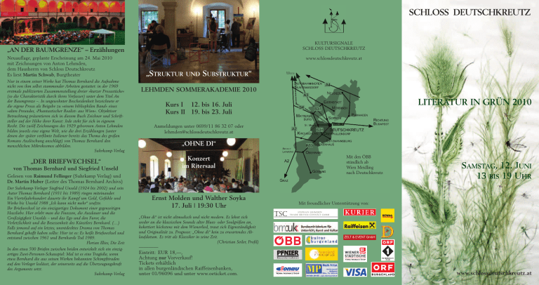 SCHLOSS DEUTSCHKREUTZ KULTURSIGNALE SCHLOSS DEUTSCHKREUTZ „AN DER BAUMGRENZE“ – Erzählungen Neuauflage, geplante Erscheinung am 24. Mai 2010 mit Zeichnungen von Anton Lehmden, dem Hausherrn von Schloss Deutschkreutz Es liest Martin Schwab, Burgtheater Nur in einem seiner Werke hat Thomas Bernhard die Aufnahme nicht von ihm selbst stammender Arbeiten gestattet: in der 1969 erstmals publizierten Zusammenstellung dreier »kurzer Prosastücke« (so die Charakteristik durch ihren Verfasser) unter dem Titel An der Baumgrenze –. In ungewohnter Bescheidenheit bezeichnete er die eigene Prosa als Beigabe zu »einem bibliophilen Band« eines »alten Freundes, ›Phantastischer Realist‹ aus Wien«. Objektiver Betrachtung präsentieren sich in diesem Buch Zeichner und Schriftsteller auf der Höhe ihrer Kunst: Jede steht für sich in eigenem Recht. Die zwölf Zeichnungen des 1929 geborenen Anton Lehmden bilden jeweils eine eigene Welt, wie die drei Erzählungen (unter denen der später verfilmte Italiener bereits das Thema des großen Romans Auslöschung anschlägt) von Thomas Bernhard den menschlichen Mikrokosmos abbilden. Suhrkamp-Verlag „DER BRIEFWECHSEL“ von Thomas Bernhard und Siegfried Unseld www.schlossdeutschkreutz.at „STRUKTUR UND SUBSTRUKTUR“ LEHMDEN SOMMERAKADEMIE 2010 LITERATUR IN GRÜN 2010 Kurs I 12. bis 16. Juli Kurs II 19. bis 23. Juli Anmeldungen unter 0699/11 86 32 07 oder [email protected] „OHNE DI“ Mit den ÖBB stündlich ab Wien Meidling nach Deutschkreutz Konzert im Ritersaal Gelesen von Raimund Fellinger (Suhrkamp Verlag) und Dr. Martin Huber (Leiter des Thomas Bernhard Archivs) Der Suhrkamp-Verleger Siegfried Unseld (1924 bis 2002) und sein Autor Thomas Bernhard (1931 bis 1989) ringen miteinander. Ein Vierteljahrhundert dauerte ihr Kampf um Geld, Gefühle und Werke bis Unseld 1988 „Ich kann nicht mehr“ seufzte. Ihr Briefwechsel ist ein einzigartiges Dokument einer gegenseitigen Hassliebe. Hier erlebt man die Finessen, die Ausdauer und die Großzügigkeit Unselds – und das Ego und den Furor, die Verletzlichkeit und die Besessenheit des Künstlers Bernhard. (…) Falls jemand auf ein letztes, unentdecktes Drama von Thomas Bernhard gehofft haben sollte: Hier ist es: Es heißt Briefwechsel und entstand zwischen 1961 und Bernhards Tod 1989. Florian Illies, Die Zeit „Ohne di“ ist nicht altmodisch und nicht modern. Es lehnt sich weder an die klassischen Sounds alter Blues- oder Soulgrößen an, kokettiert höchstens mit dem Wienerlied, traut sich Eigenständigkeit und Originalität zu. Prognose: „Ohne di“ kein zu erwartendes Ablaufdatum. Es tritt als Klassiker in seine Zeit. (Christian Seiler, Profil) In den etwa 500 Briefen zwischen beiden entwickelt sich ein einzigartiges Zwei-Personen-Schauspiel: Mal ist es eine Tragödie, wenn etwa Bernhard die aus seinen Werken bekannten Schimpftiraden auf den Verleger loslässt, der seinerseits auf die Überzeugungskraft des Arguments setzt. Suhrkamp-Verlag ———— Eintritt: EUR 18,—, Achtung nur Vorverkauf! Tickets erhältlich in allen burgenländischen Raiffeisenbanken, unter 01/96096 und unter www.oeticket.com. Ernst Molden und Walther Soyka 17. Juli | 19:30 Uhr SAMSTAG, 12. JUNI 13 BIS 19 UHR Mit freundlicher Unterstützung von: ZELT & EVENT GmbH www.schlossdeutschkreutz.at Heuer öffnet das Renaissanceschloss seine Pforten zum 7. Mal um der zeitgenössischen österreichischen Literatur eine angemessene Plattform zu bieten. Autoren 2010: Franzobel | Dine Petrik Sophie Reyer | Franz Schuh | Katharina Tiwald Raimund Fellinger (Suhrkamp Verlag) und Dr. Martin Huber (Thomas Bernhard Archiv) lesen aus „DER BRIEFWECHSEL“ von Thomas Bernhard & Siegfried Unseld Martin Schwab (Burgtheater) liest aus den neuaufgelegten Erzählungen „AN DER BAUMGRENZE“ von Thomas Bernhard, geplante Erscheinung Mai 2010 wie im Original mit Zeichnungen von Anton Lehmden Der Ablauf der Lesungen wird moderiert von Gabriele Madeja ———— Infopoint: Bücher Hikade (Wiener Neustadt) mit Büchertisch – die Autoren signieren Vorort Gastronomie: Tapas und mehr … „La Casita“ – spanisches Restaurant (Walbersdorf) Weine: Vitikult ———— Eintritt: EUR 13,—, Studenten EUR 9,— Eintrittsermäßigungen: 10 % für Mitglieder KURIER-Club und VISA-Karteninhaber 20 % für Raiffeisen-Clubmitglieder, Ö1-Clubmitglieder, Freunde des Vereins „Kultursignale Schloss Deutschkreutz“, ÖBB Vorteilscard-Inhaber oder bei Vorlage eines „Einfach-Raus-Ticket“ und Cotisants AAELFV Riesiges Lesezelt im Schlosshof – Veranstaltung bei jedem Wetter! Impressum: Für den Inhalt verantwortlich: Kultursignale Schloss Deutschkreutz – Barbara Lehmden, vorbehaltlich Satz- und Druckfehler. Titelbild: Anton Lehmden. Design/Ausführung: WMagDesign | Mag. Wilhelm Jakubovic | 7442 Lockenhaus Foto: ©Corn Samstag, 12. Juni 2009 | 13–19 Uhr Foto: ©Hanna Silbermayr LITERATUR IN GRÜN 2010 Franzobel Franz Schuh Sophie Anna Reyer geboren 1967 in Vöcklabruck, ist einer der populärsten und polarisierendsten österreichischen Schriftsteller. Bei Zsolnay erschienen zuletzt die Romane Lusthaus oder Die Schule der Gemeinheit (2002), Das Fest der Steine oder Die Wunderkammer der Exzentrik (2005), Luna Park. Vergnügungsgedichte (2003), Liebesgeschichte (2007) und 2009 Österreich ist schön. Ein Märchen. Lebt heute als Schriftsteller und Theaterautor in Wien geboren 1947 in Wien, studierte Philosophie, Geschichte und Germanistik. 1976-80 Generalsekretär der Grazer Autorenversammlung. Bis 1993 Redakteur der Zeitschrift Wespennest. Er ist Lehrbeauftragter an der Universität für Angewandte Kunst in Wien und Kolumnist, u.a. für Die Zeit und Literaturen. geboren am 20.12.1984 in Wien. 2005: Erscheinung des Lyrikbandes „geh dichte“ (EYE-Verlag). Publikationen in Literaturzeitschriften und Anthologien. Literaturförderungspreis der Stadt Graz 2007. Erwerbung des Bakk. art. Titels in Komposition 2007. Studium szenische Schreiben bei uniT.